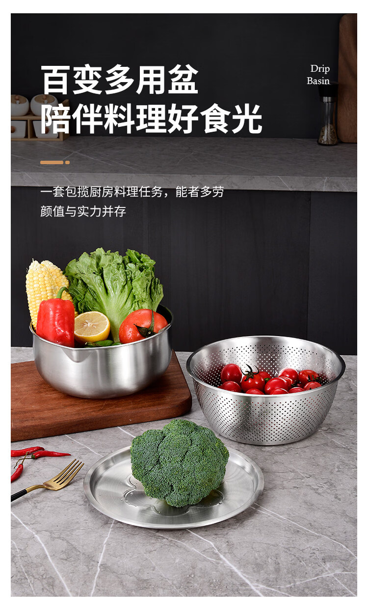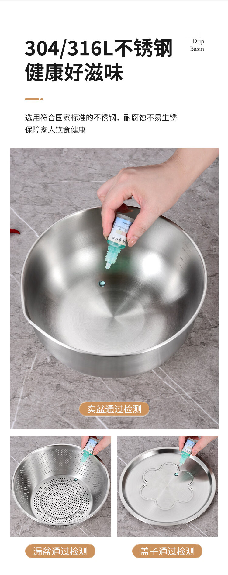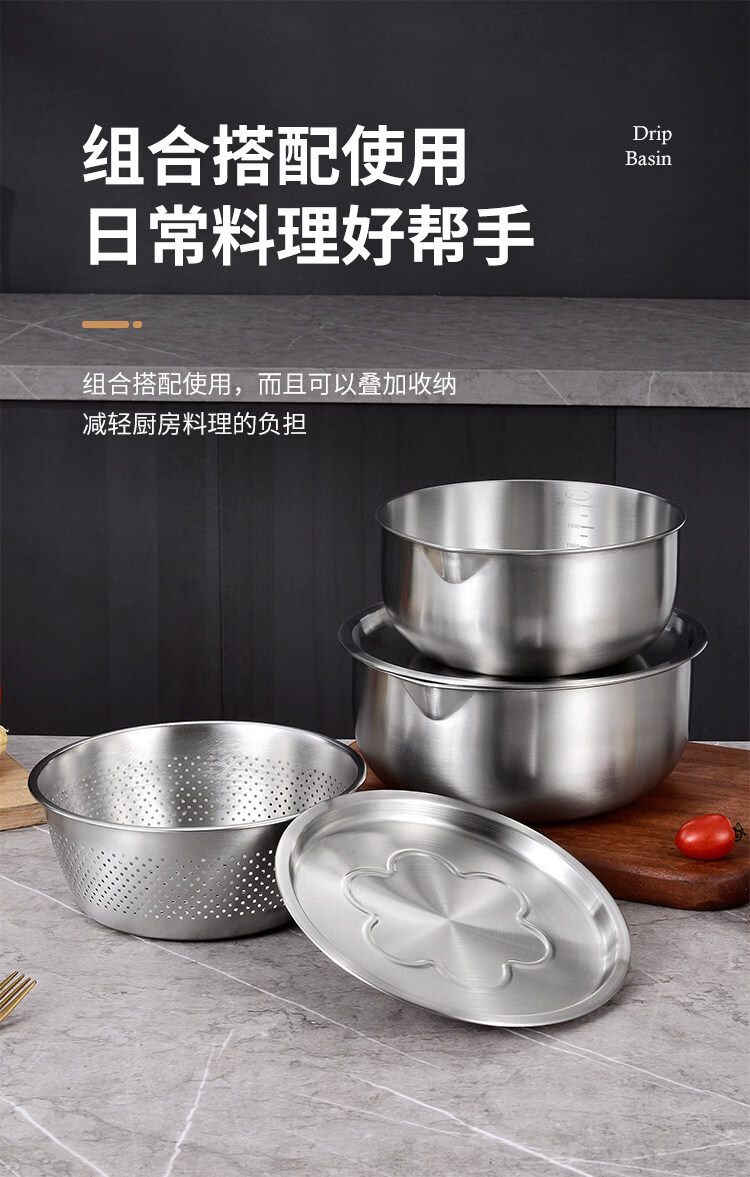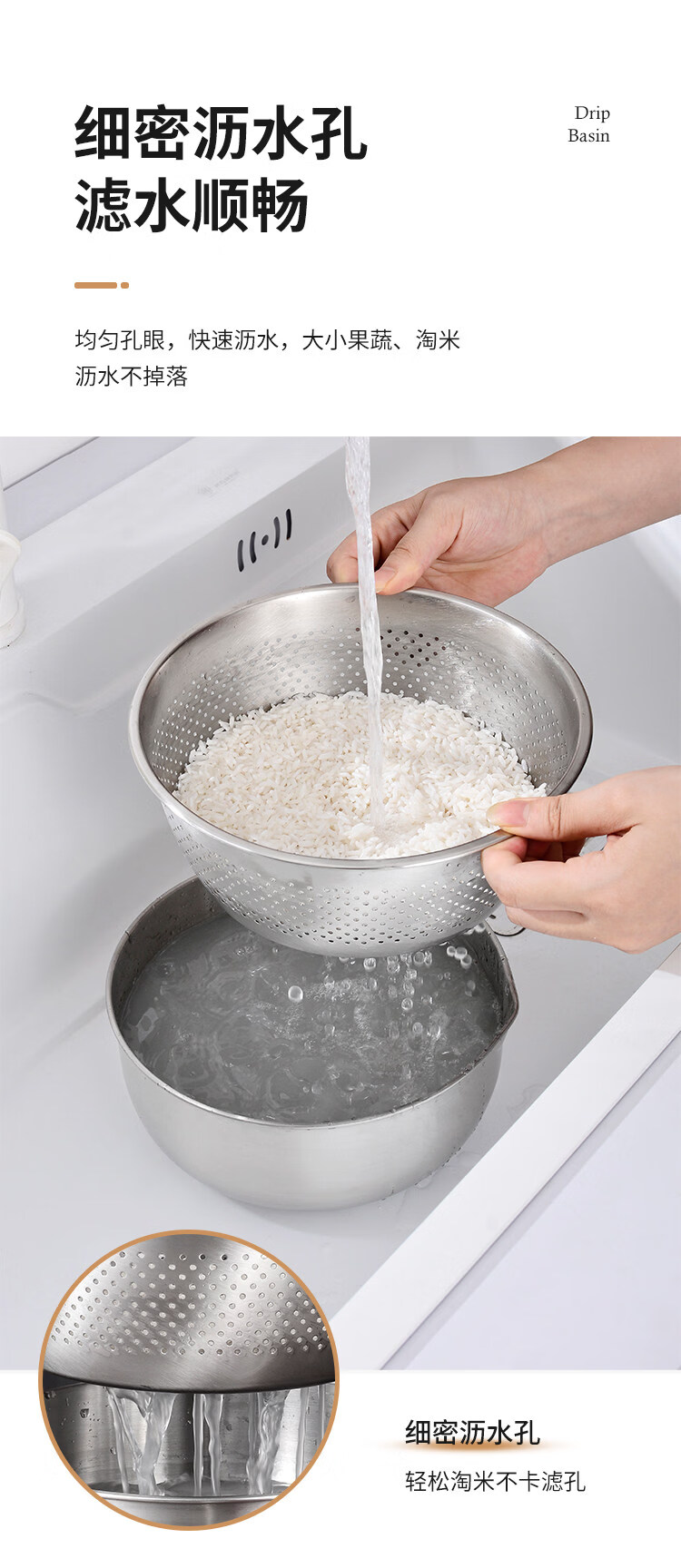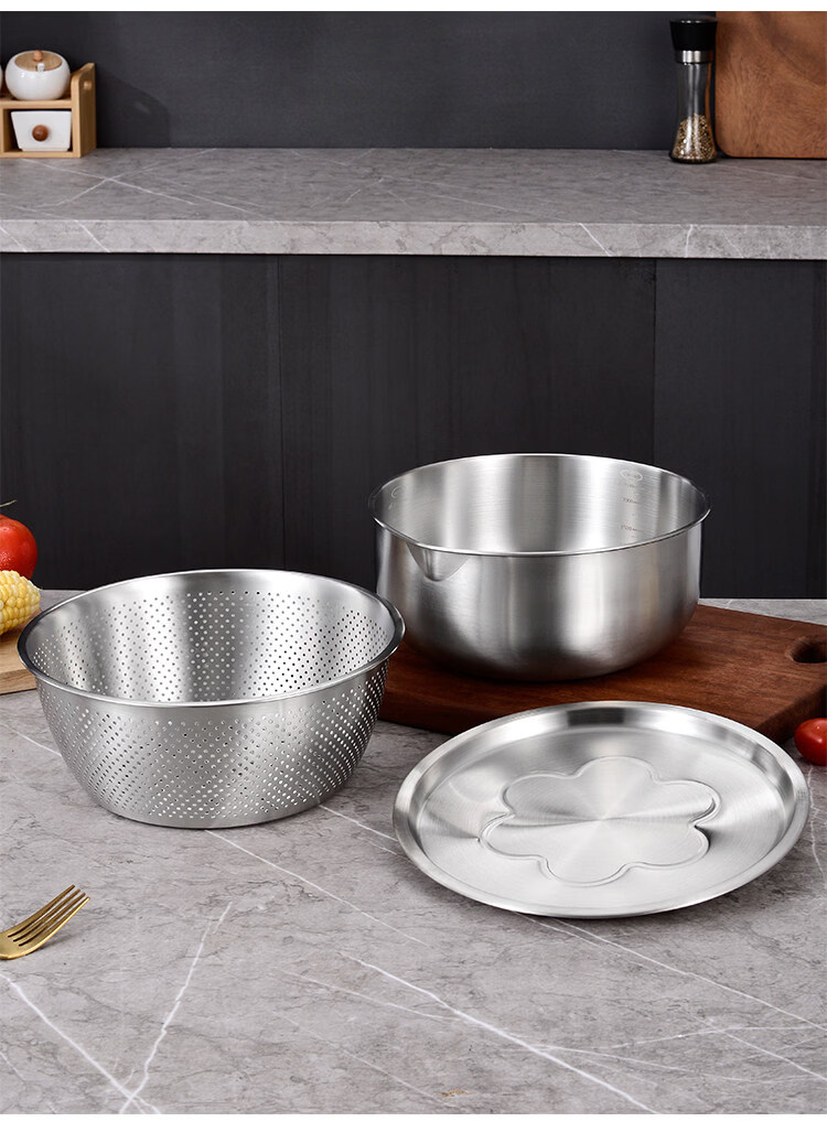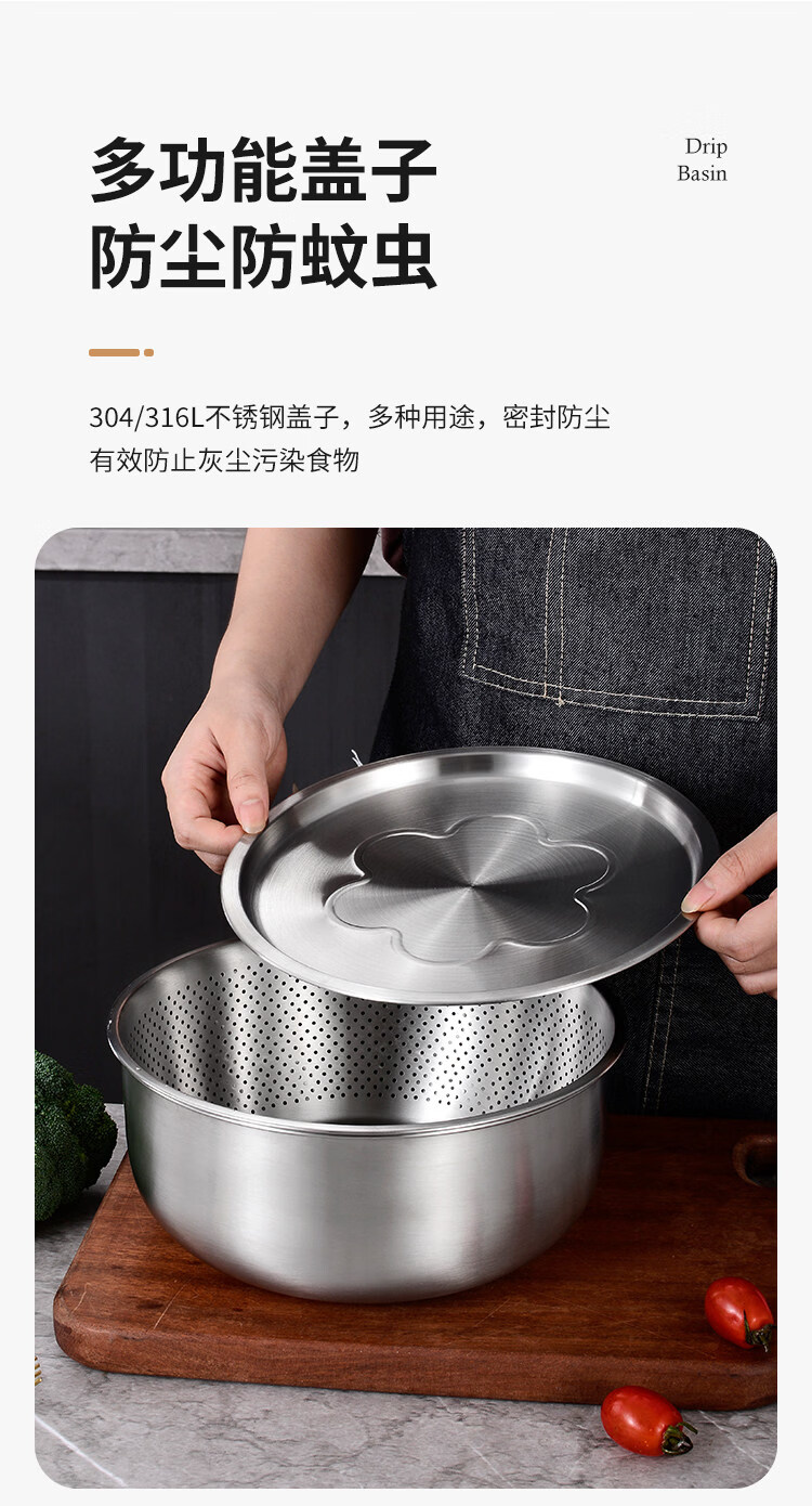 GUIG304 stainless steel drain basket, washing basin, rice washing machine, kitchen household new multi-functional thickened egg beating basin, rice washing machine, upgraded extra thick 18-10 stainless steel 22cm solid basin + leaky basin + lid