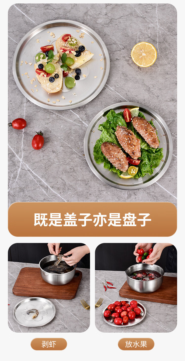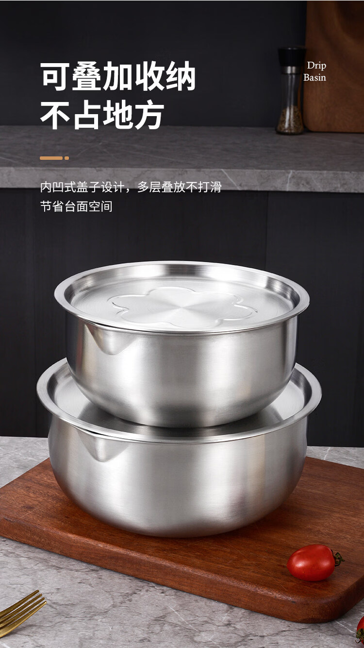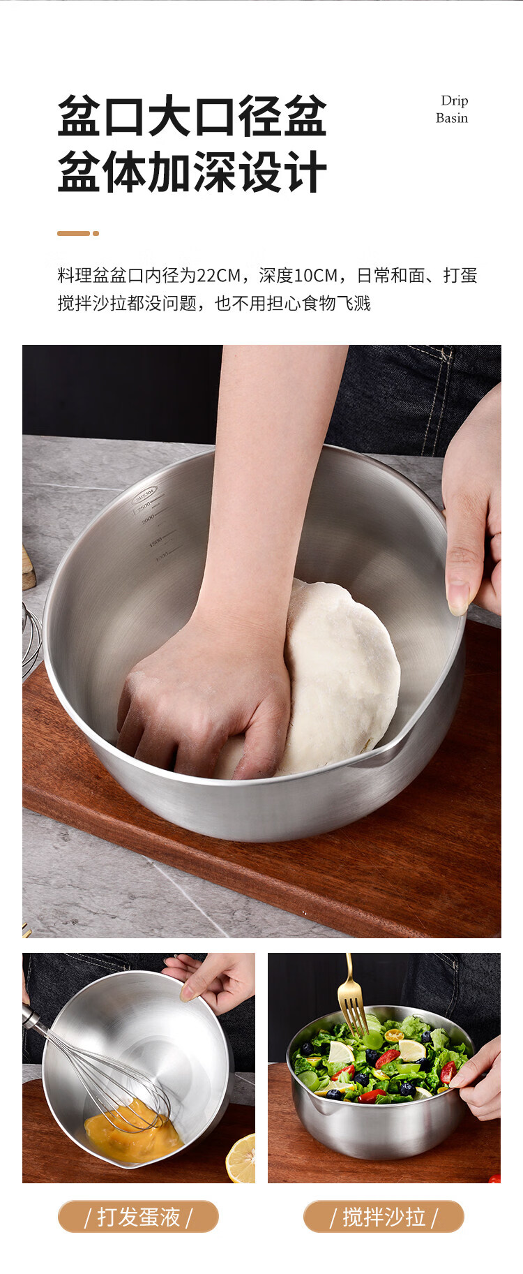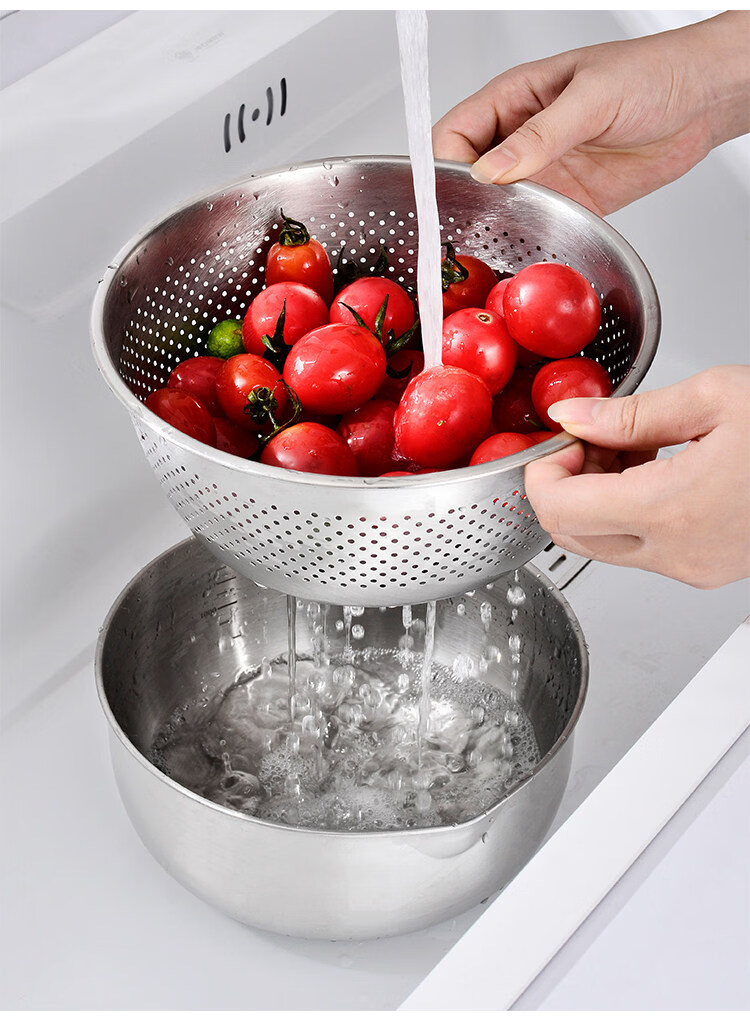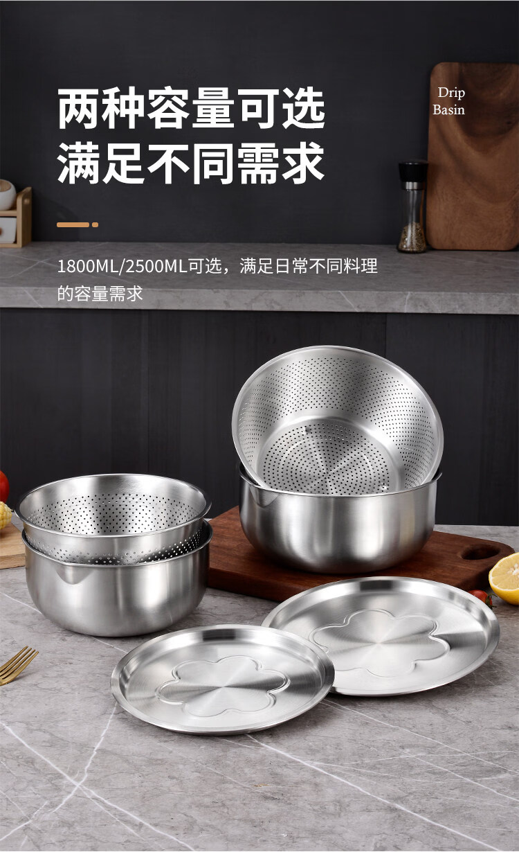 GUIG304 stainless steel drain basket, washing basin, rice washing machine, kitchen household new multi-functional thickened egg beating basin, rice washing machine, upgraded extra thick 18-10 stainless steel 22cm solid basin + leaky basin + lid