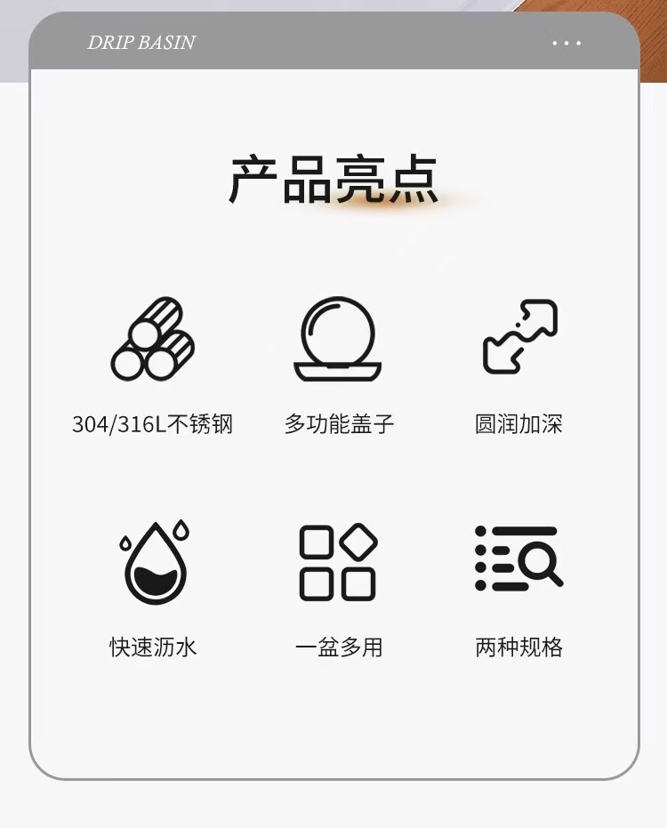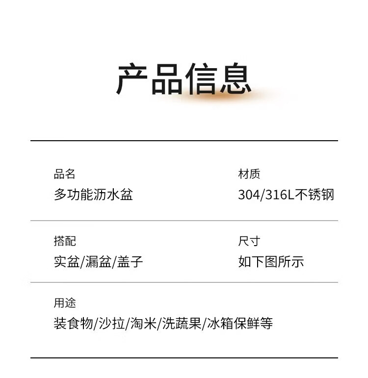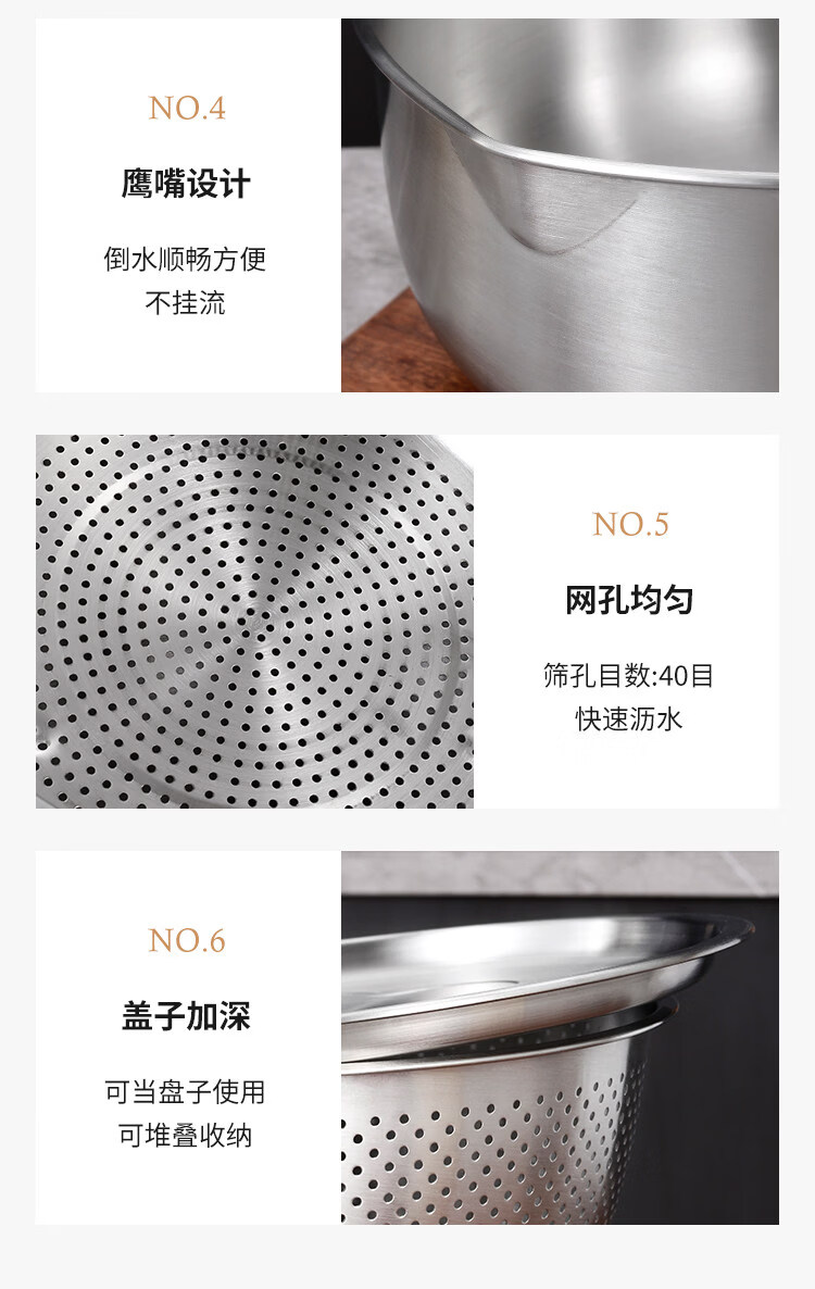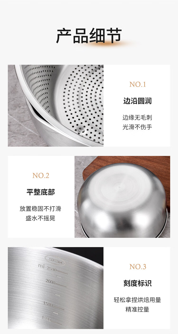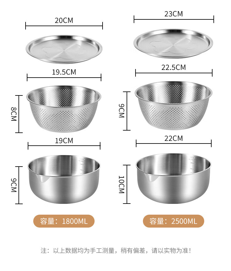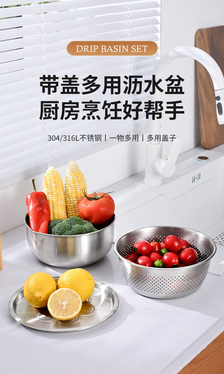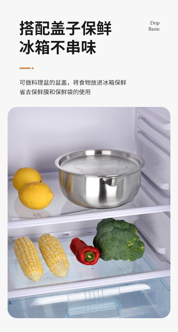GUIG304 stainless steel drain basket, washing basin, rice washing machine, kitchen household new multi-functional thickened egg beating basin, rice washing machine, upgraded extra thick 18-10 stainless steel 22cm solid basin + leaky basin + lid