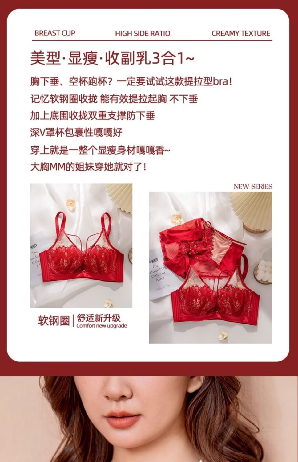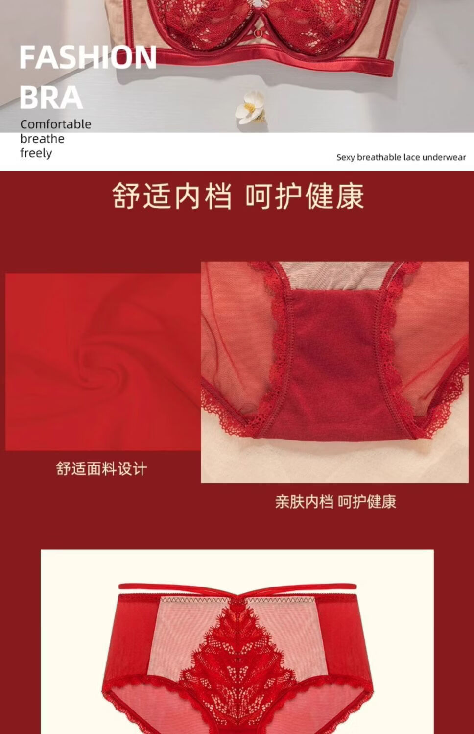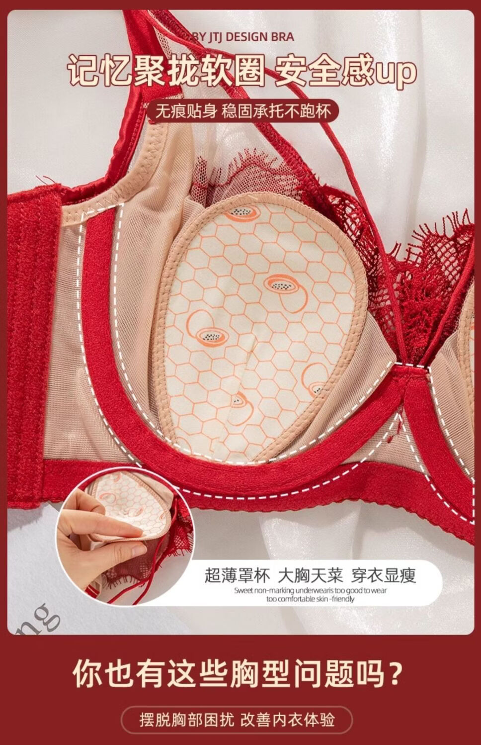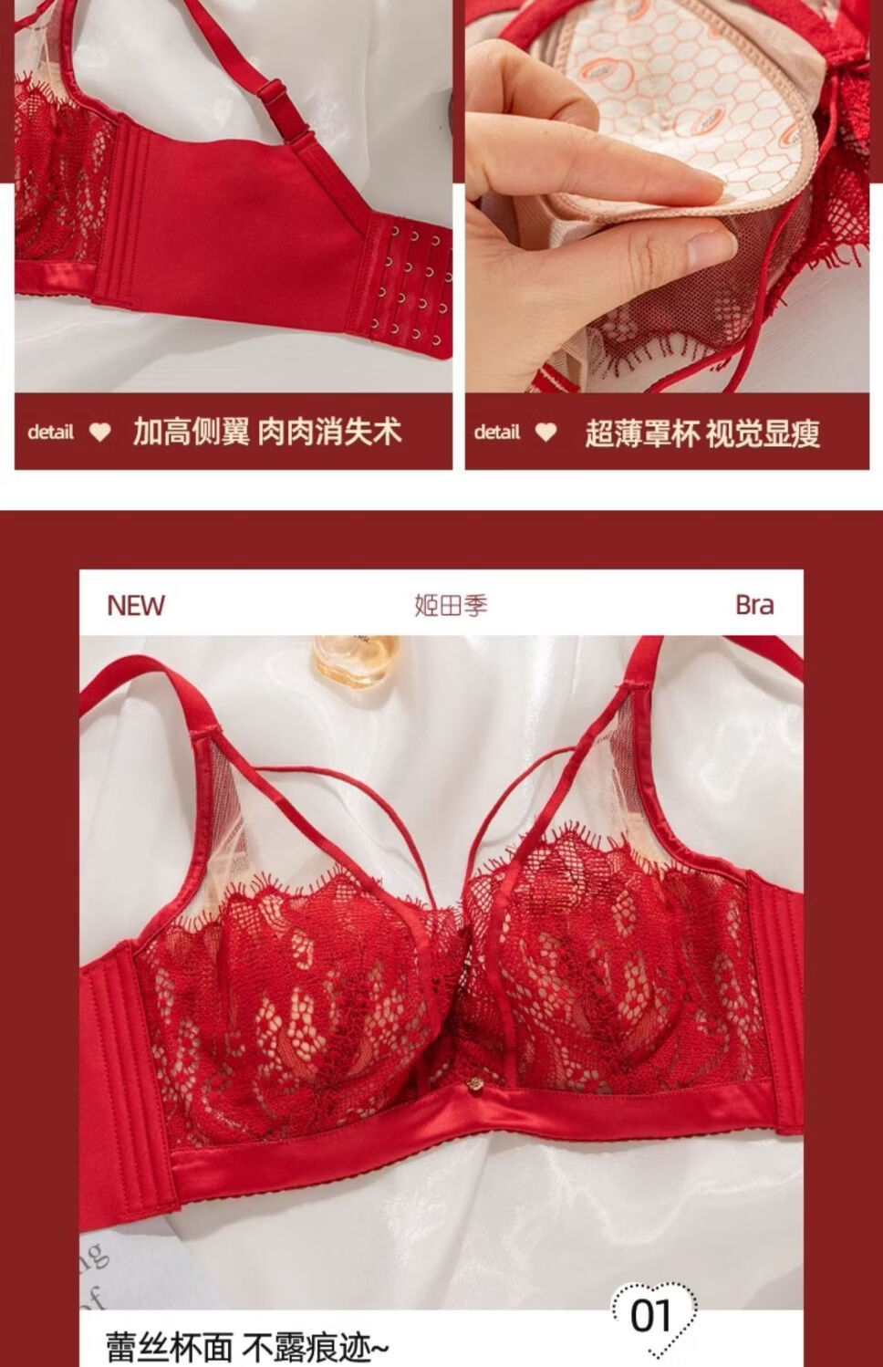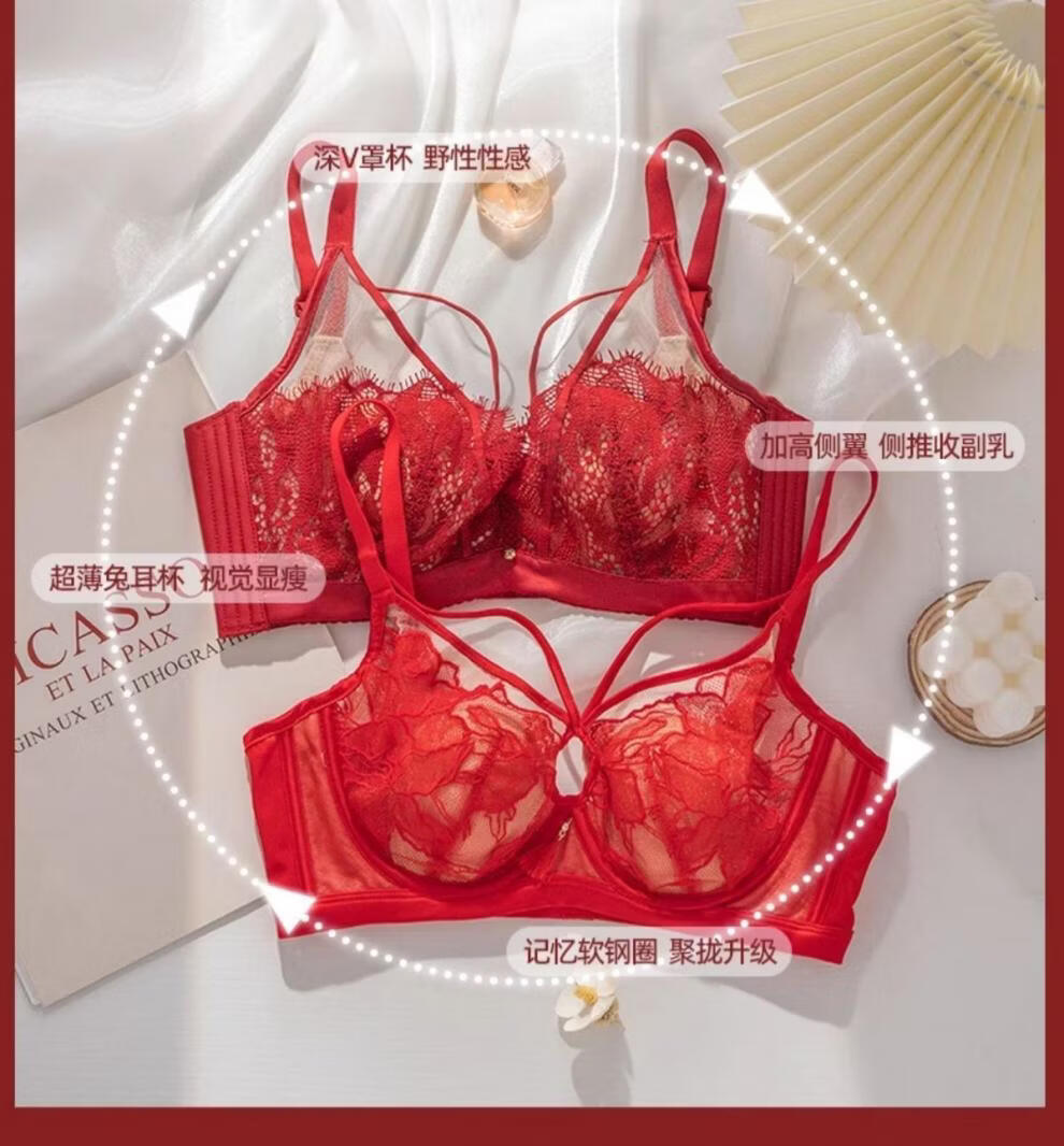 Modal Red Underwear Ladies Wedding Bride Big Breast Show Small Breast Sexy Lace Zodiac Year Bra Set Yellow Single/Piece 85B 38C