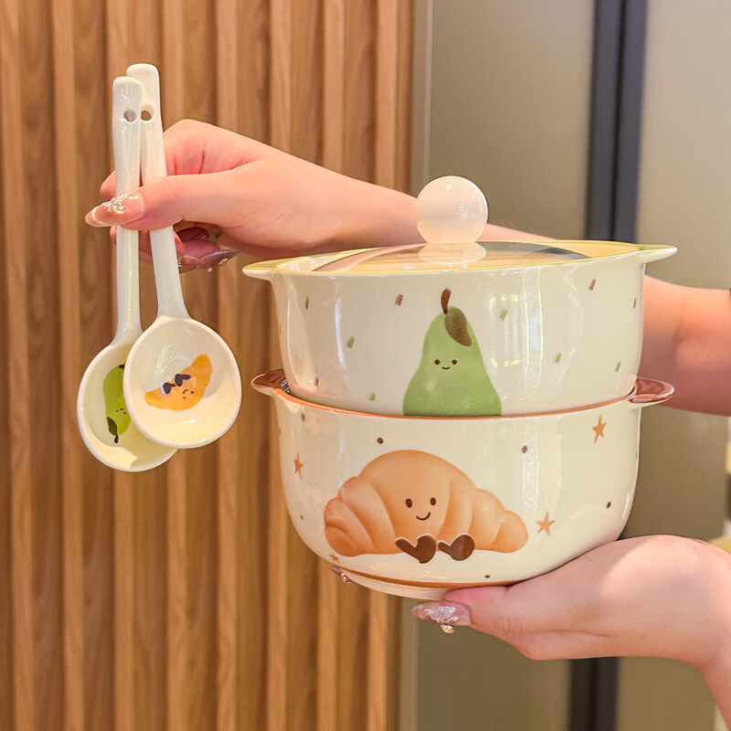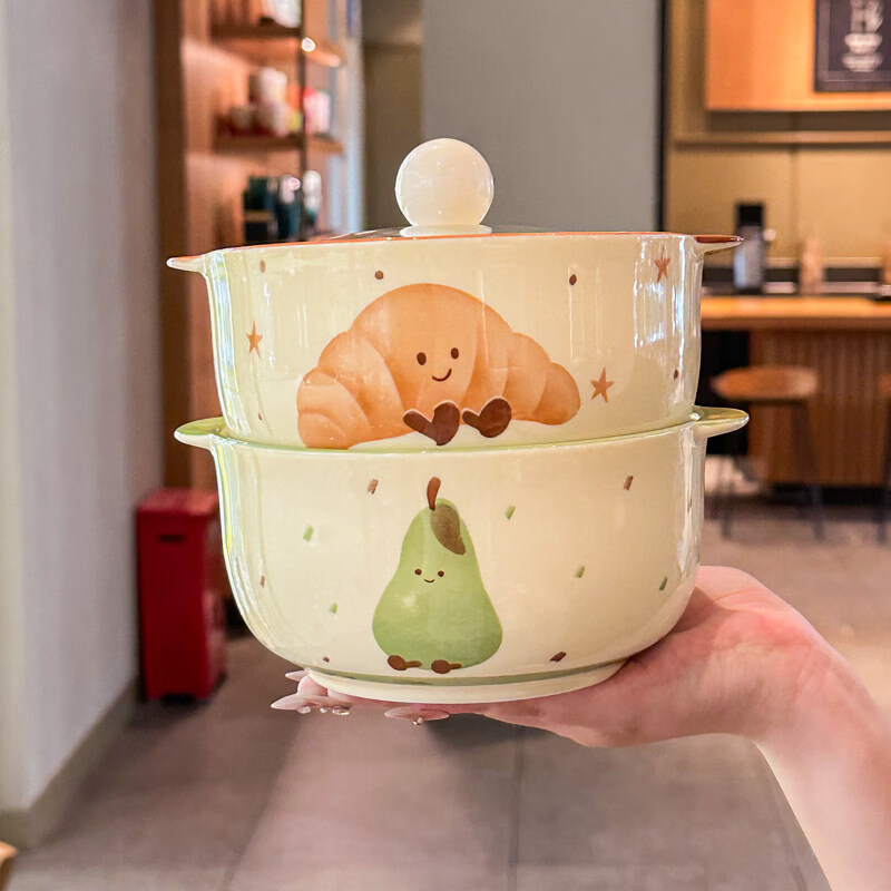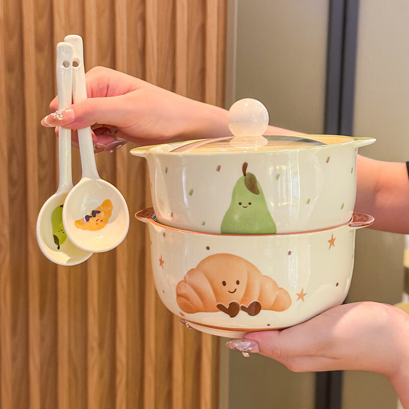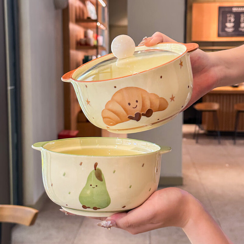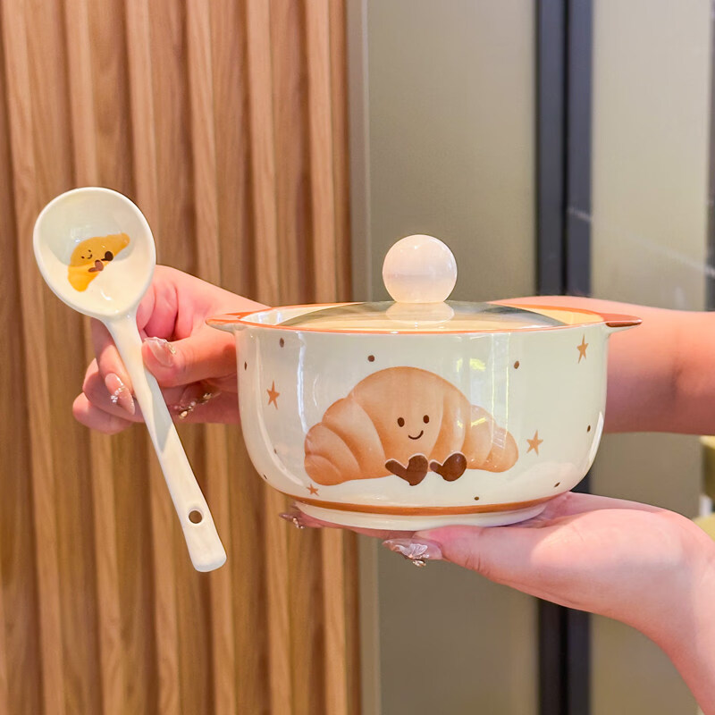 Shijanu new product ins high-looking Internet celebrity fruit croissant ceramic instant noodle bowl with lid double-ear soup bowl student dormitory 6.5-inch instant noodle bowl-brown croissant (without lid)
