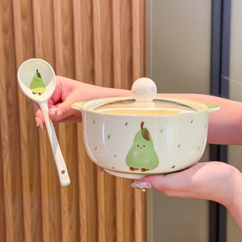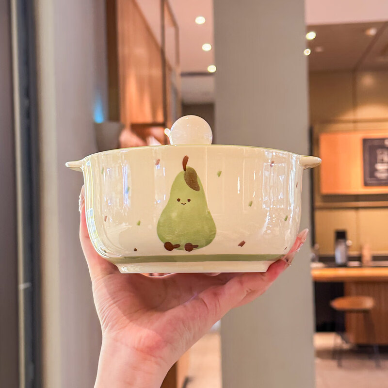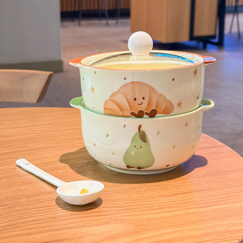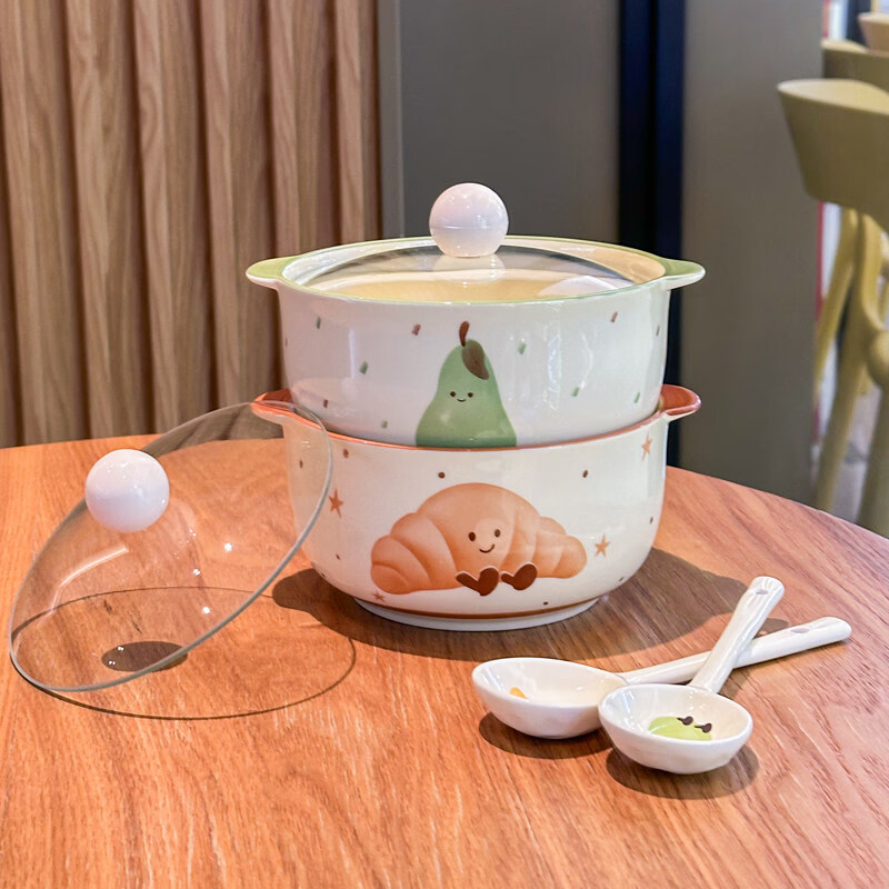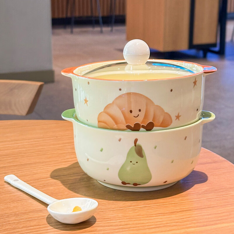 Shijanu new product ins high-looking Internet celebrity fruit croissant ceramic instant noodle bowl with lid double-ear soup bowl student dormitory 6.5-inch instant noodle bowl-brown croissant (without lid)