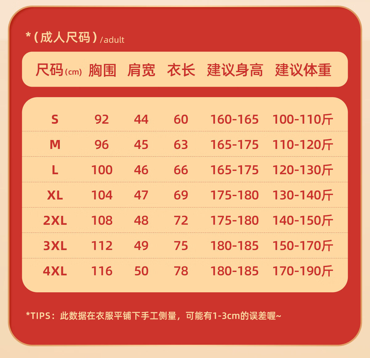 China (cm) 160-165/84-86 165-170 / 88-90 167-172 / 92-96 168-173 / 98-102 170-176 / 106-110