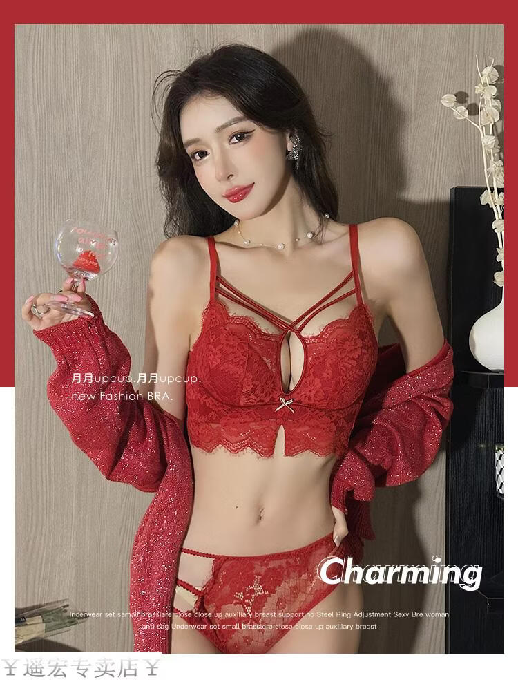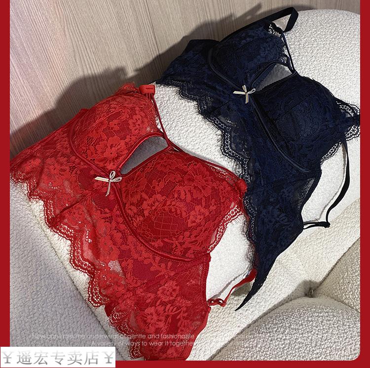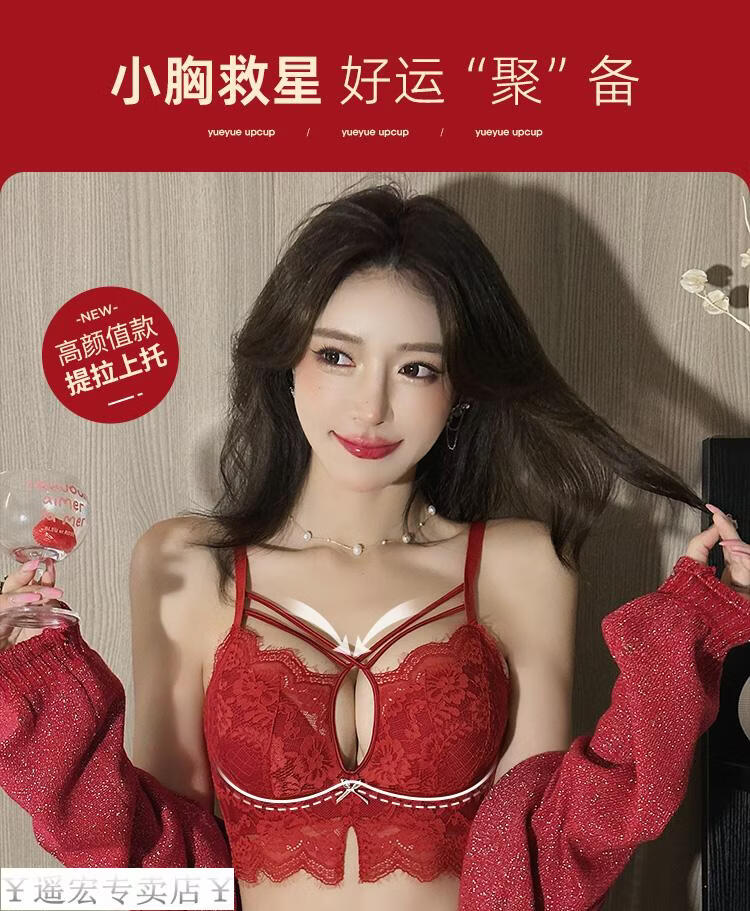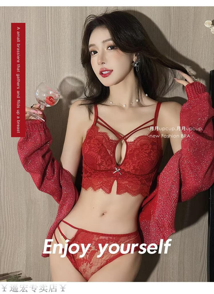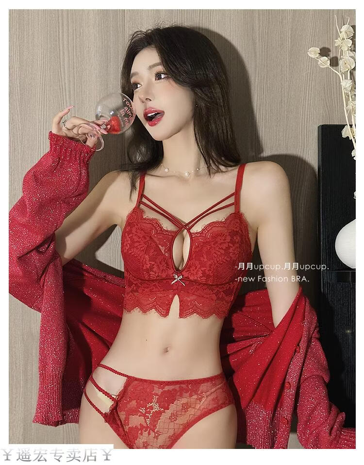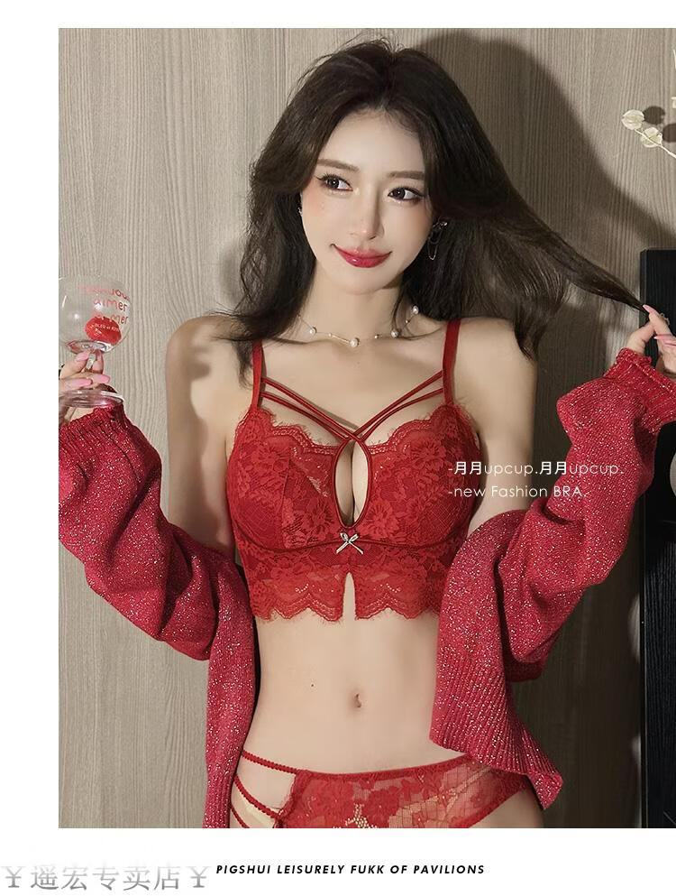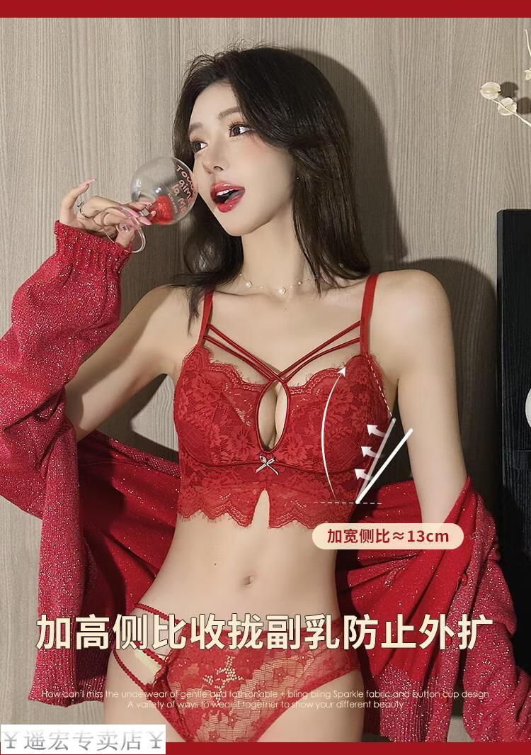 LangSha 2026 Horse Red Underwear Zodiac Year Suit Women's Small Breast Push Up Thickened Underwear Bra Wedding Bride Festive Red Set One Size 85/38B