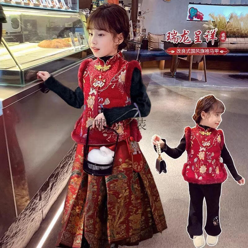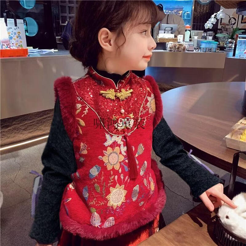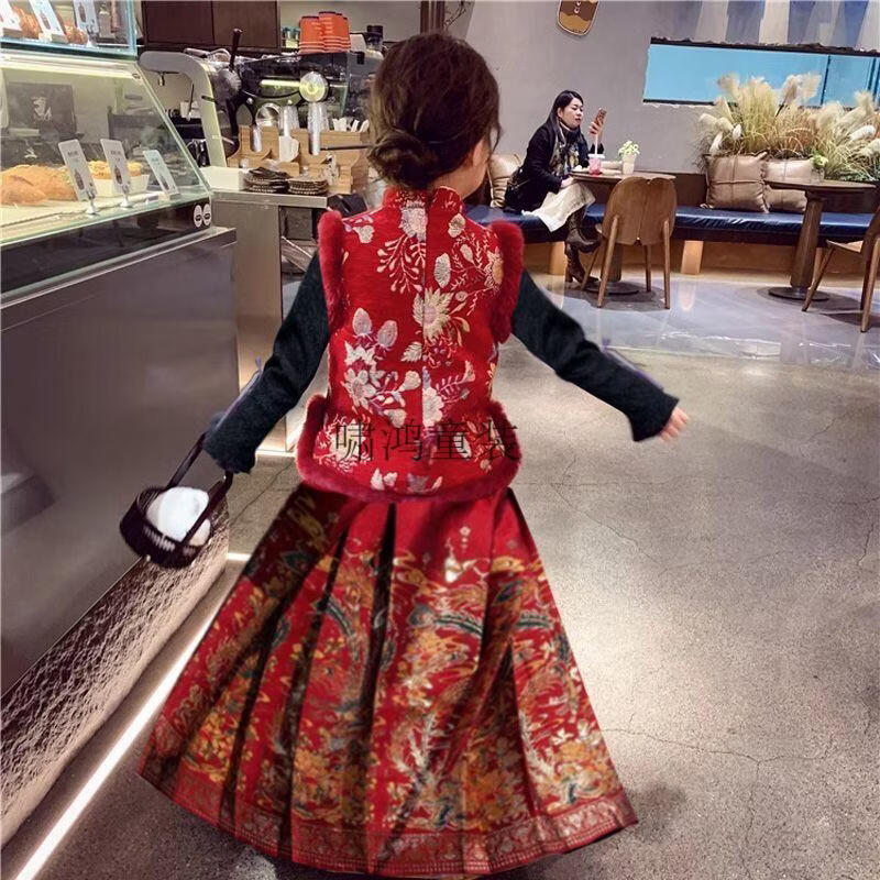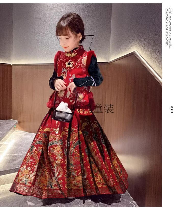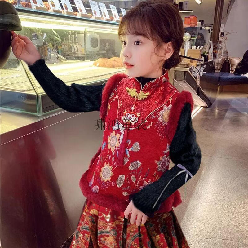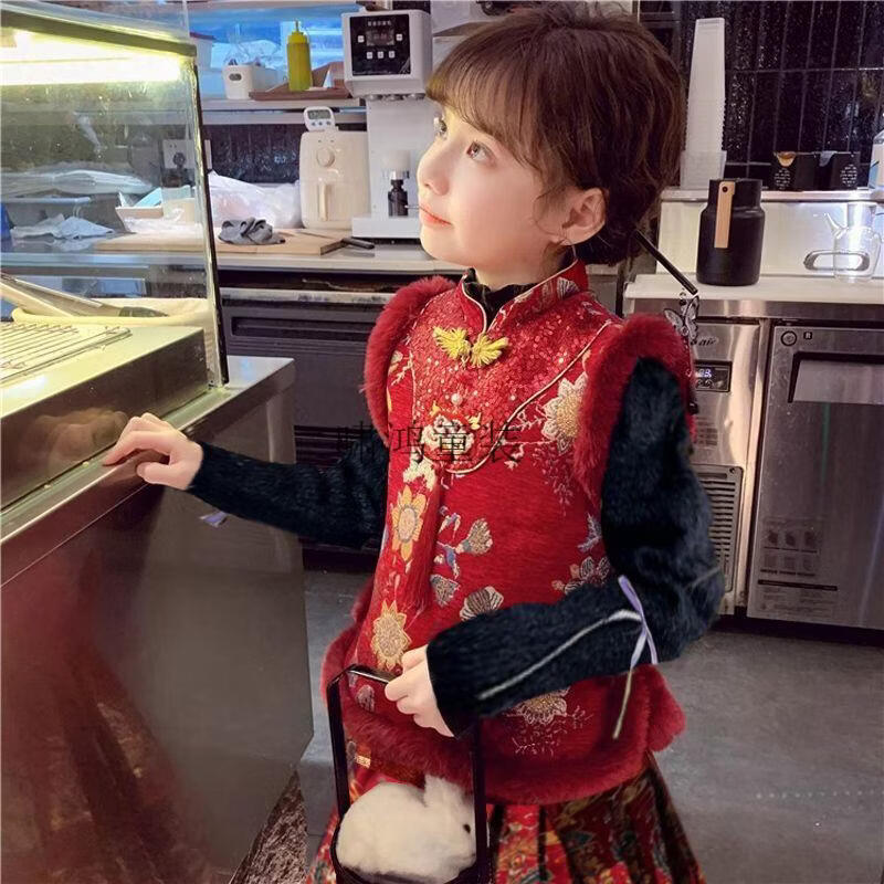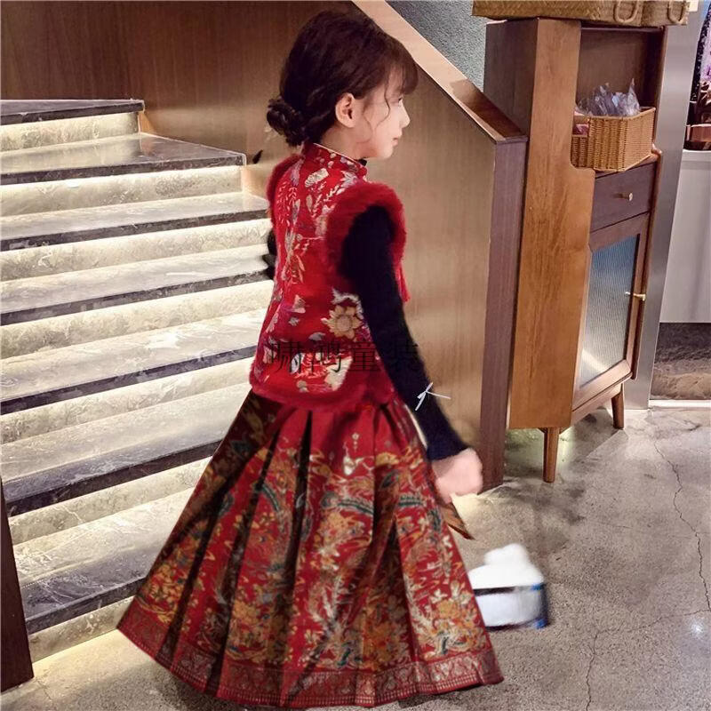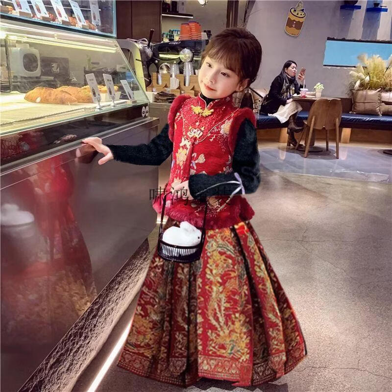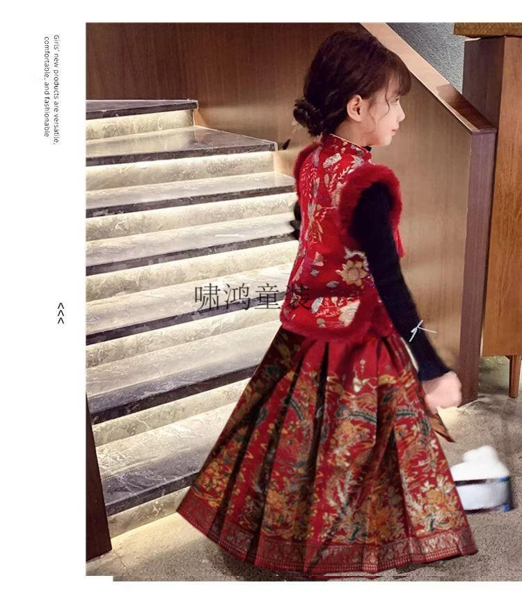 Wooden wooden house children's New Year's greetings autumn and winter style Chinese style two-piece set for girls and boys to wear Tang suit horse skirt with thick velvet, red embroidered vest + horse skirt + sweater - with headwear, plus velvet 140 (height is about 130cm)