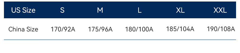 China (cm) 165 / 88-90 170 / 96-98 175 / 108-110 180 / 118-122 185 / 126-130