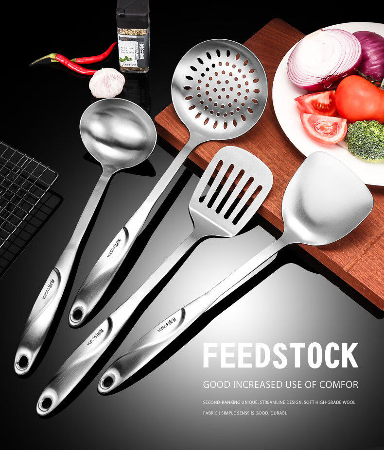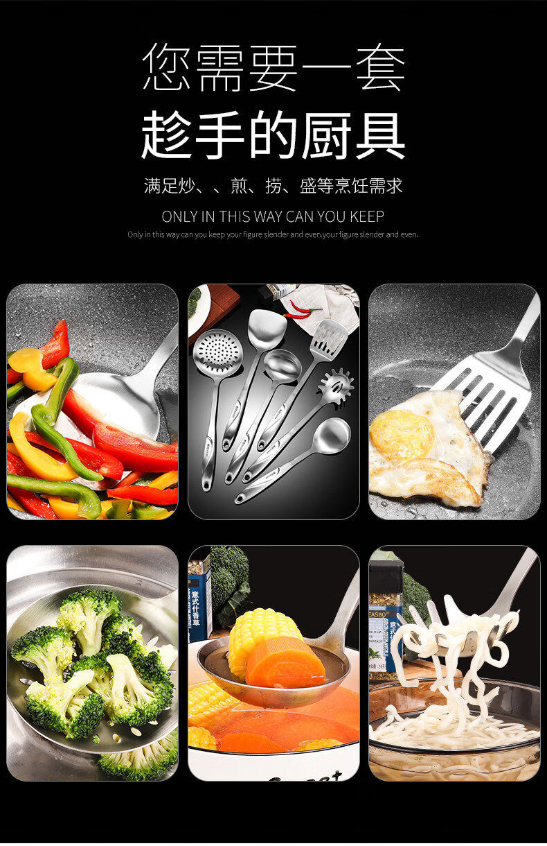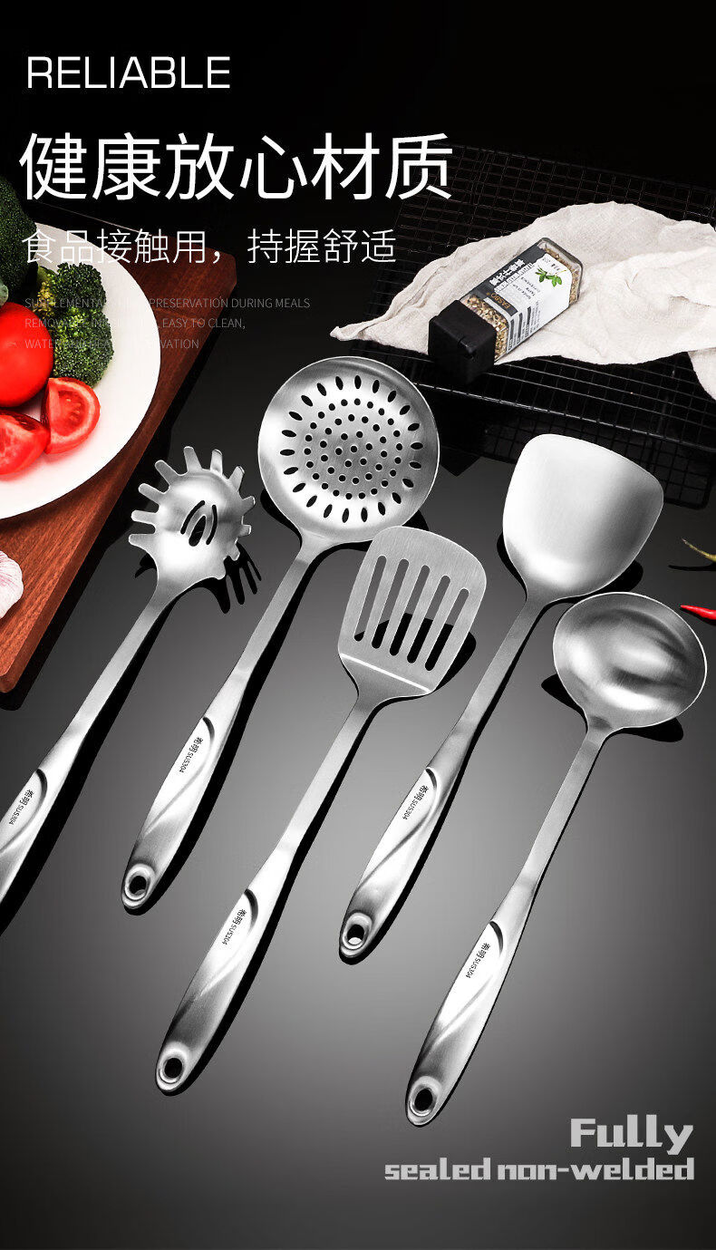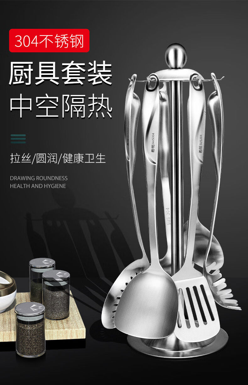 Yong Huan thickened 304 stainless steel spatula, cooking shovel, frying spatula, soup spoon, colander, kitchen utensil set, full set for home use, 7-piece set 304 steel spatula + soup spoon + colander + frying spatula + noodle + rice spoon + kitchen utensil rack