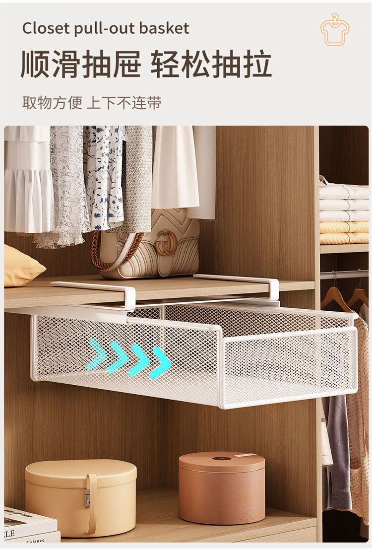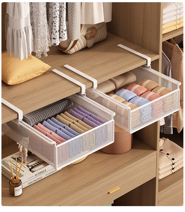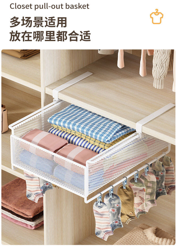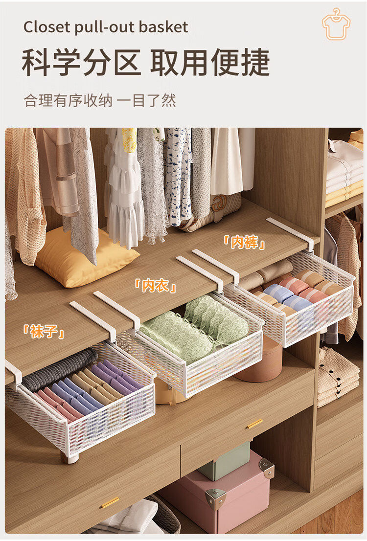 Wardrobe pull-out partition, cabinet, hanging underwear and socks storage box, hanging basket, drawer-type wardrobe pull-out basket, layered artifact, white-short style