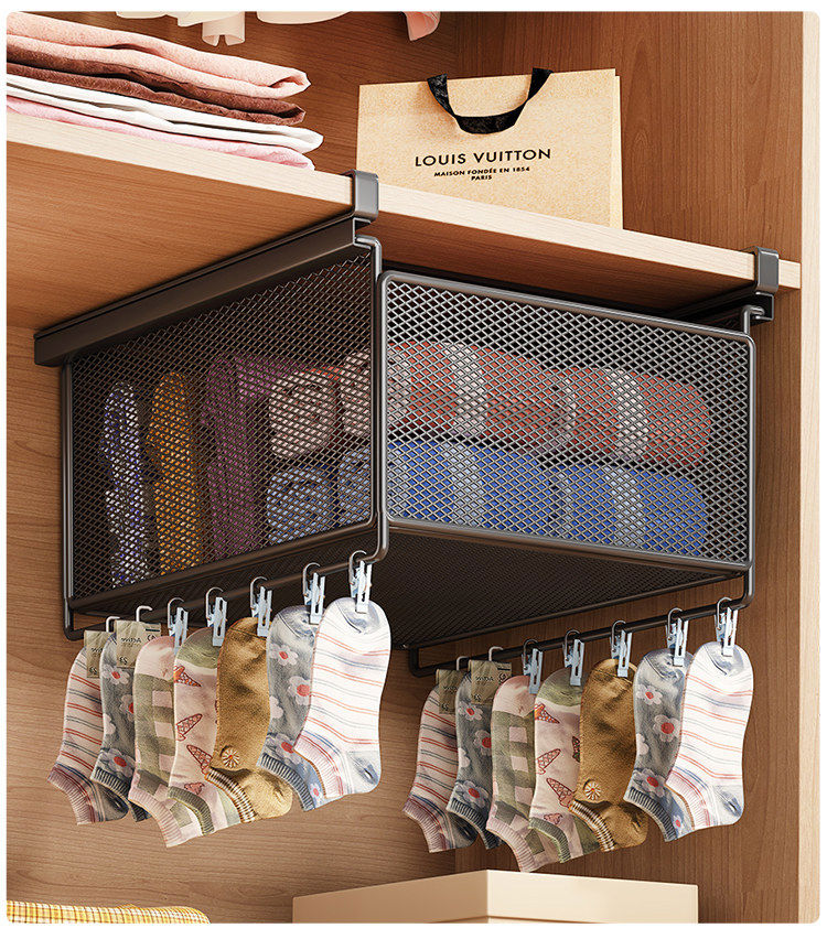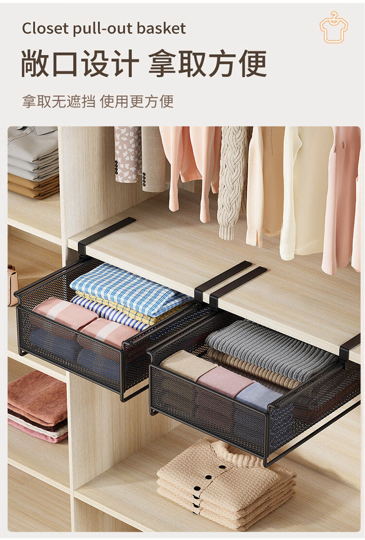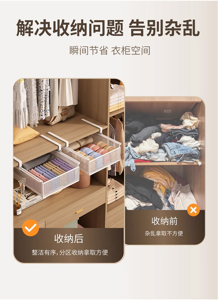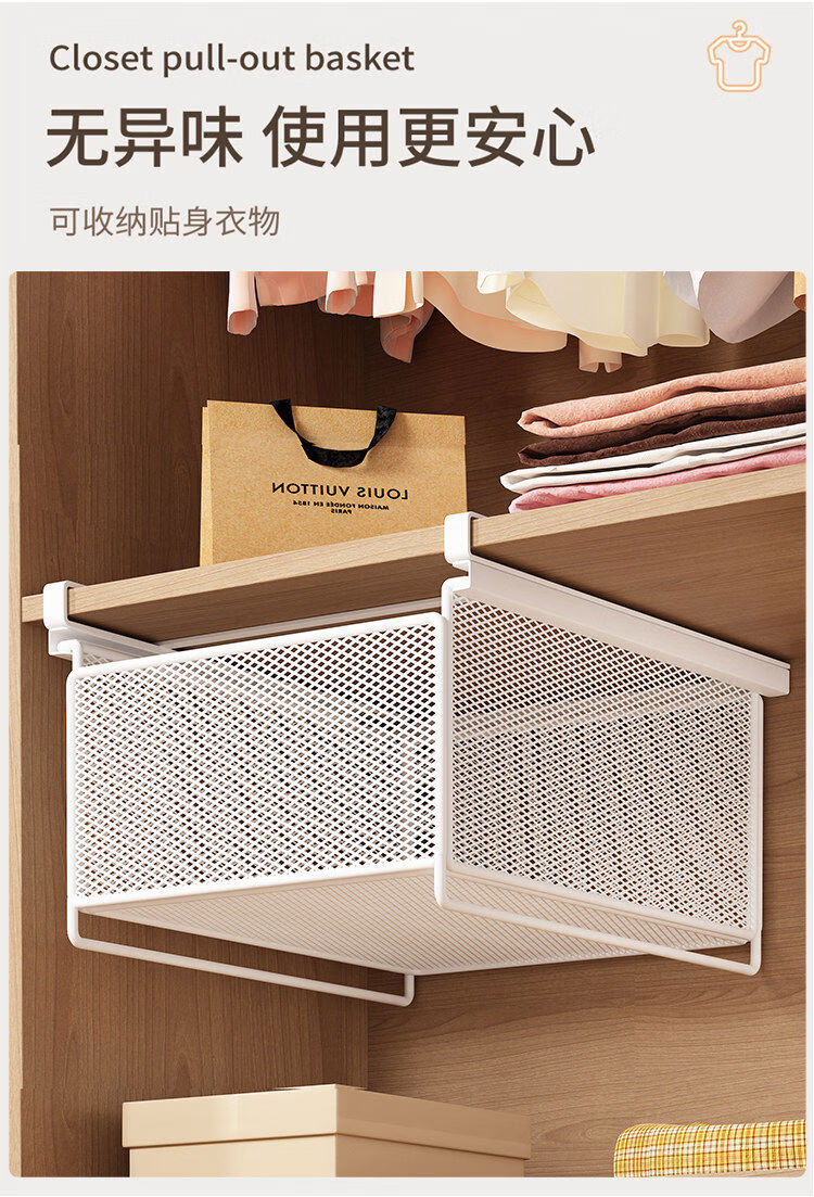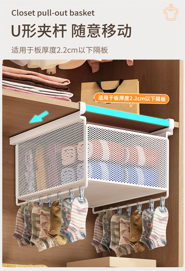 Wardrobe pull-out partition, cabinet, hanging underwear and socks storage box, hanging basket, drawer-type wardrobe pull-out basket, layered artifact, white-short style