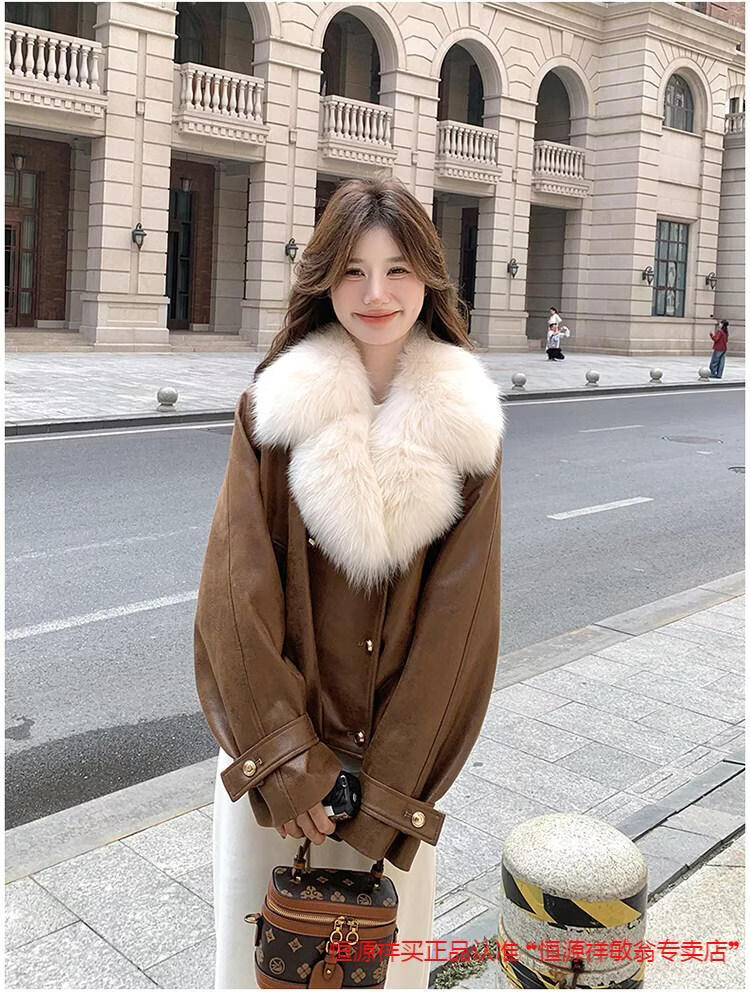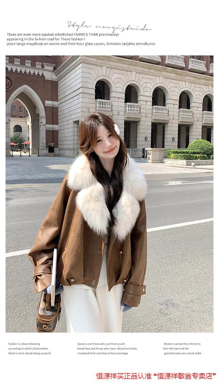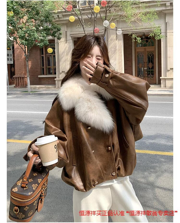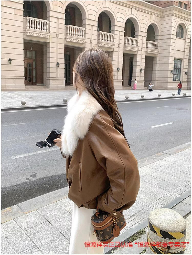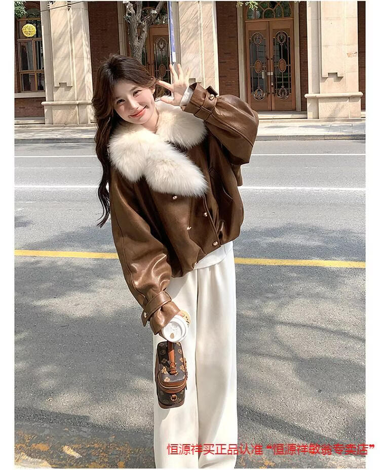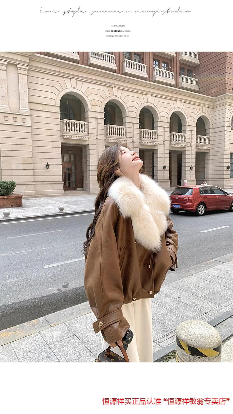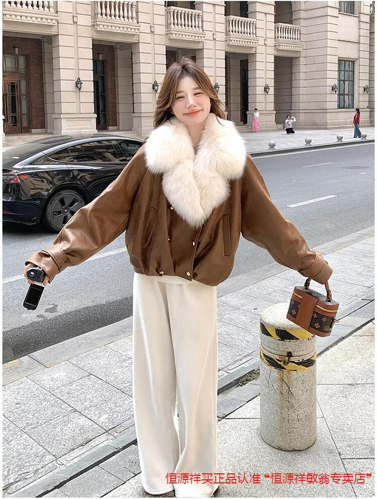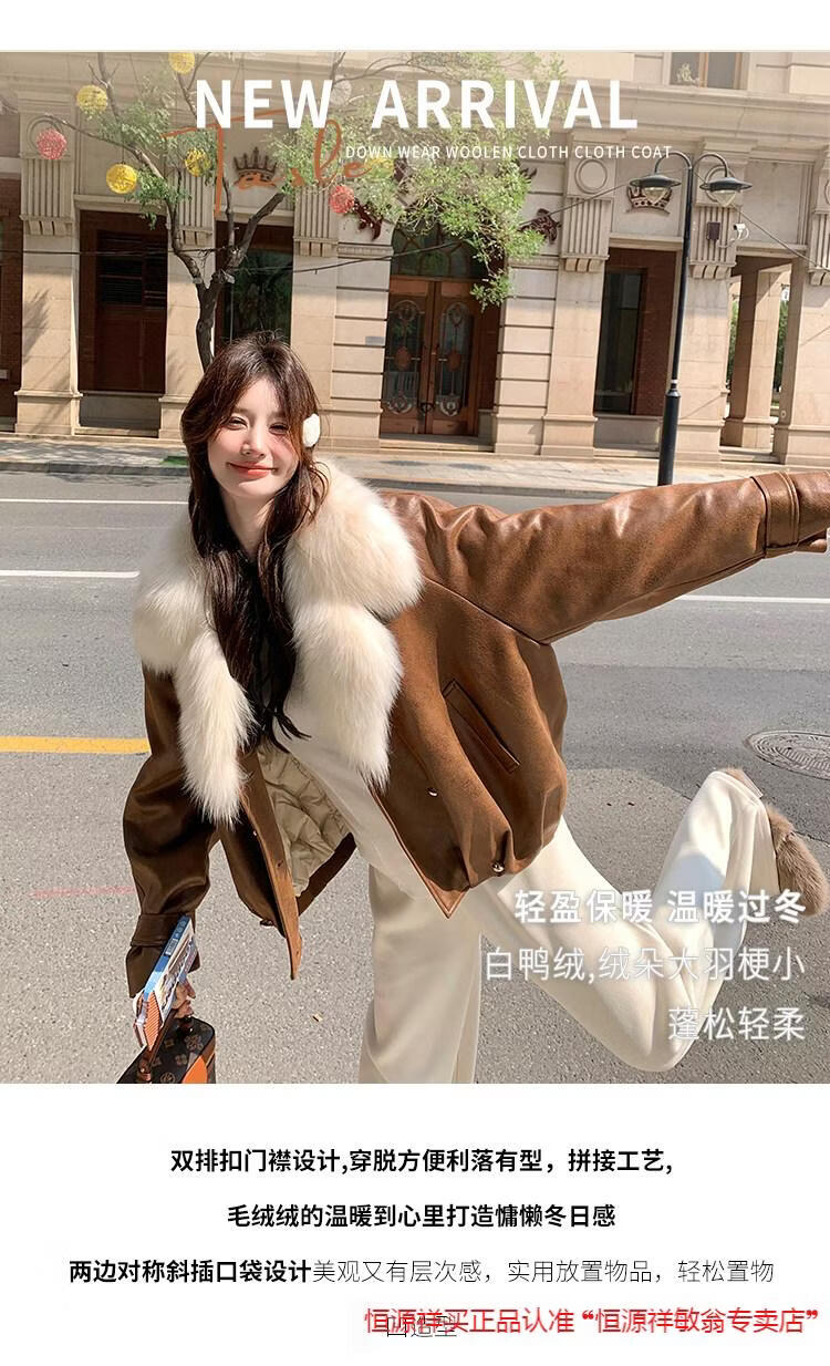 Hengyuanxiang chaqueta corta de plumón de cuero de pu marrón con cuello de piel grande para mujer en invierno forro interior enorme y atractivo abrigo grueso de una pieza de piel de plumón de pato blanco marrón XS 95 Jin Jin pesa 0,5 kg dentro