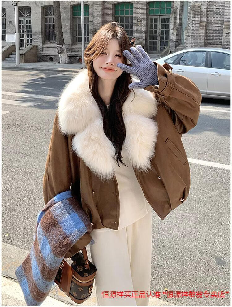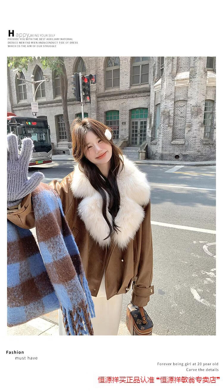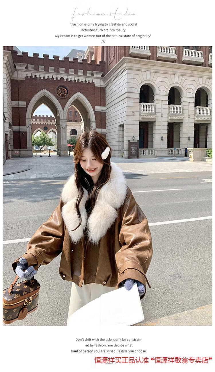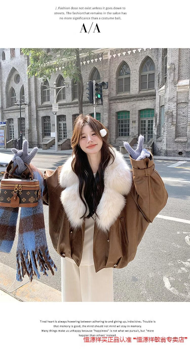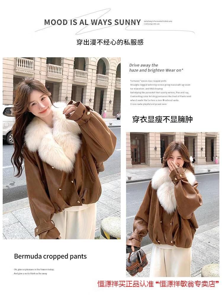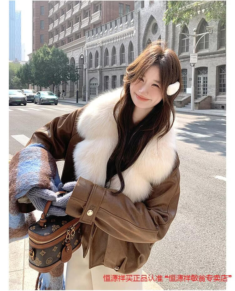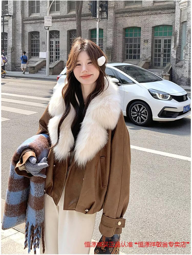 Hengyuanxiang chaqueta corta de plumón de cuero de pu marrón con cuello de piel grande para mujer en invierno forro interior enorme y atractivo abrigo grueso de una pieza de piel de plumón de pato blanco marrón XS 95 Jin Jin pesa 0,5 kg dentro