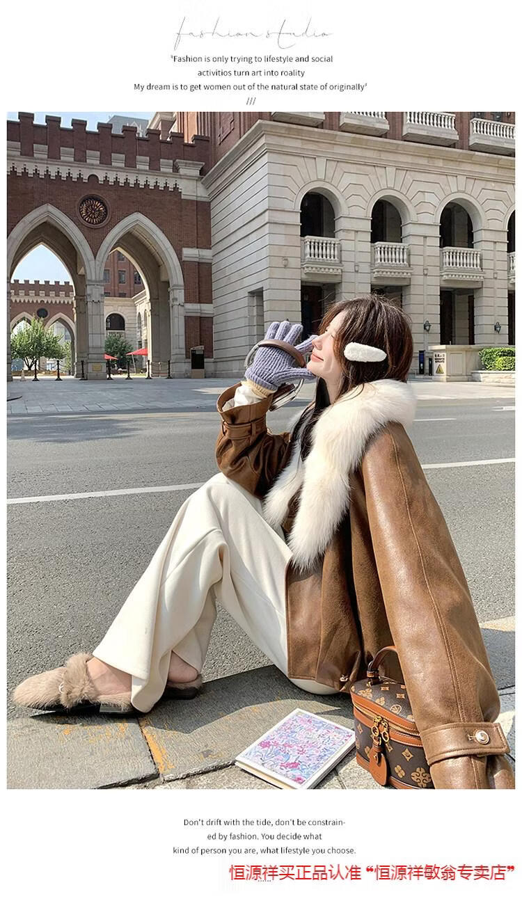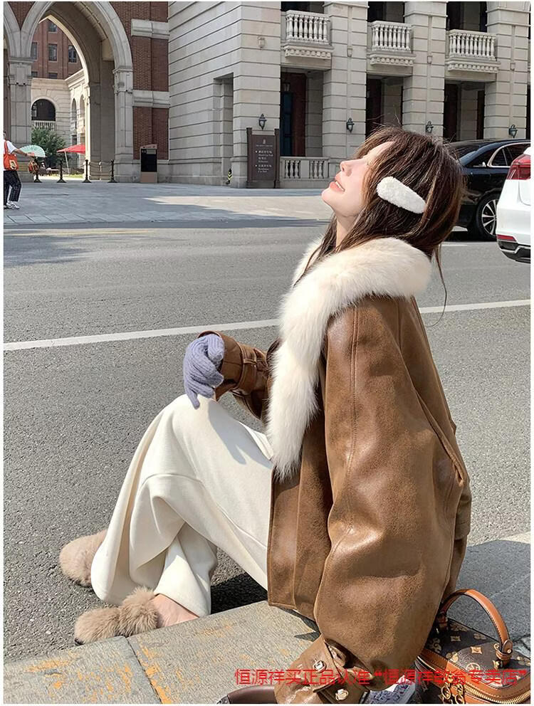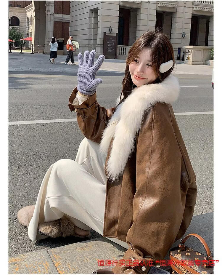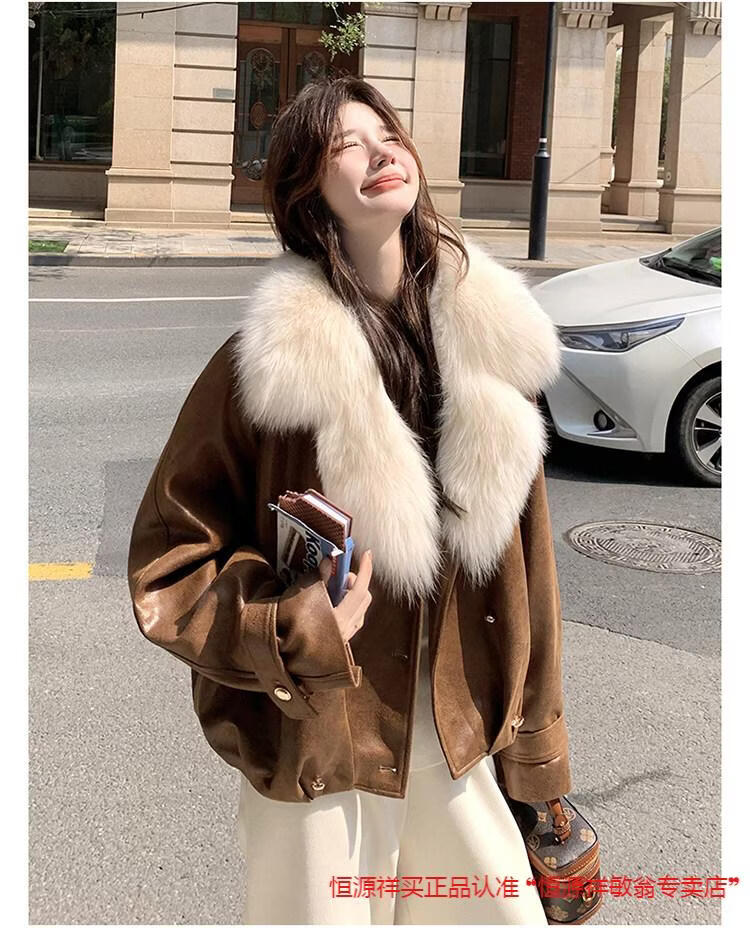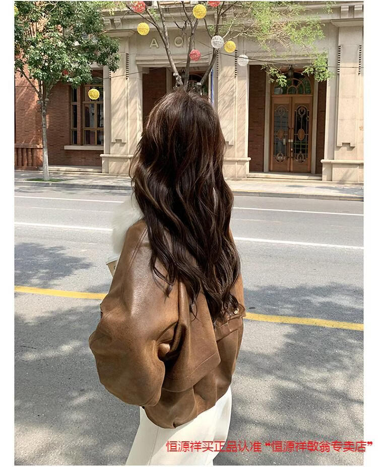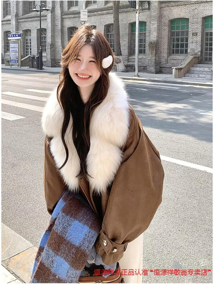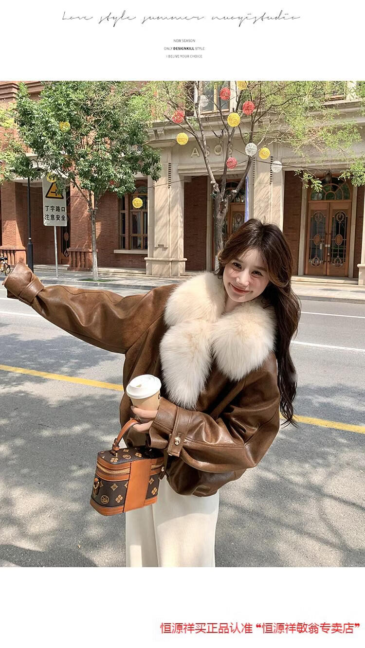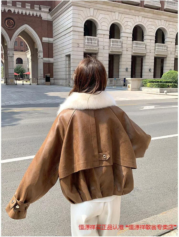 Hengyuanxiang chaqueta corta de plumón de cuero de pu marrón con cuello de piel grande para mujer en invierno forro interior enorme y atractivo abrigo grueso de una pieza de piel de plumón de pato blanco marrón XS 95 Jin Jin pesa 0,5 kg dentro