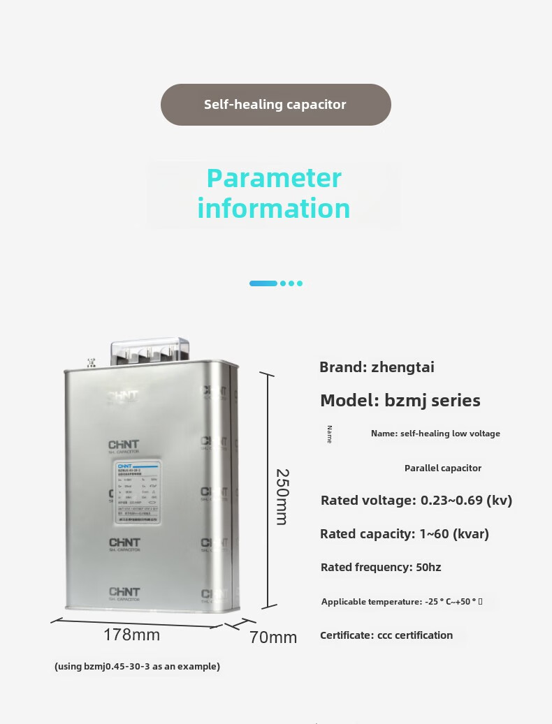 Chint Capacitor Bzmj0.45 0.4 ink-free compensation self-repair low-voltage parallel power compensator 450V BZMJ-0.45-1-3