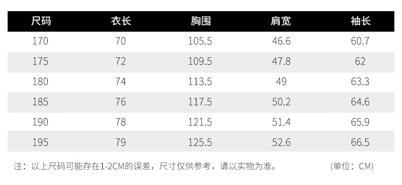 China (cm) 165 / 88-90 170 / 96-98 175 / 108-110 180 / 118-122 185 / 126-130