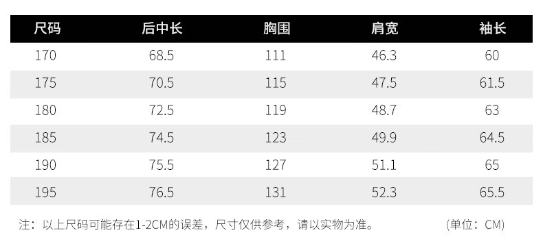 China (cm) 165 / 88-90 170 / 96-98 175 / 108-110 180 / 118-122 185 / 126-130
