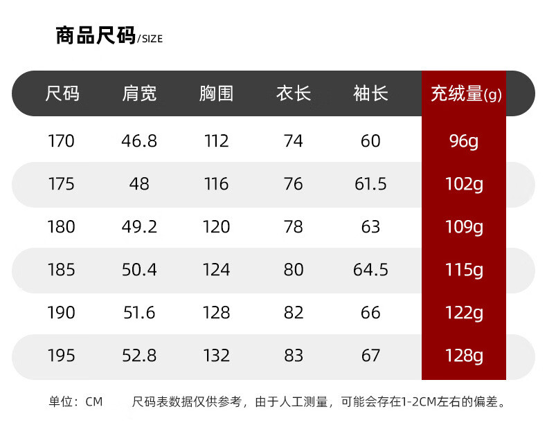 China (cm) 165 / 88-90 170 / 96-98 175 / 108-110 180 / 118-122 185 / 126-130