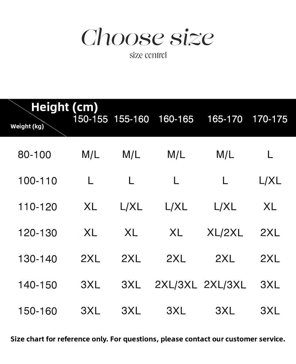 China (cm) 160-165/84-86 165-170 / 88-90 167-172 / 92-96 168-173 / 98-102 170-176 / 106-110