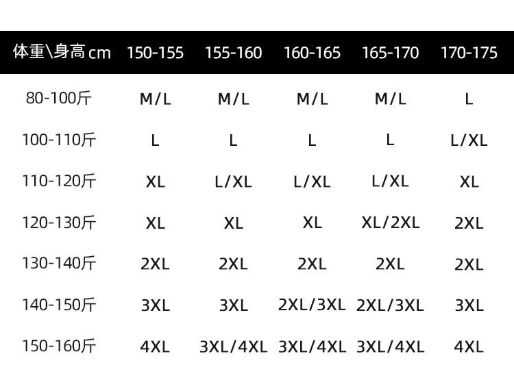 China (cm) 160-165/84-86 165-170 / 88-90 167-172 / 92-96 168-173 / 98-102 170-176 / 106-110