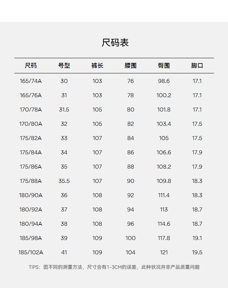 China (cm) 160-165/84-86 165-170 / 88-90 167-172 / 92-96 168-173 / 98-102 170-176 / 106-110
