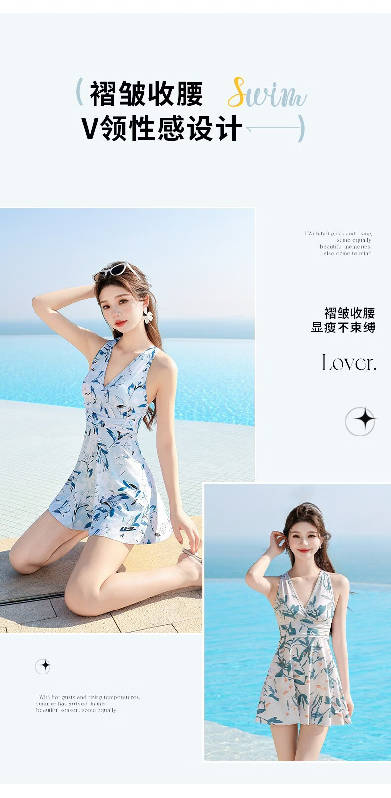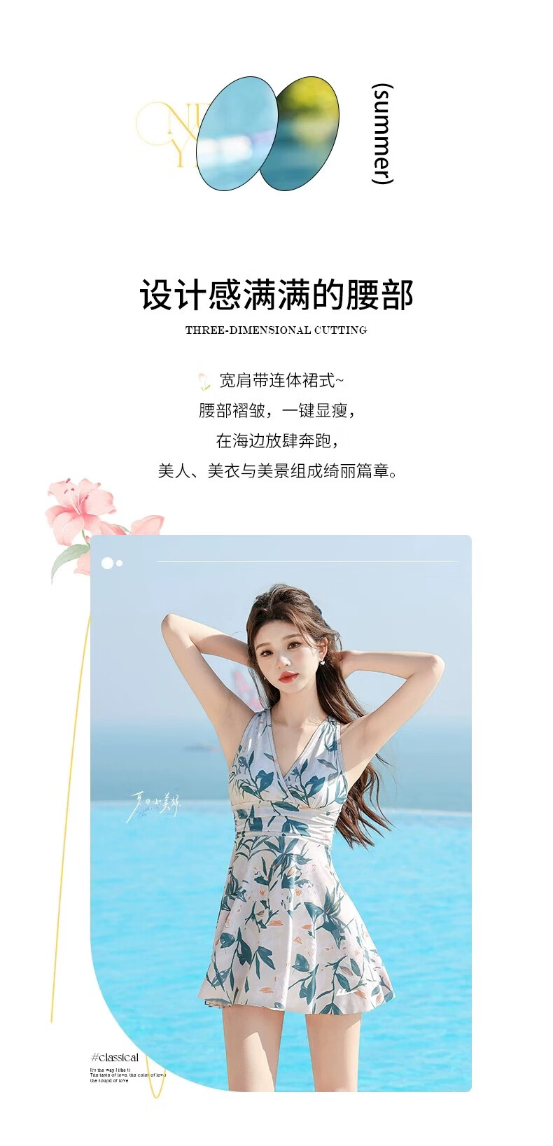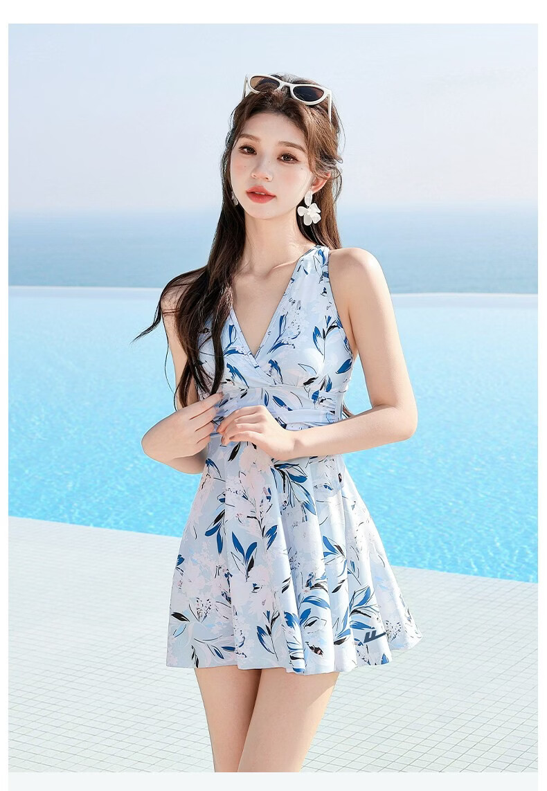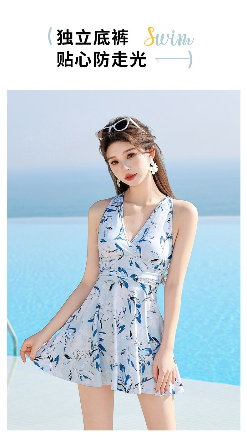 Pull-back swimwear for women 2025 new one-piece skirt style to cover the flesh and look slimming and conservative beach vacation swimwear blue leaves (swimming cap two-piece set) M (recommended 85-95Jin Jin equals 0.5 kg)