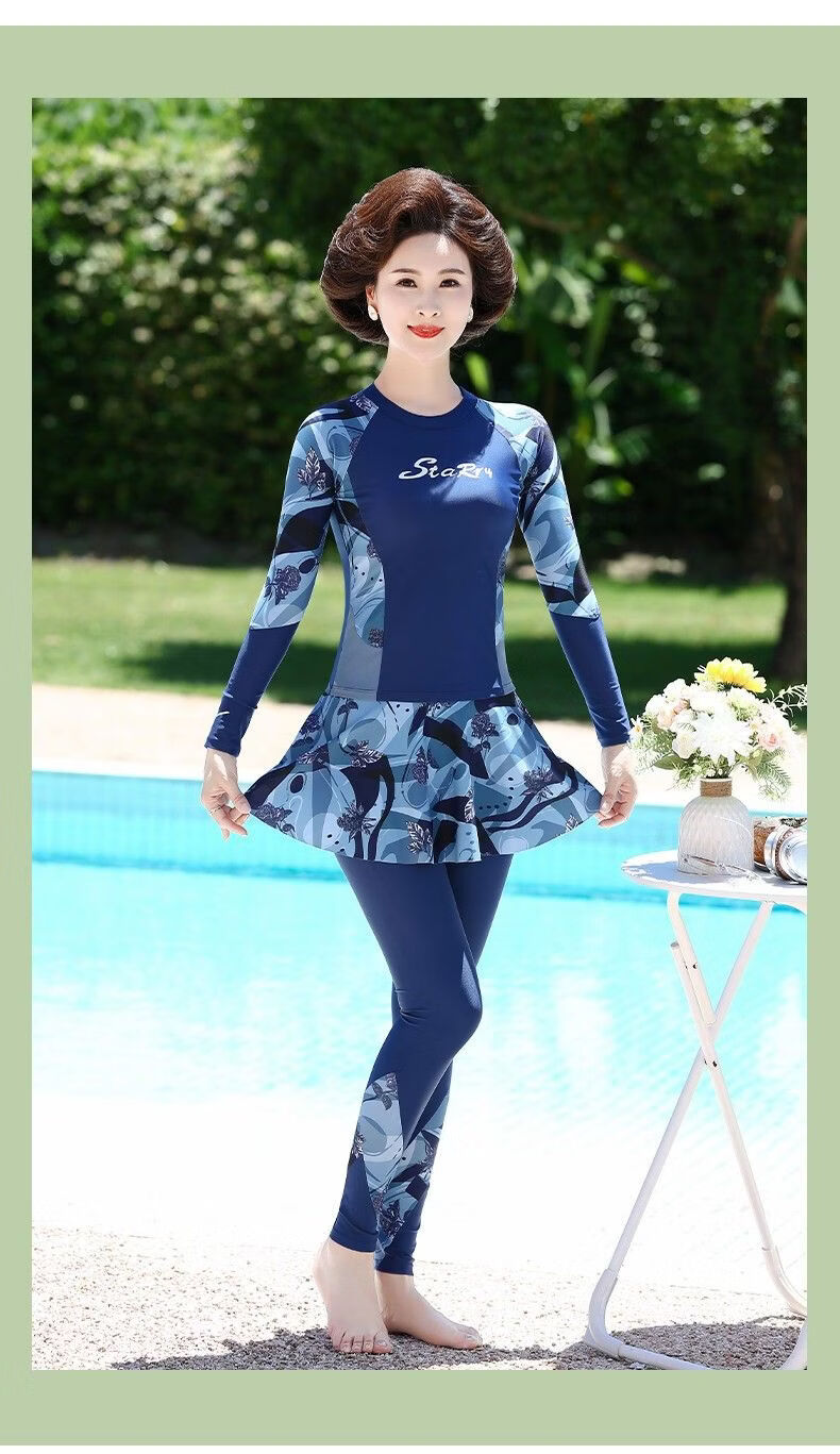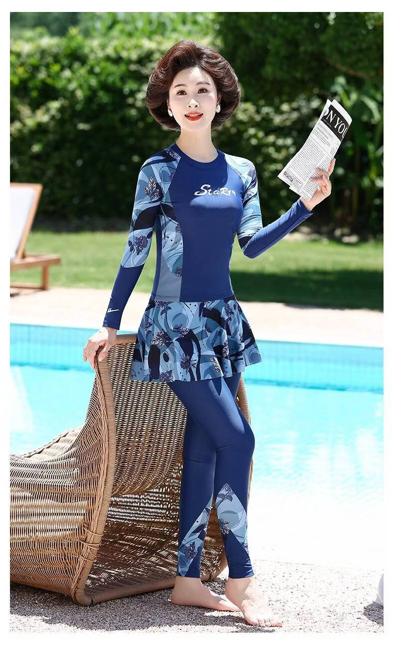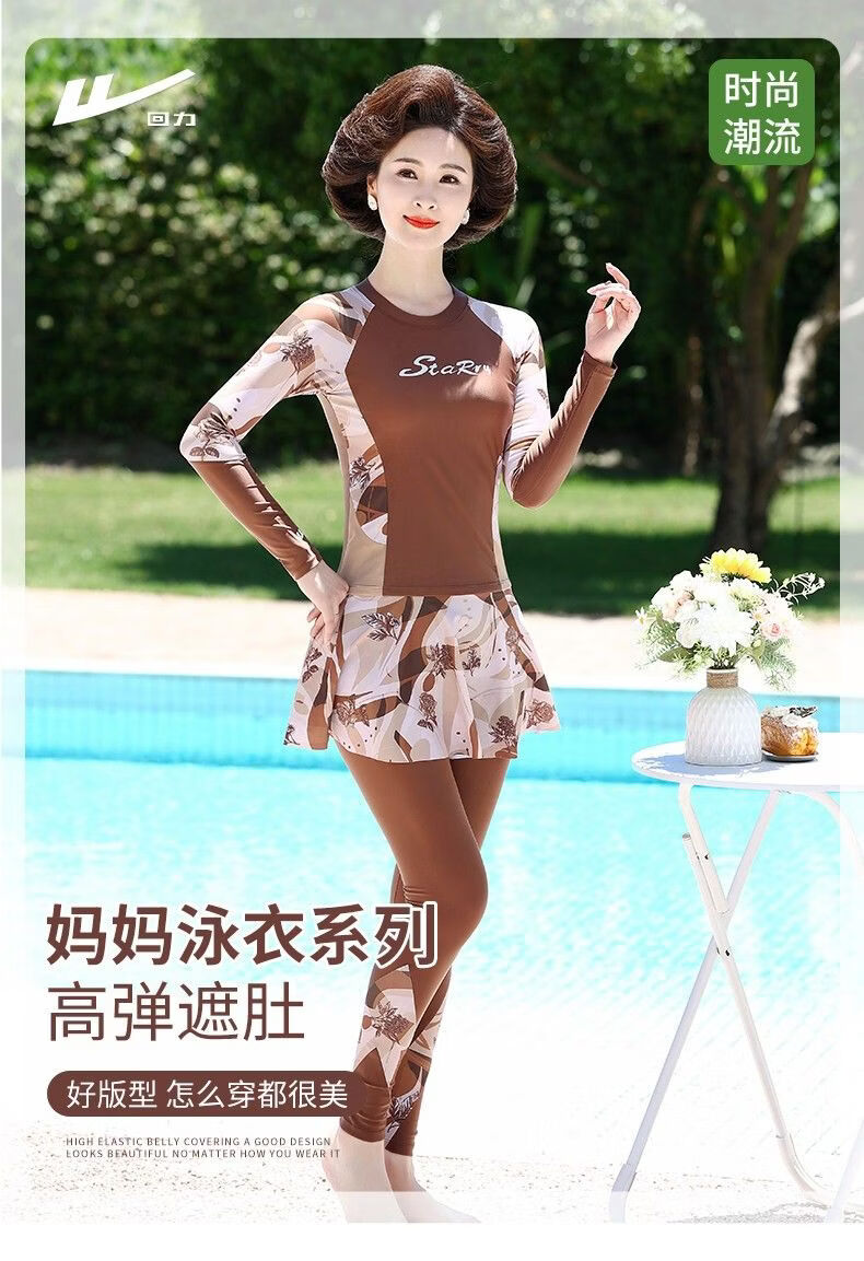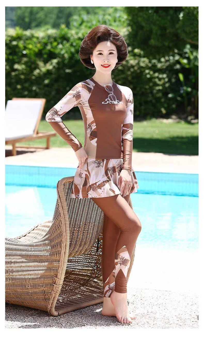 Huali middle-aged and elderly swimsuit three-piece set 2025 new mother girl conservative split long-sleeved trousers slimming hot spring coffee color (mobile phone bag set) L (recommended 90-105 Jin Jin equals 0.5 kg)