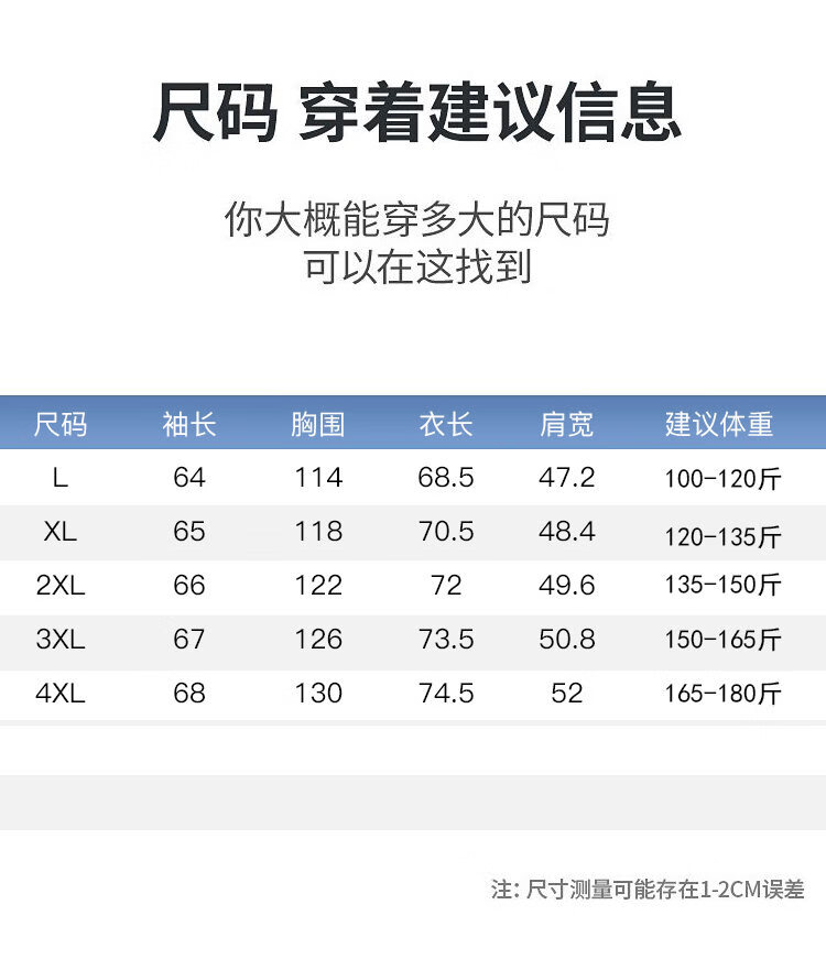 China (cm) 165 / 88-90 170 / 96-98 175 / 108-110 180 / 118-122 185 / 126-130