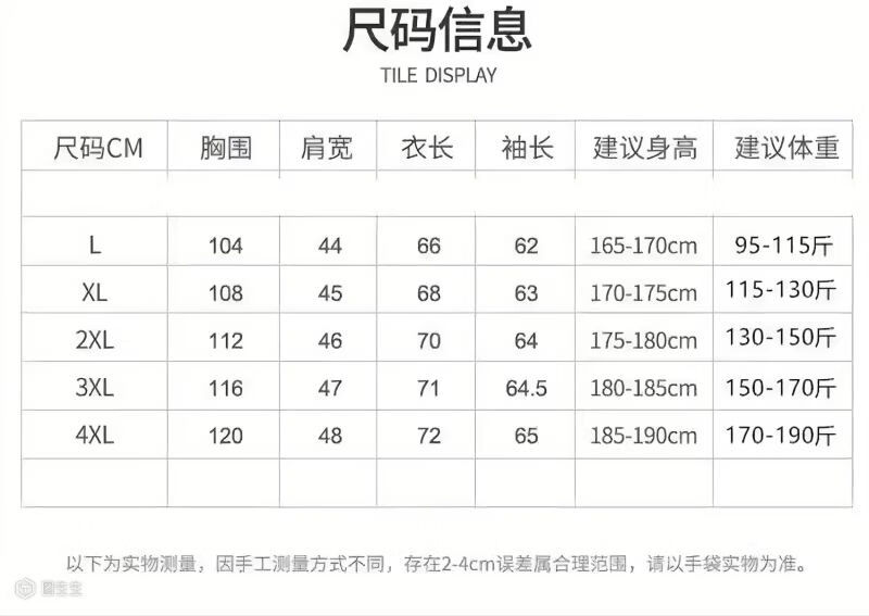 China (cm) 165 / 88-90 170 / 96-98 175 / 108-110 180 / 118-122 185 / 126-130