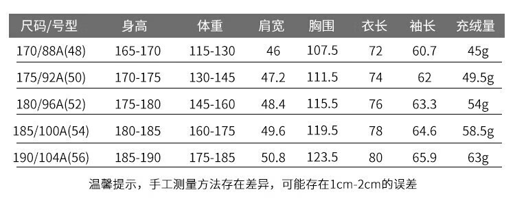 China (cm) 165 / 88-90 170 / 96-98 175 / 108-110 180 / 118-122 185 / 126-130