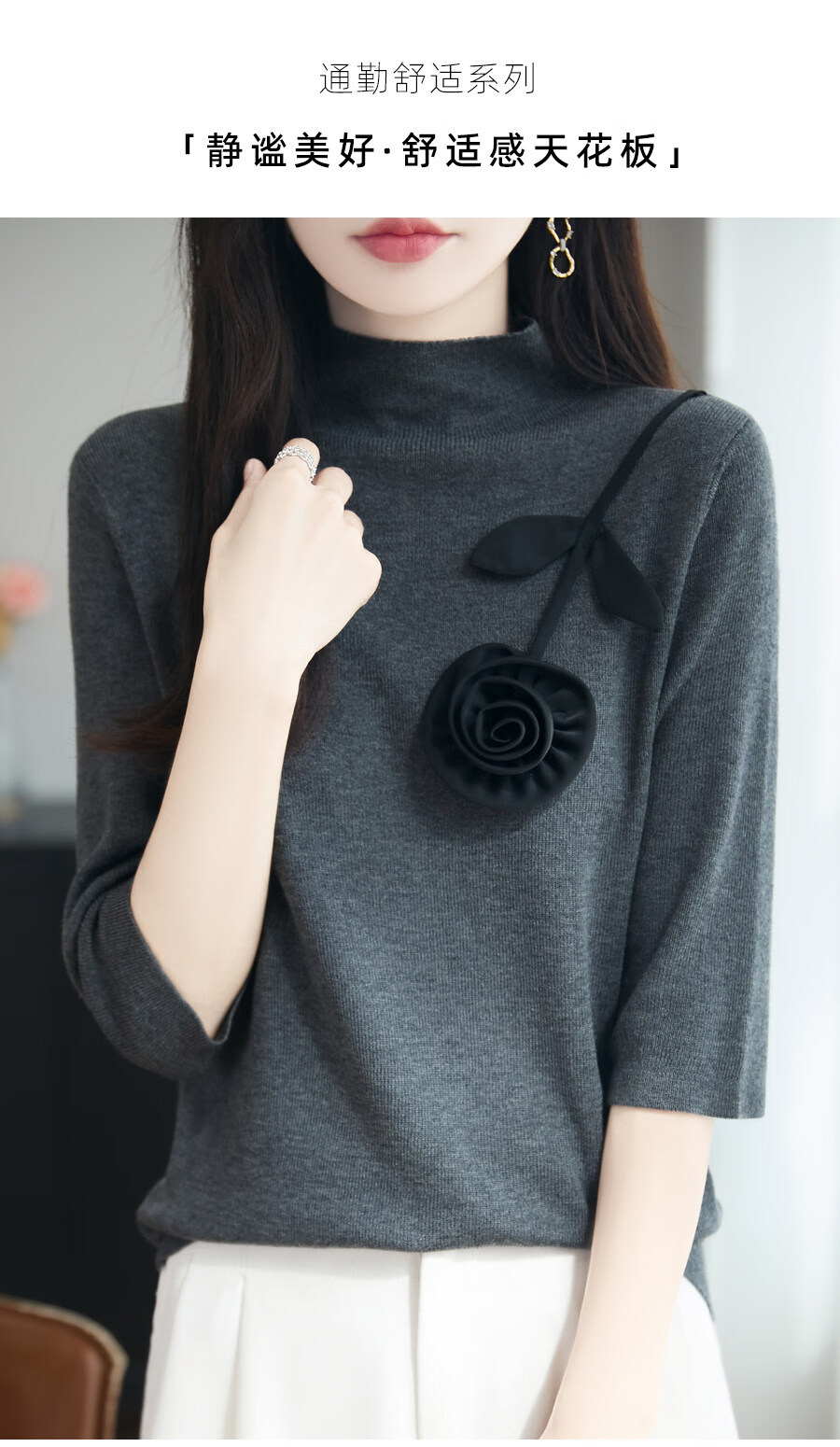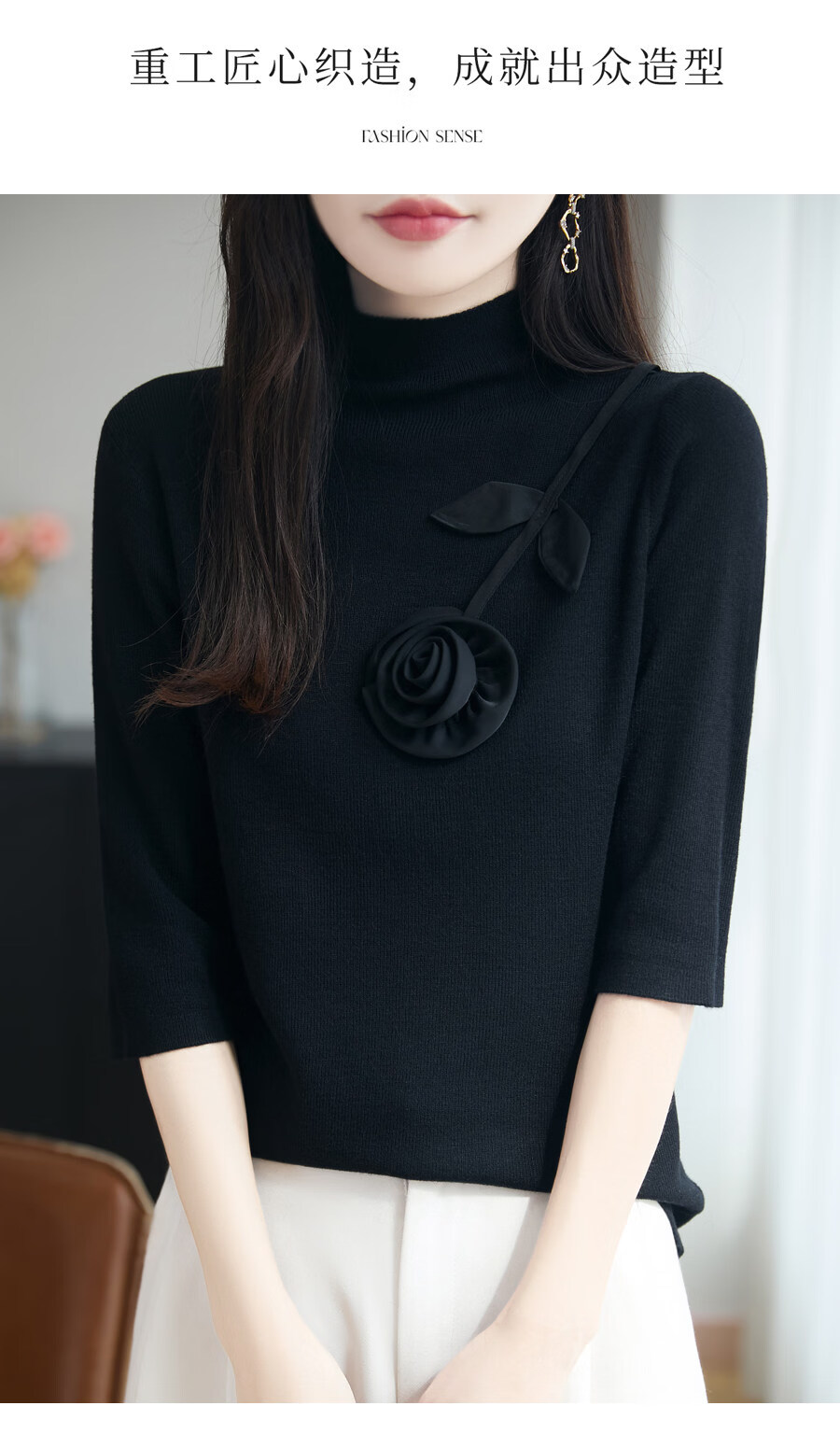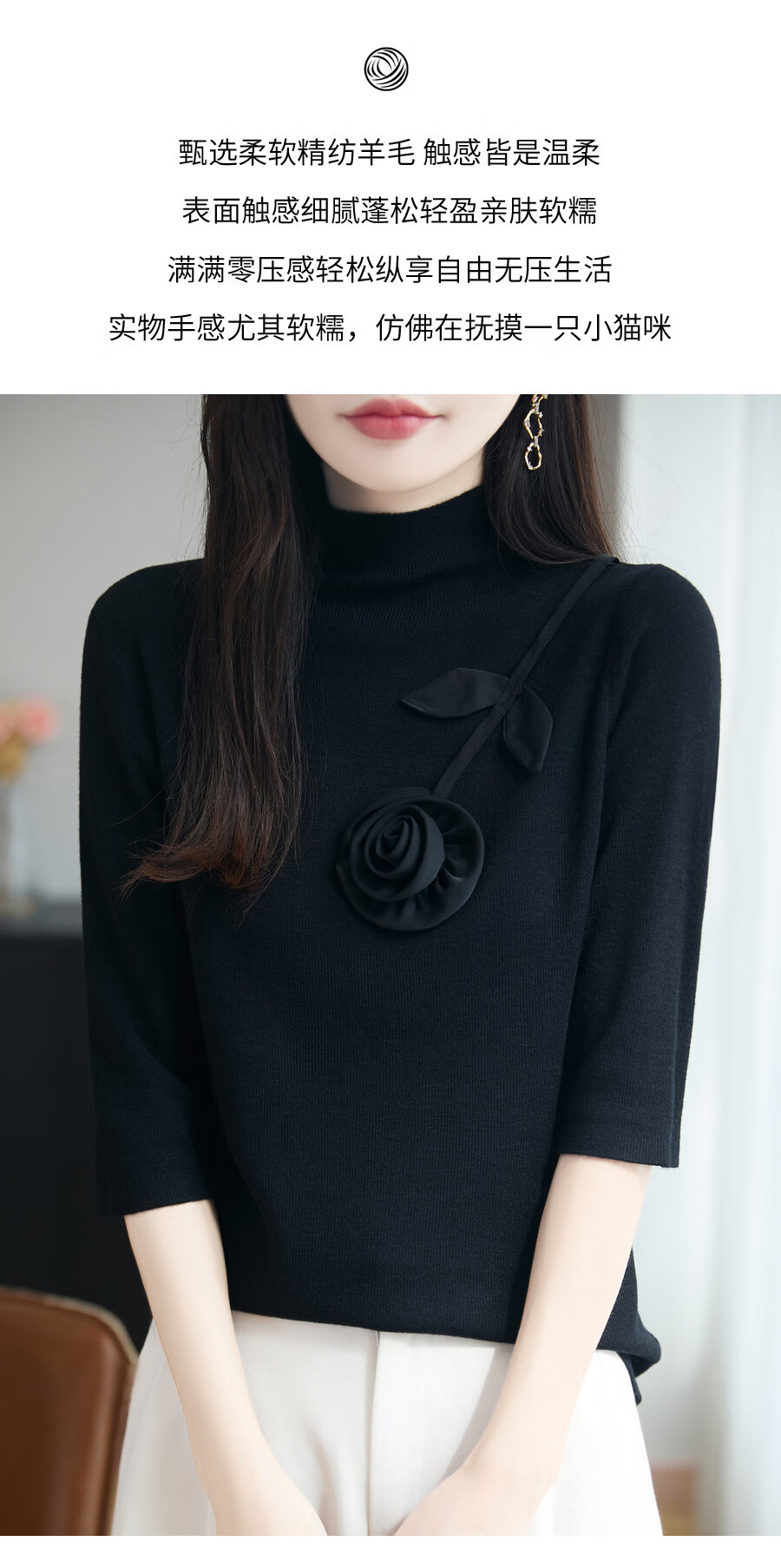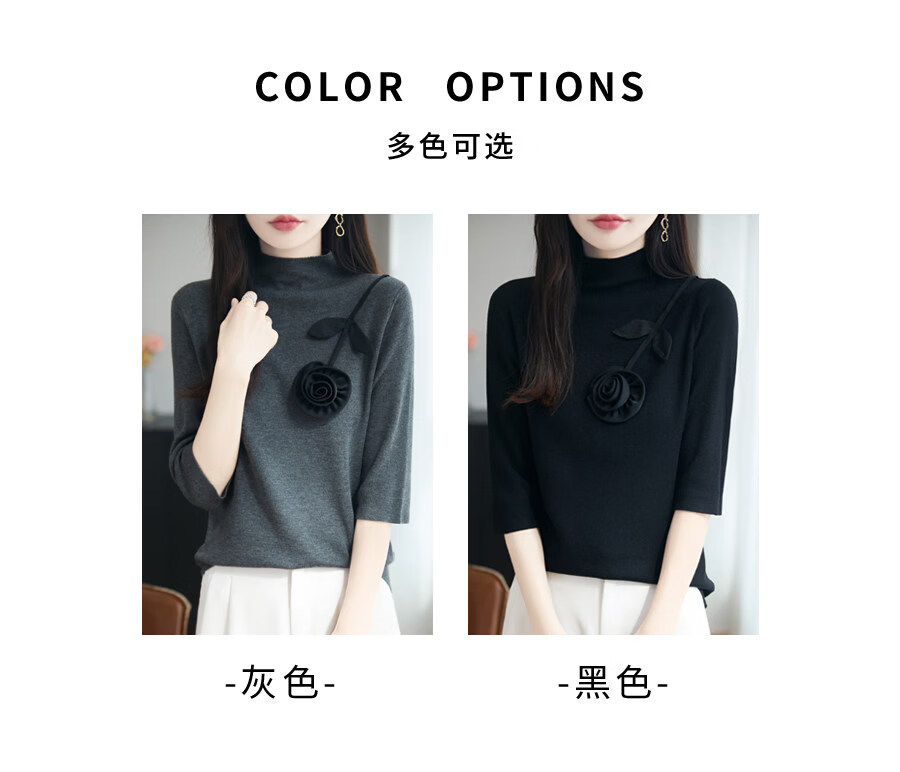 Hengyuanxiang early autumn five-quarter sleeve sweater for women half turtleneck with retro intellectual mid-sleeve sweater base layer black L 115-130