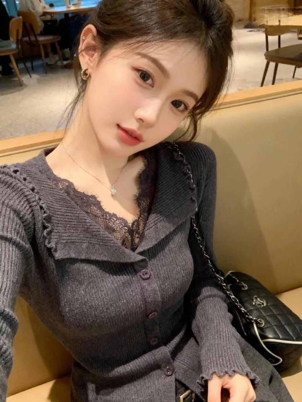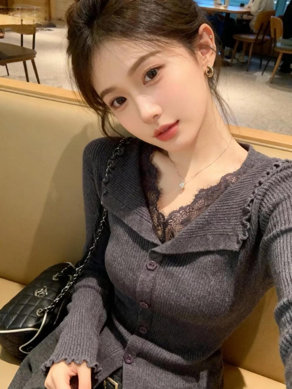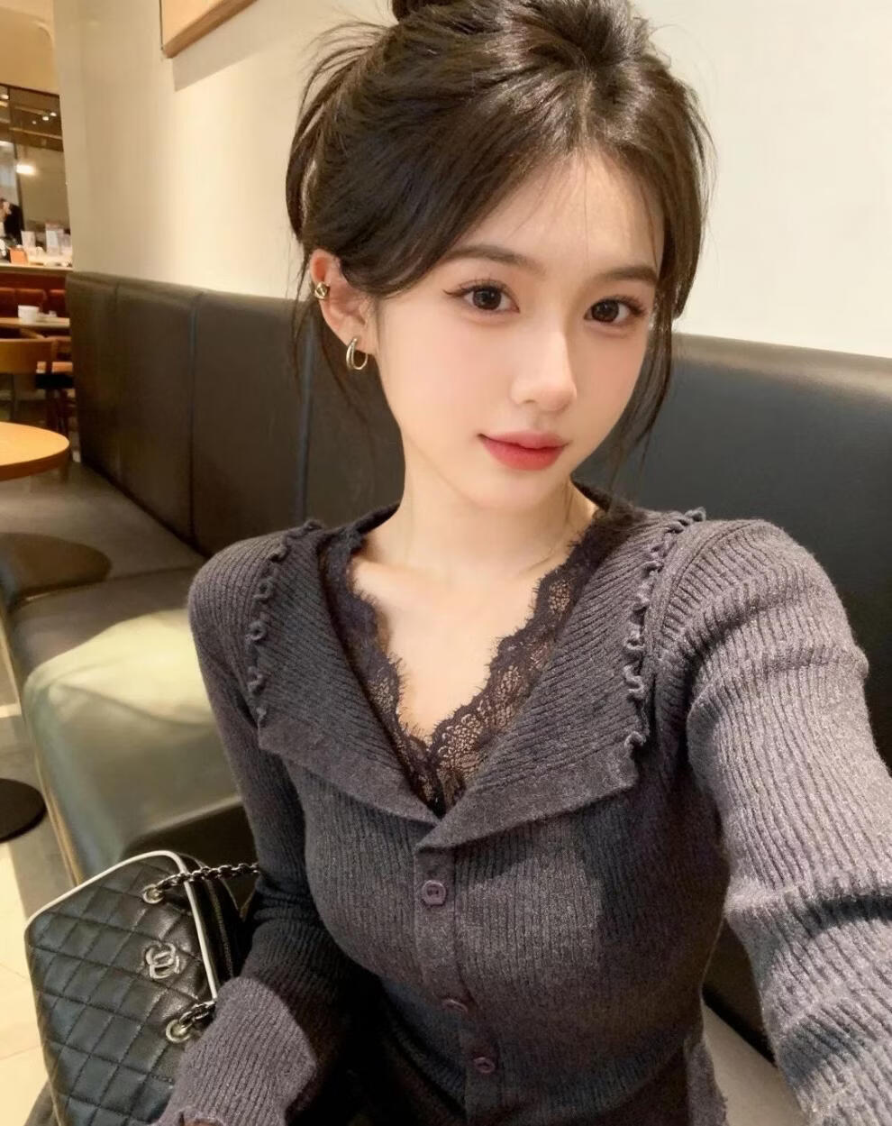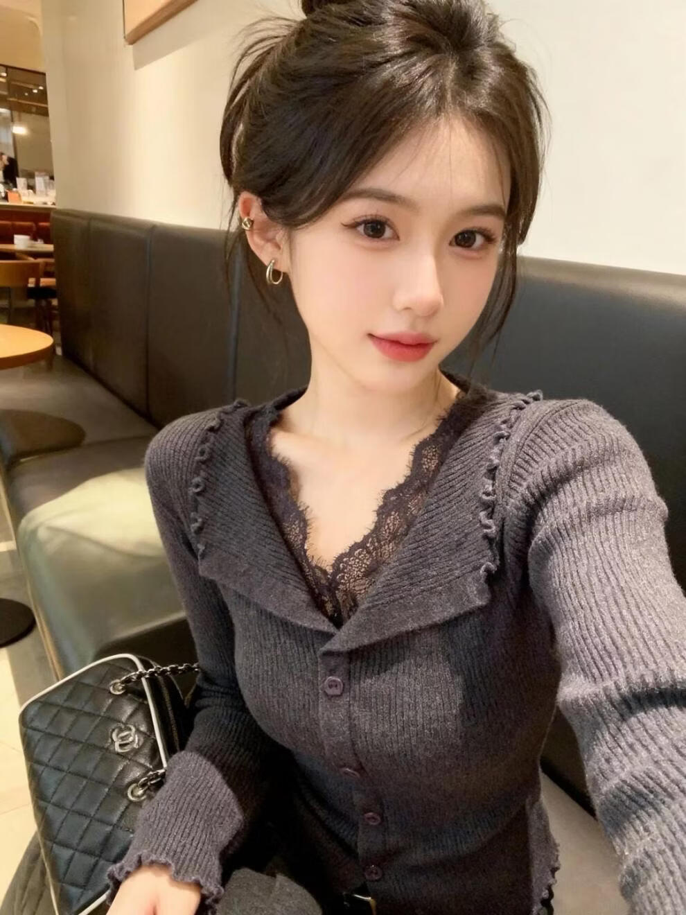 Hengyuanxiang black v-neck lace trim slim-fitting sweater for women 2025 new winter wear inner base top brand dark gray sweater for women 2025/very good-looking tops that do not conflict with style/autumn and winter wear M 95-115Jin Jin is equal to 0.5 kg