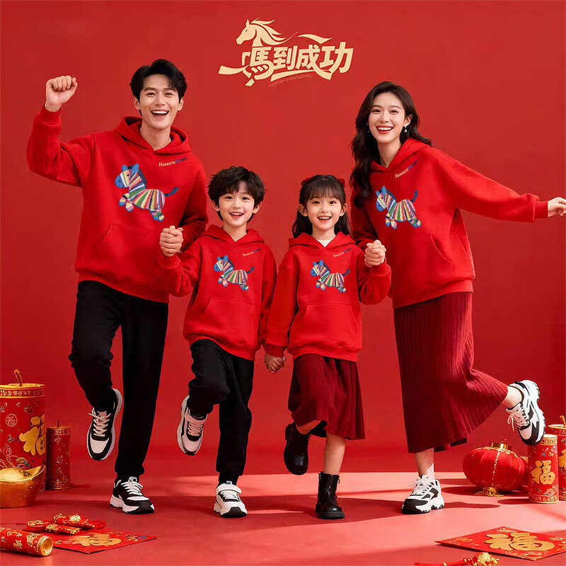 WASSUP WKENG New Year's Eve parent-child outfits for a family of three, sweatshirts, mother and daughter, 2026 Year of the Horse, zodiac year, family portrait clothes, red (spring and autumn), eight styles 130 130cm (recommended 46-55 Jin Jin equals 0.5 kg)