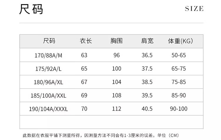 China (cm) 165 / 88-90 170 / 96-98 175 / 108-110 180 / 118-122 185 / 126-130