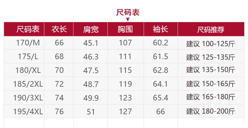 China (cm) 165 / 88-90 170 / 96-98 175 / 108-110 180 / 118-122 185 / 126-130