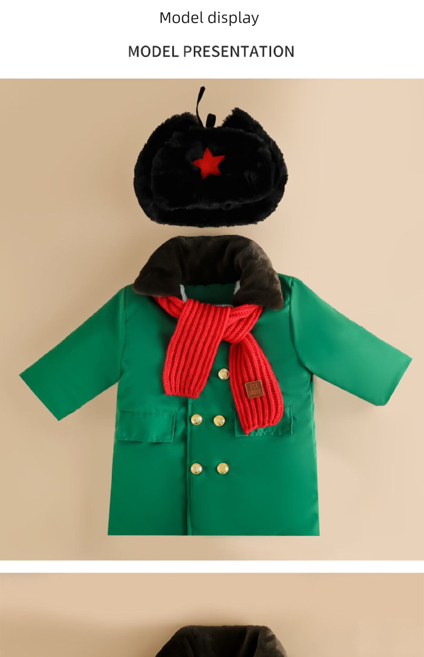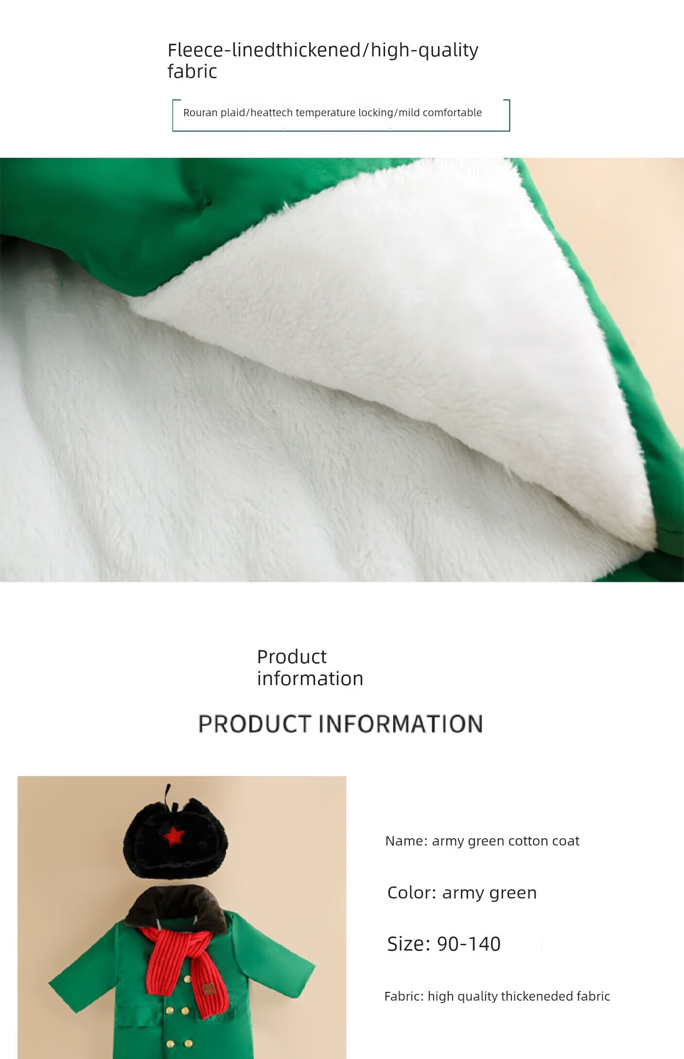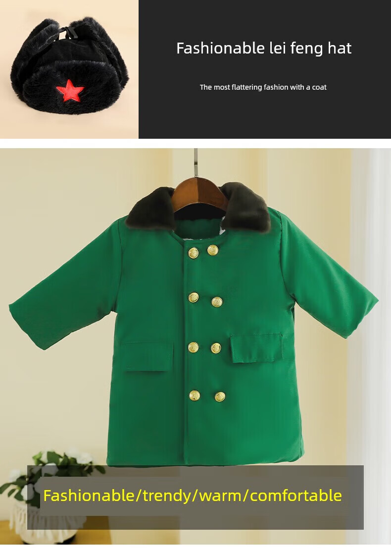 Burwilde international brand children's green military coat cotton thickened mid-length coat children's winter clothing thickened warm baby green single-piece military coat 140 cm
