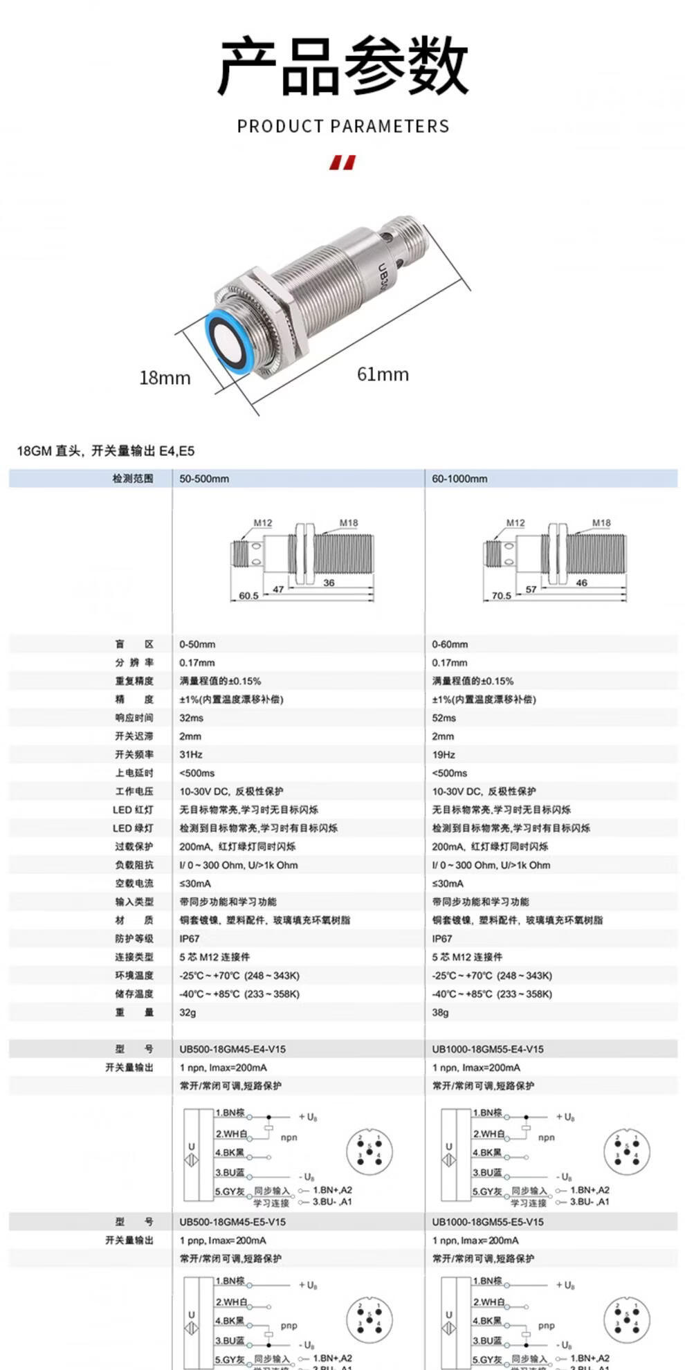 Small blind area, small angle, millimeter-level high-precision frequency ultrasonic ranging sensor induction switch LGUB1000 NPN 30-300mm
