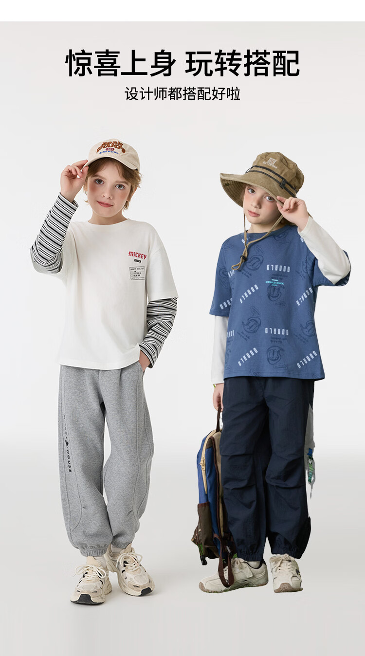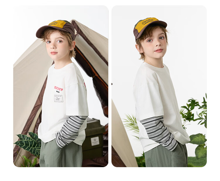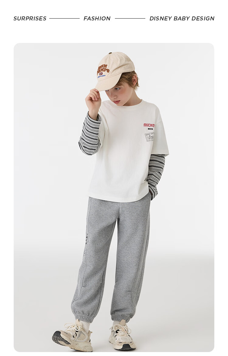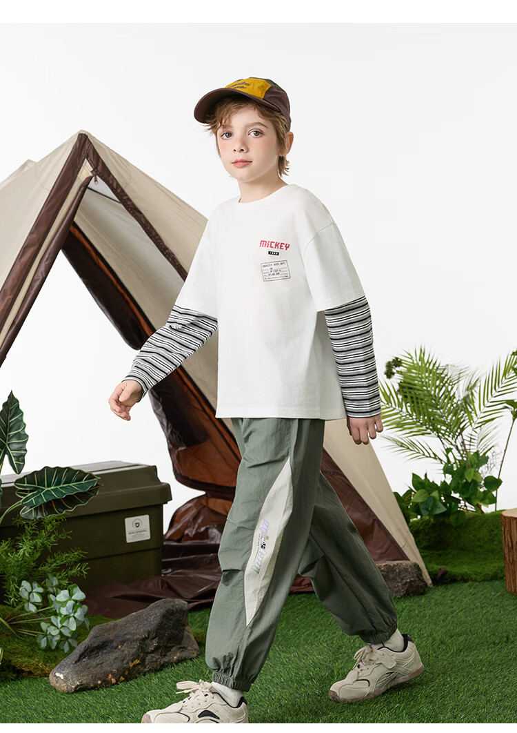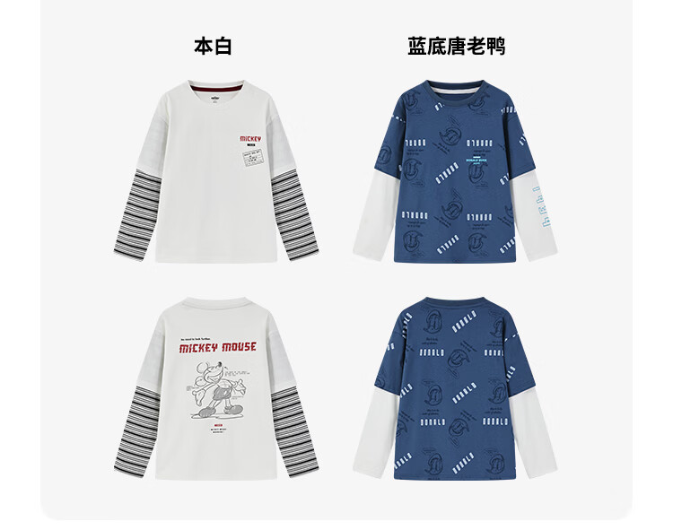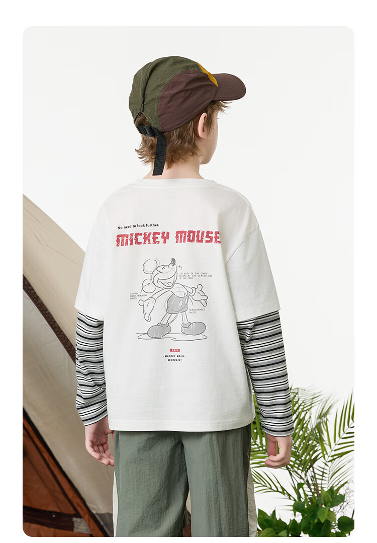 Disney (Disney) children's clothing boys fake two-piece striped long-sleeved T-shirt 2026 spring and autumn new children's round neck fashionable bottoming top trendy white trendy fake two-piece T-shirt 160