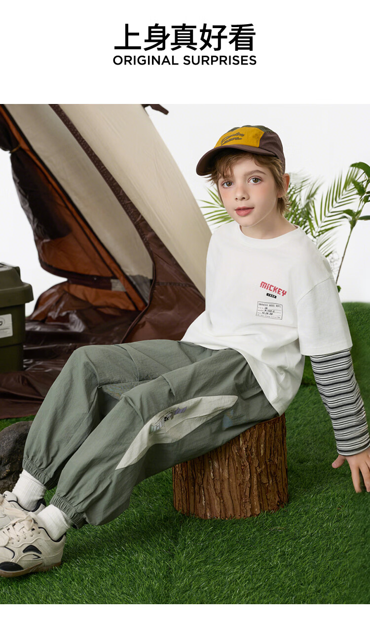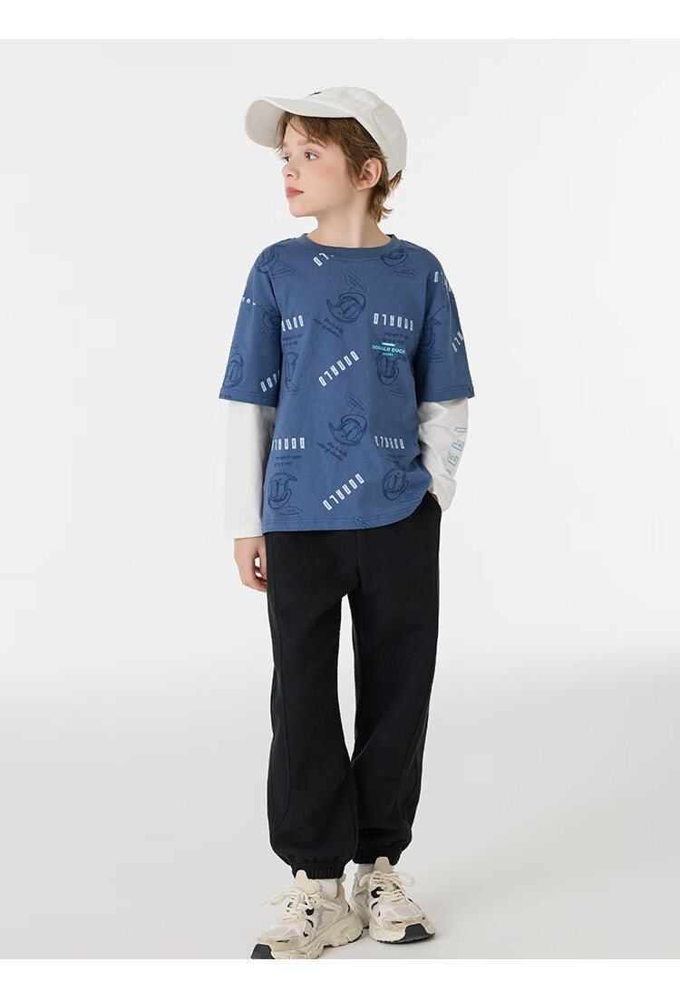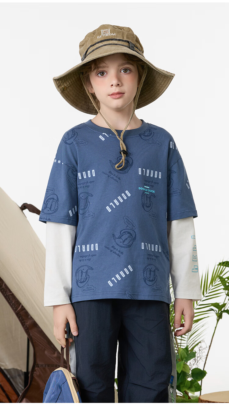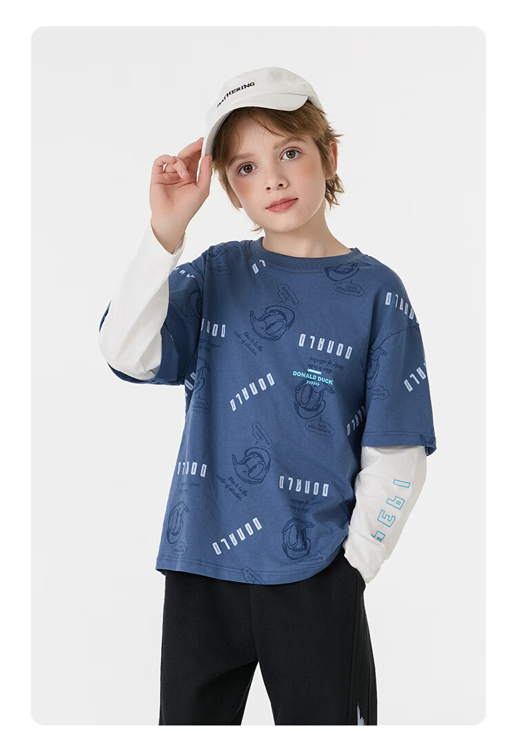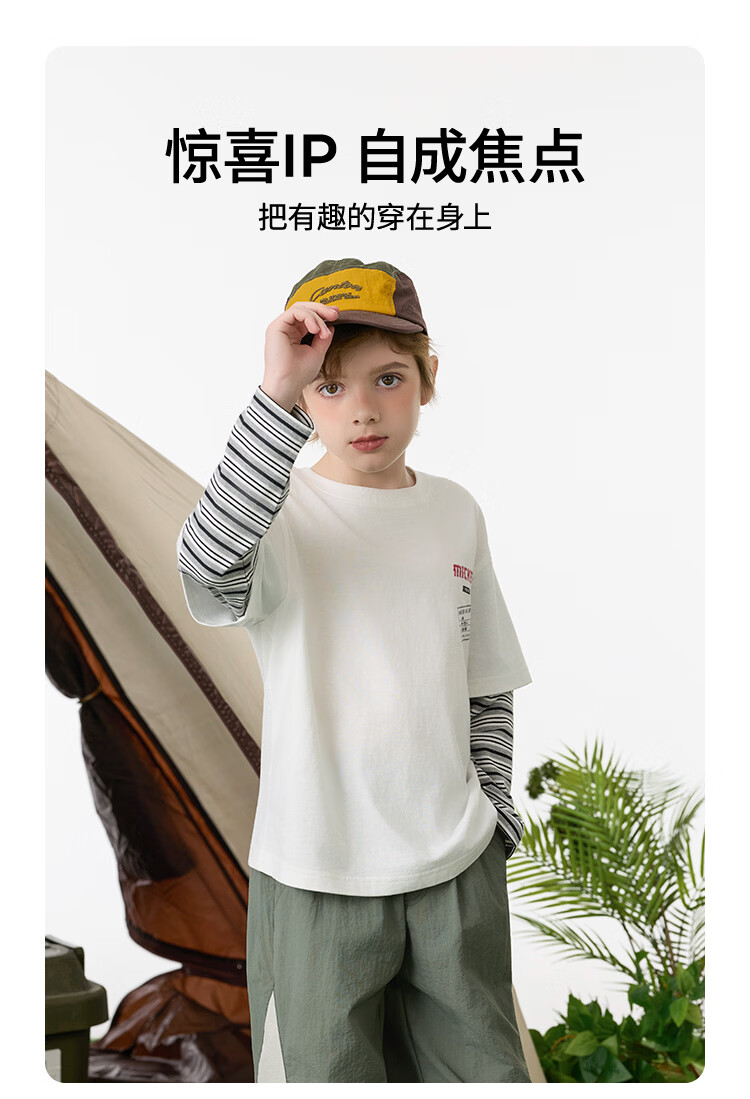 Disney (Disney) children's clothing boys fake two-piece striped long-sleeved T-shirt 2026 spring and autumn new children's round neck fashionable bottoming top trendy white trendy fake two-piece T-shirt 160