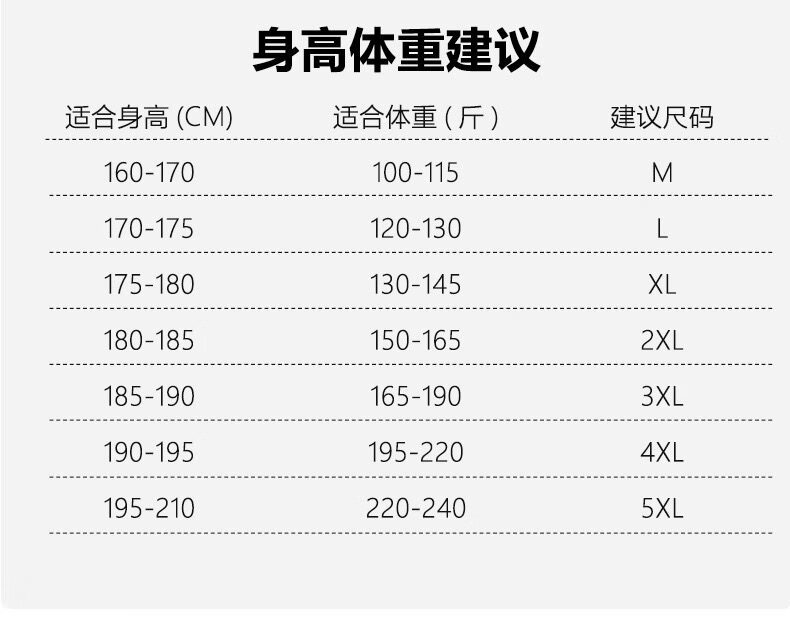 China (cm) 165 / 88-90 170 / 96-98 175 / 108-110 180 / 118-122 185 / 126-130