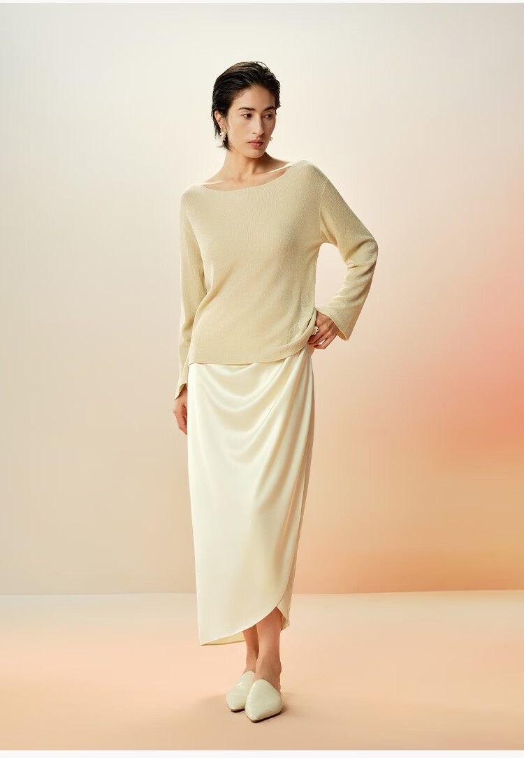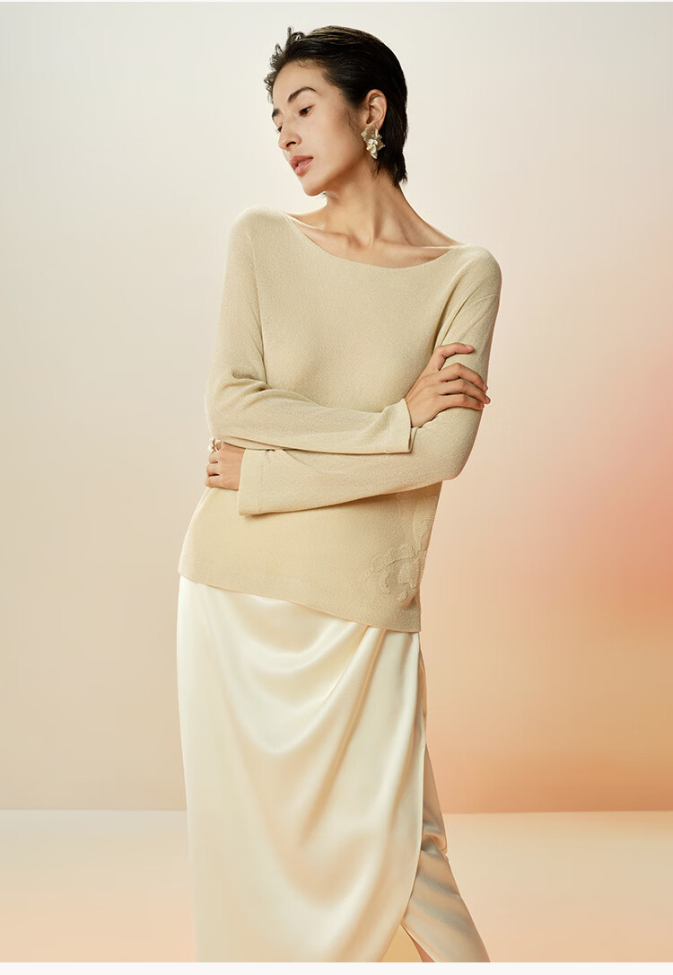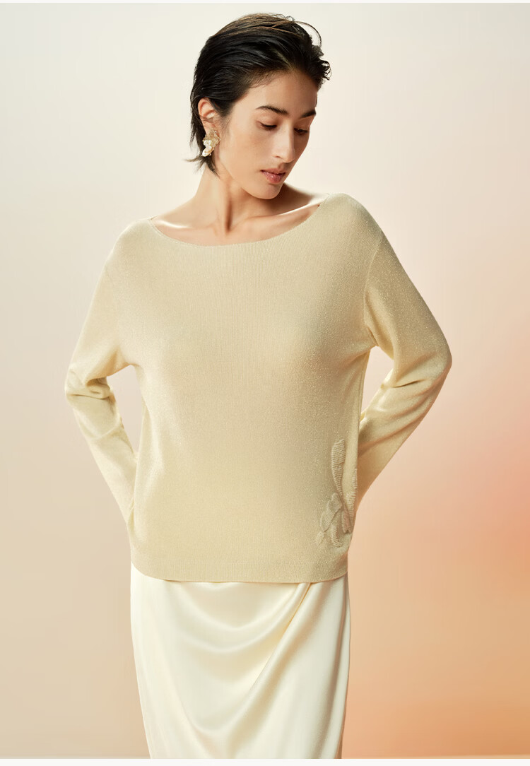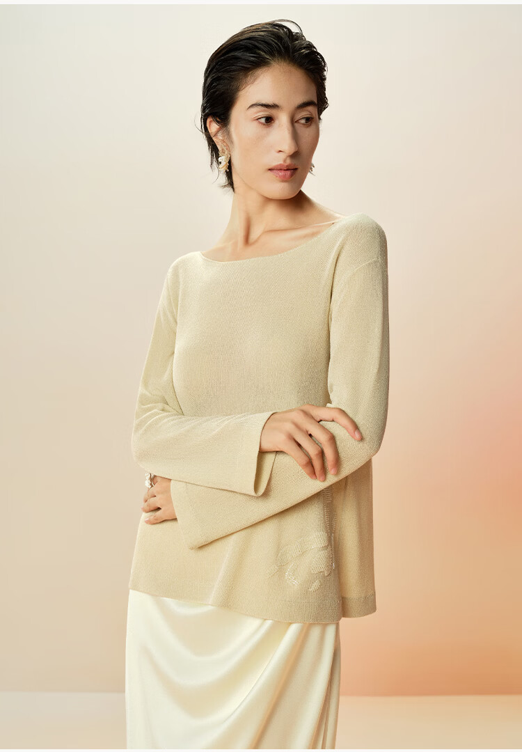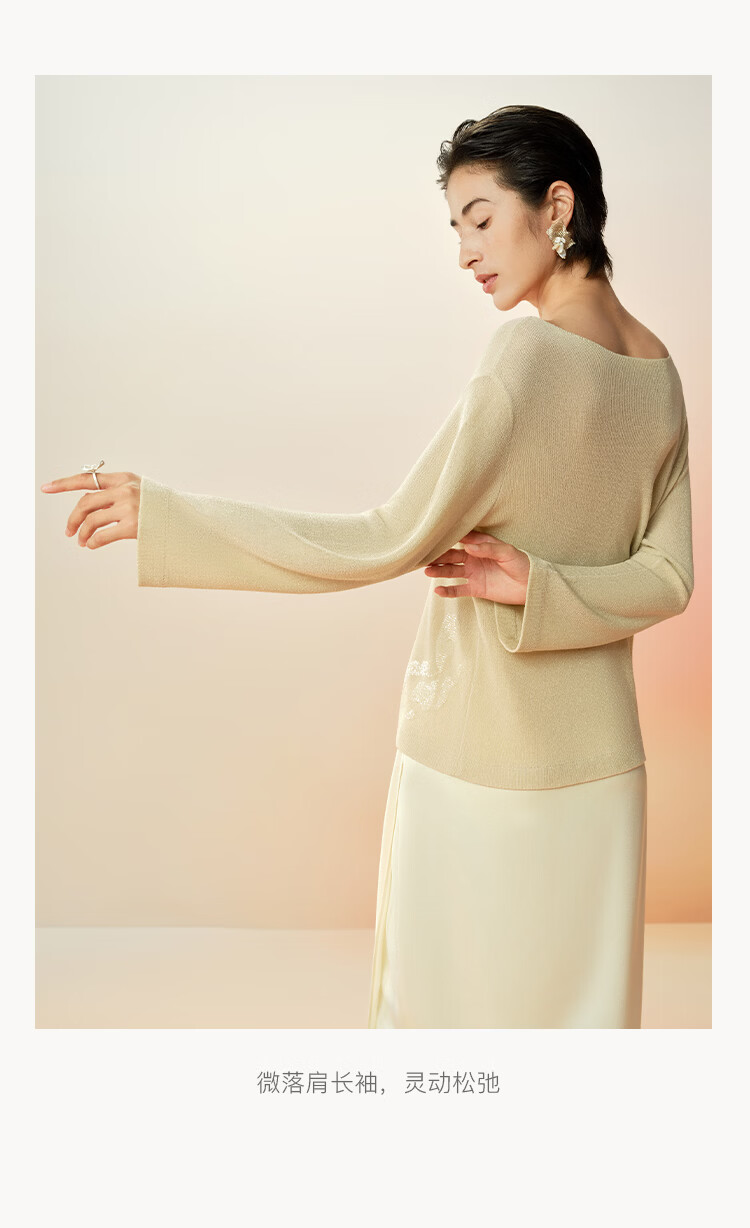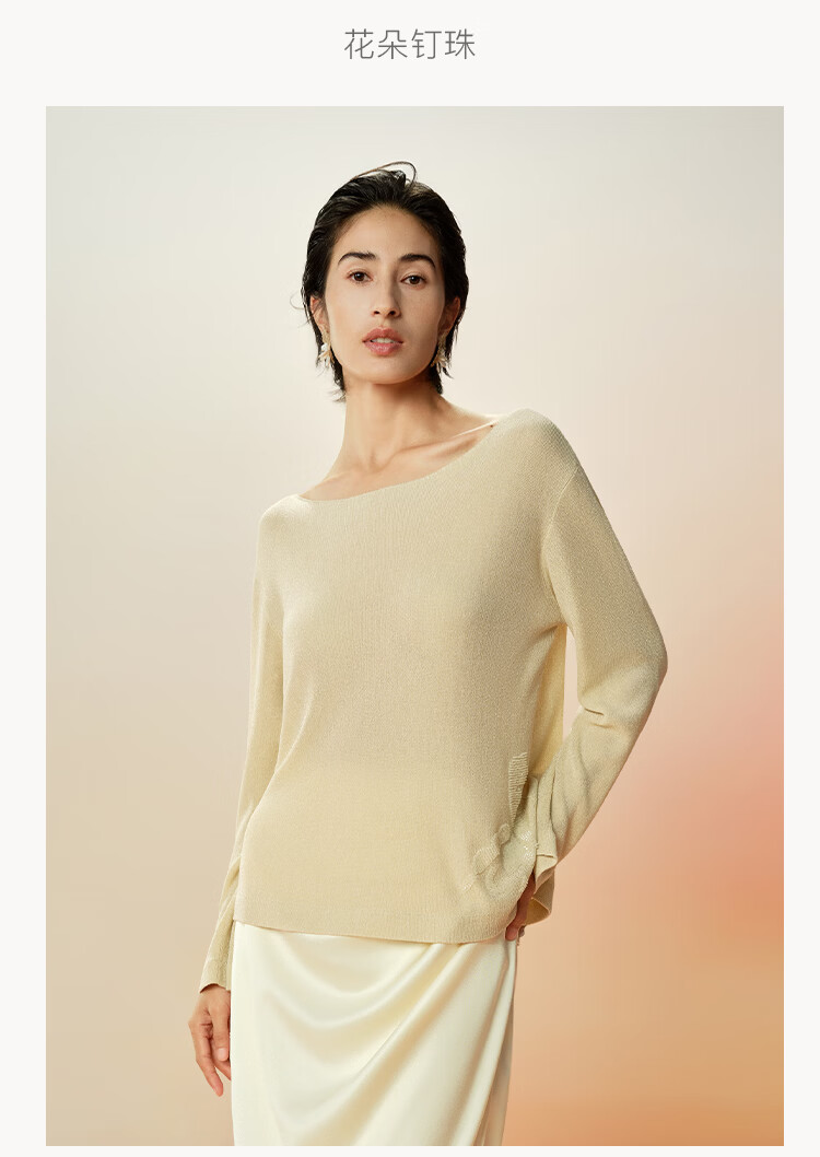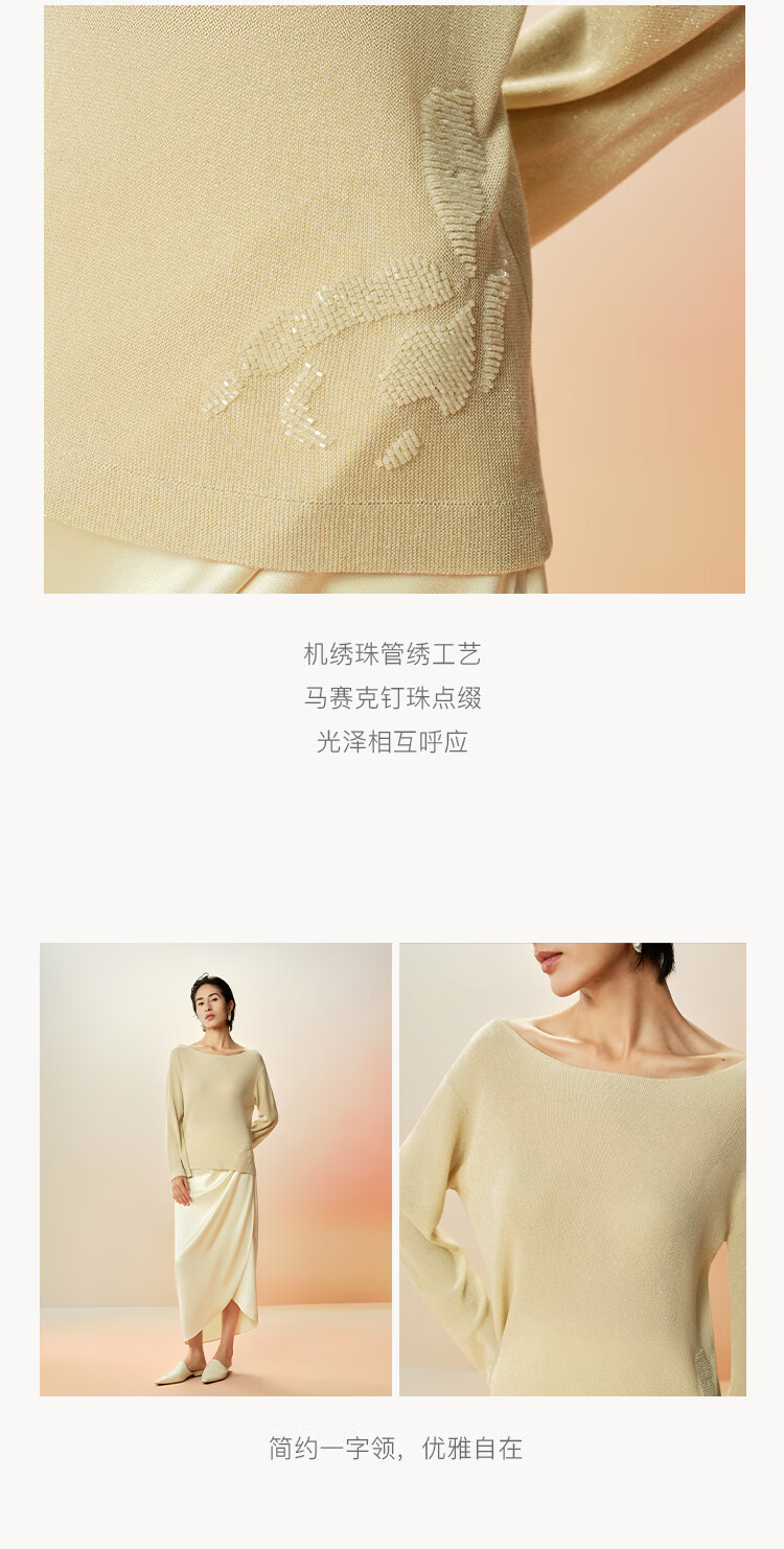 Maohe temperament bead tube embroidery sweater 2026 spring new one-line collar blouse 26MH61108 light moss yellow S