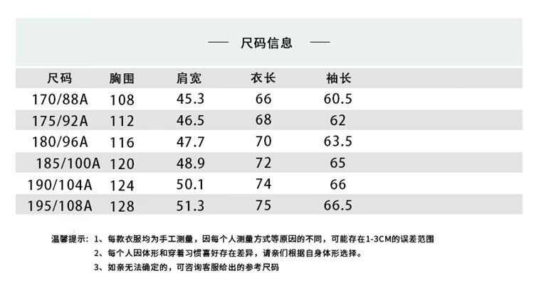 China (cm) 165 / 88-90 170 / 96-98 175 / 108-110 180 / 118-122 185 / 126-130