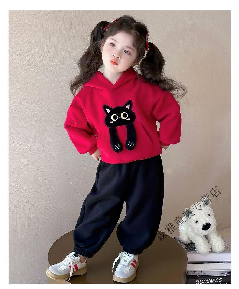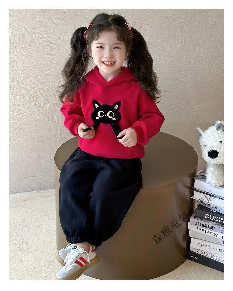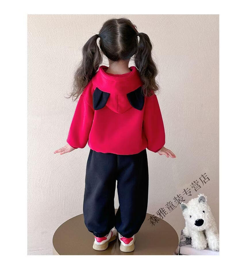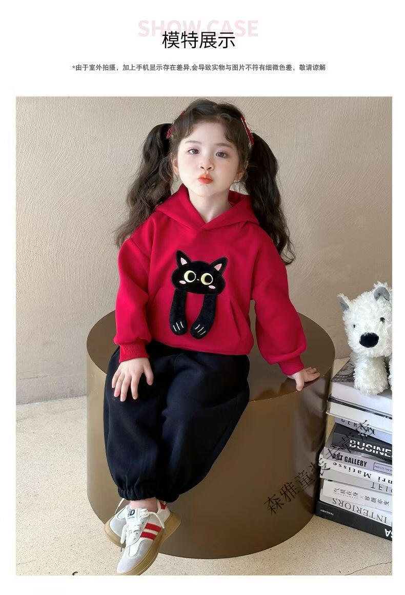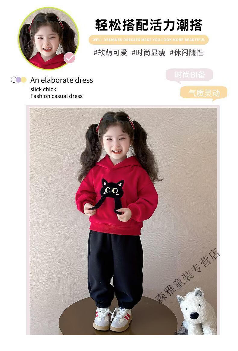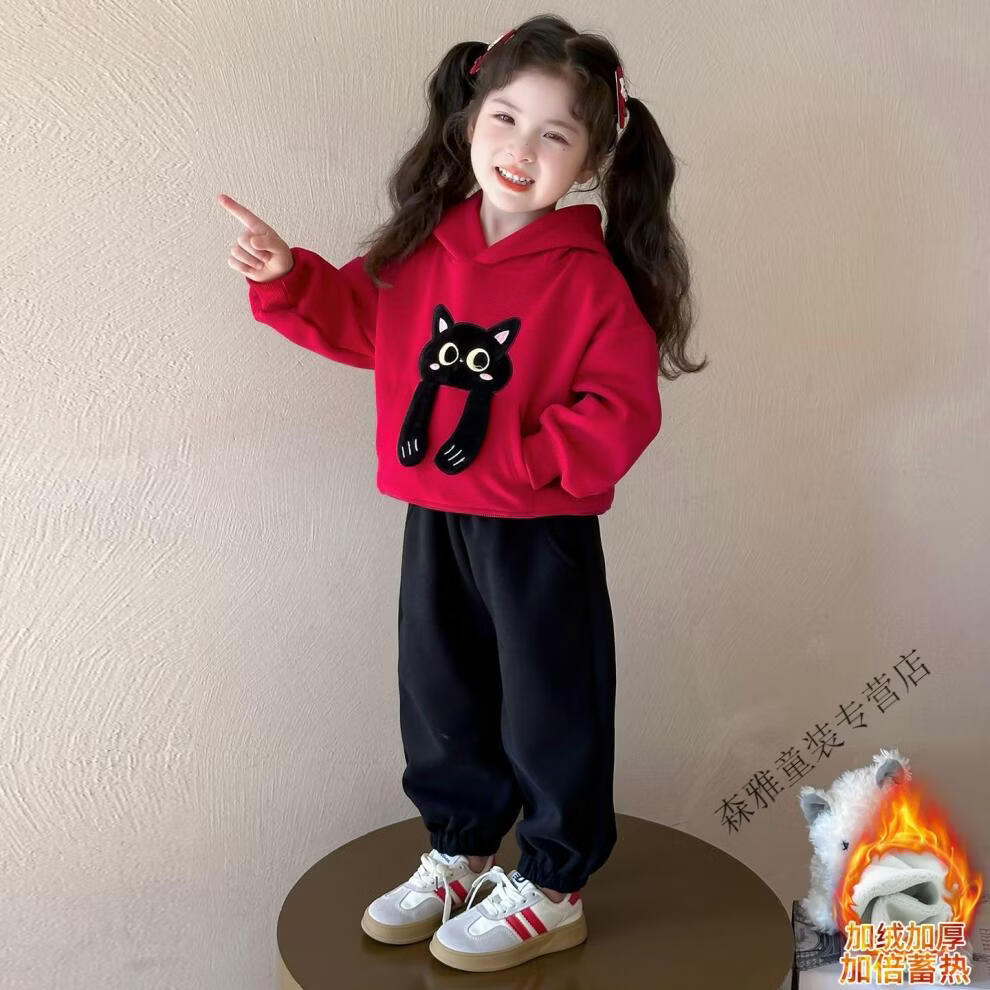 Mumuwu Girls' Velvet Autumn and Winter Clothes 2026 New Children's Casual Hooded Sweatshirt Cute Baby Thickened Warm Two-piece Set Red 90