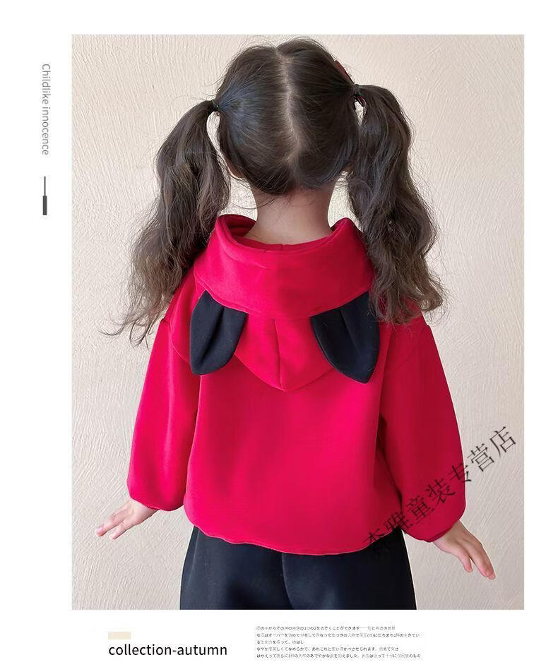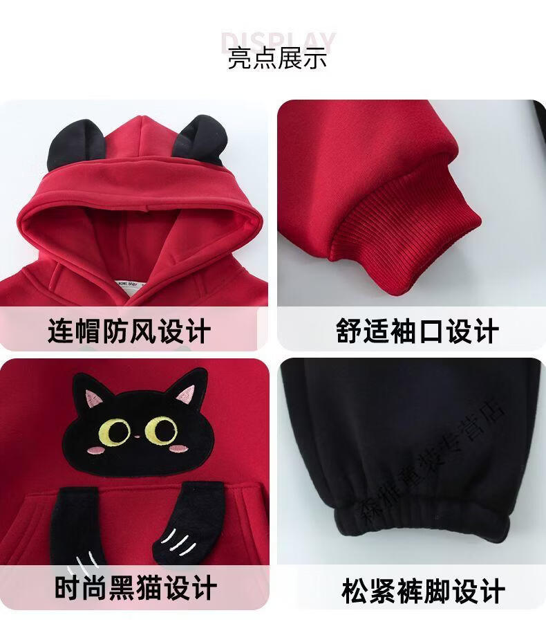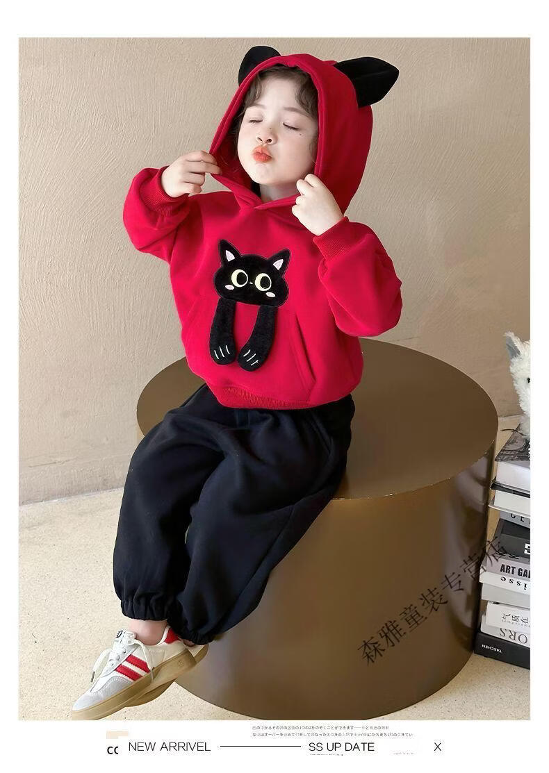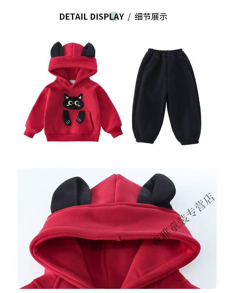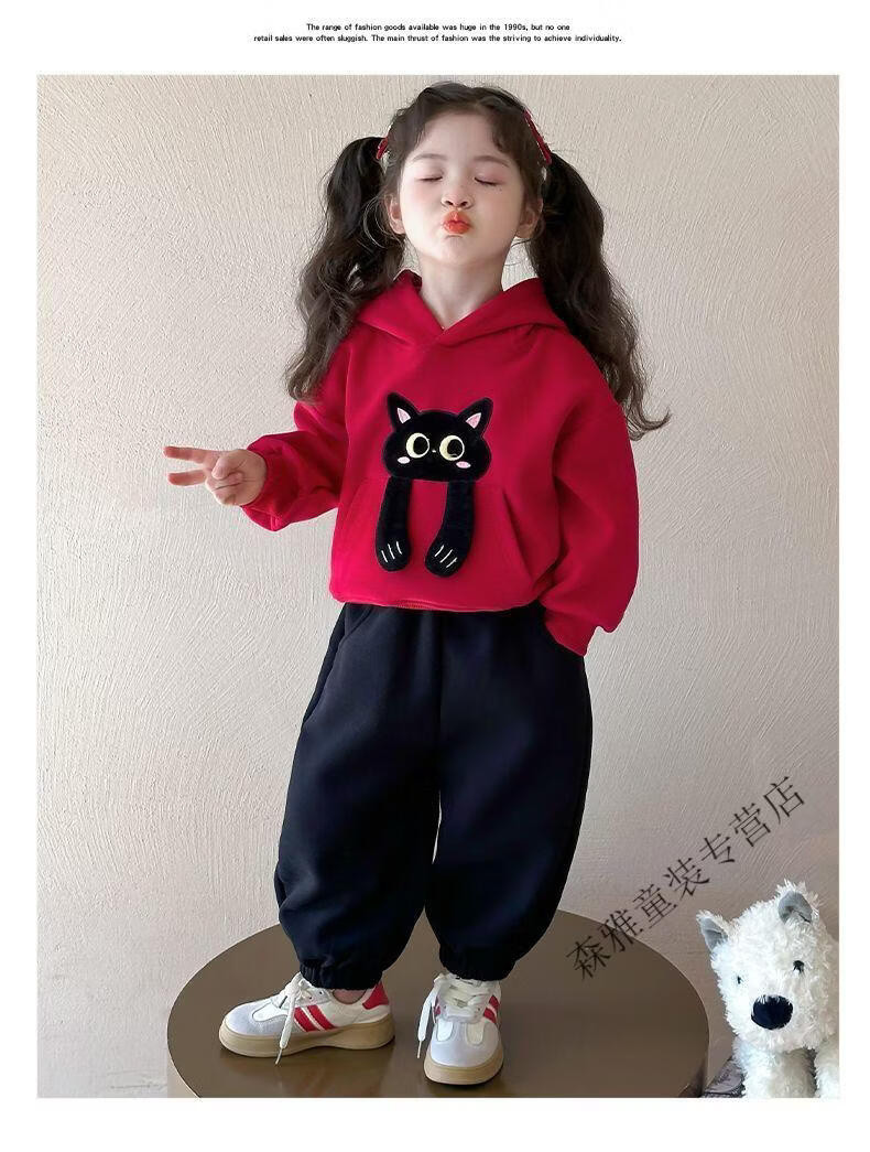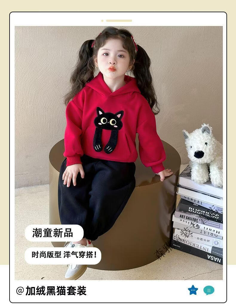 Mumuwu Girls' Velvet Autumn and Winter Clothes 2026 New Children's Casual Hooded Sweatshirt Cute Baby Thickened Warm Two-piece Set Red 90