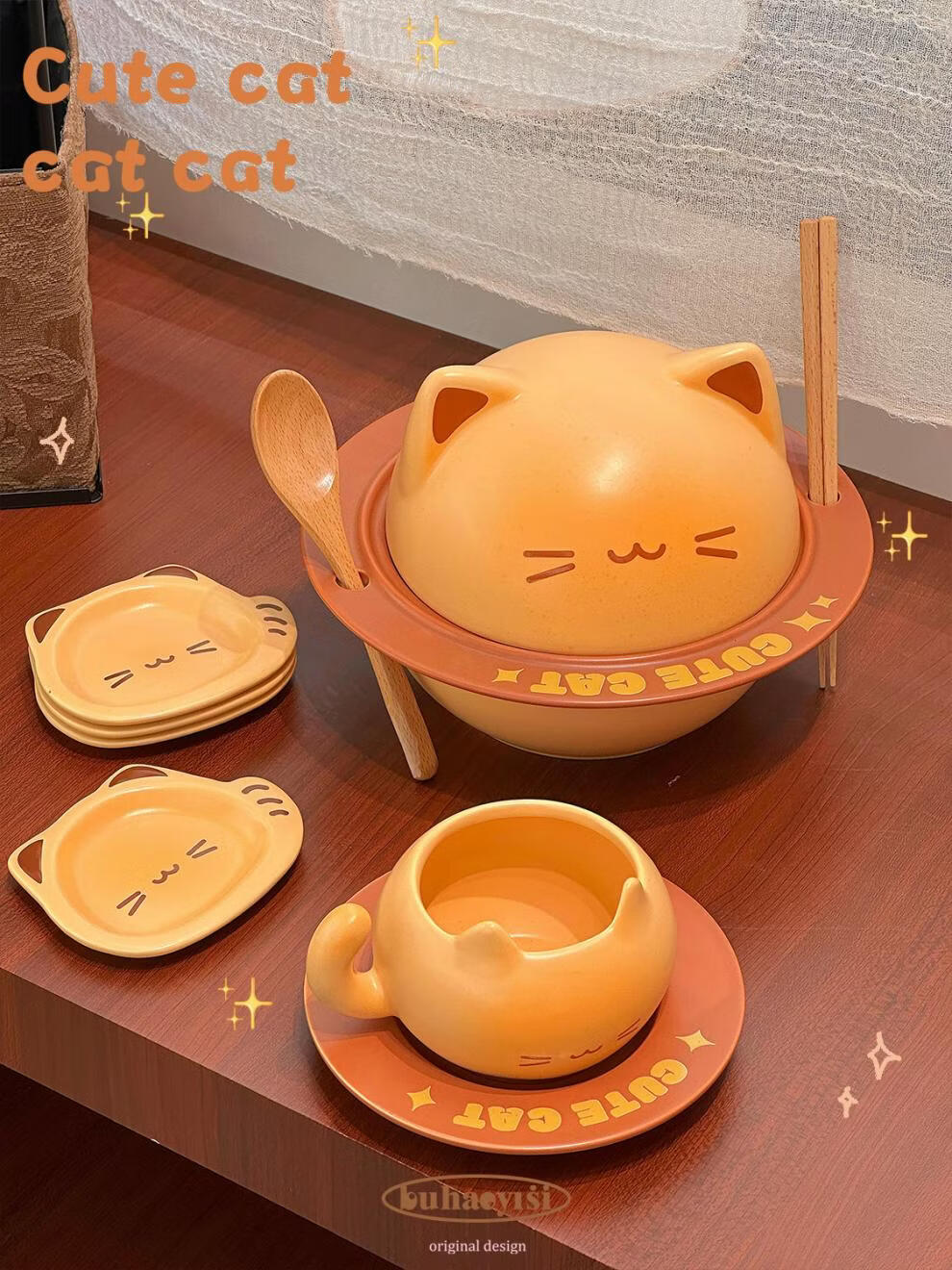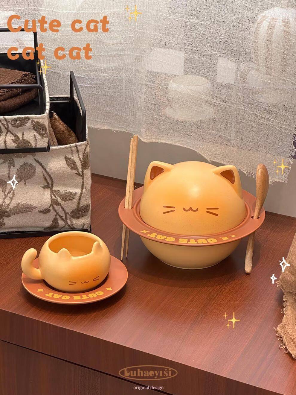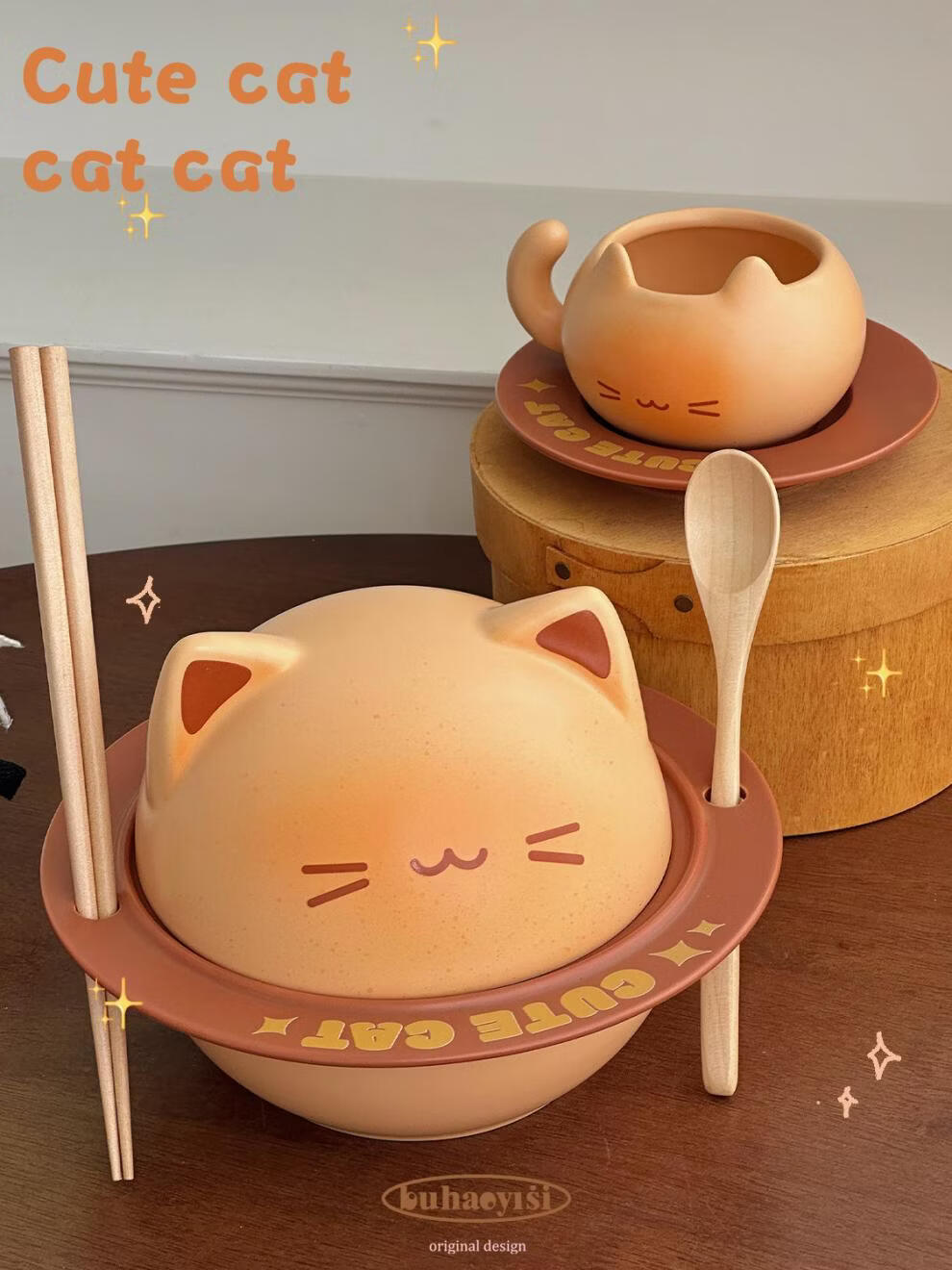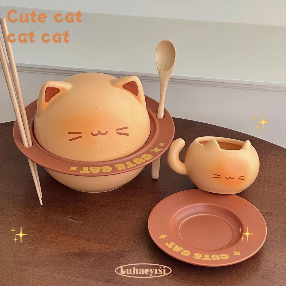 Aoyanlai cute kitten instant noodle bowl coffee cup and saucer ceramic tableware set for student dormitory moving birthday gift cat instant noodle bowl_come with chopsticks and spoon