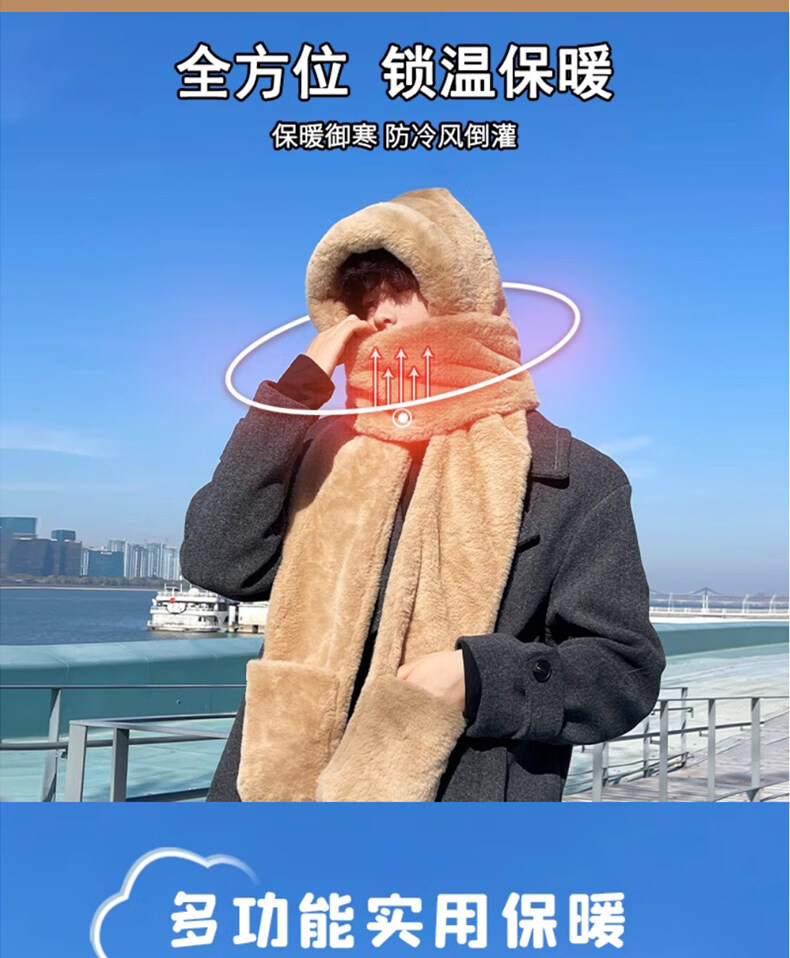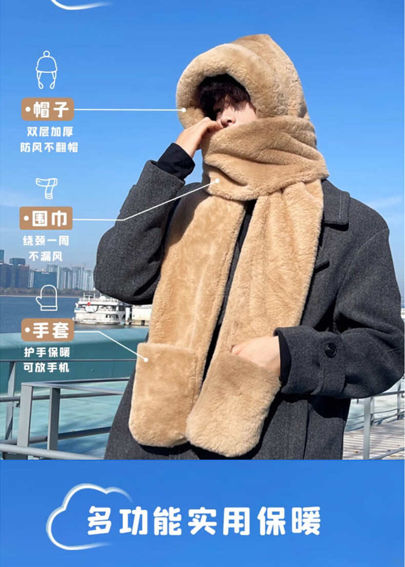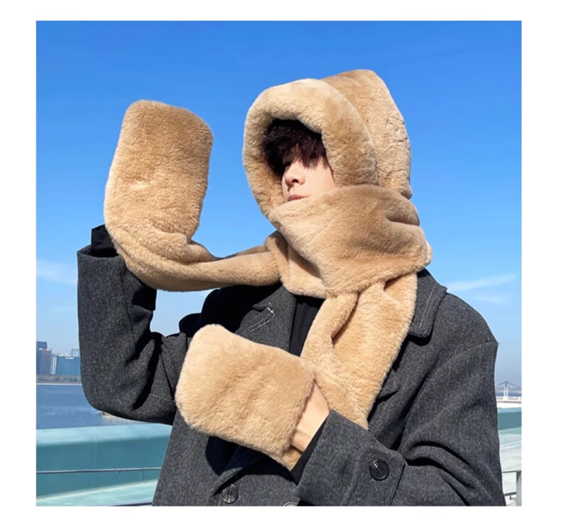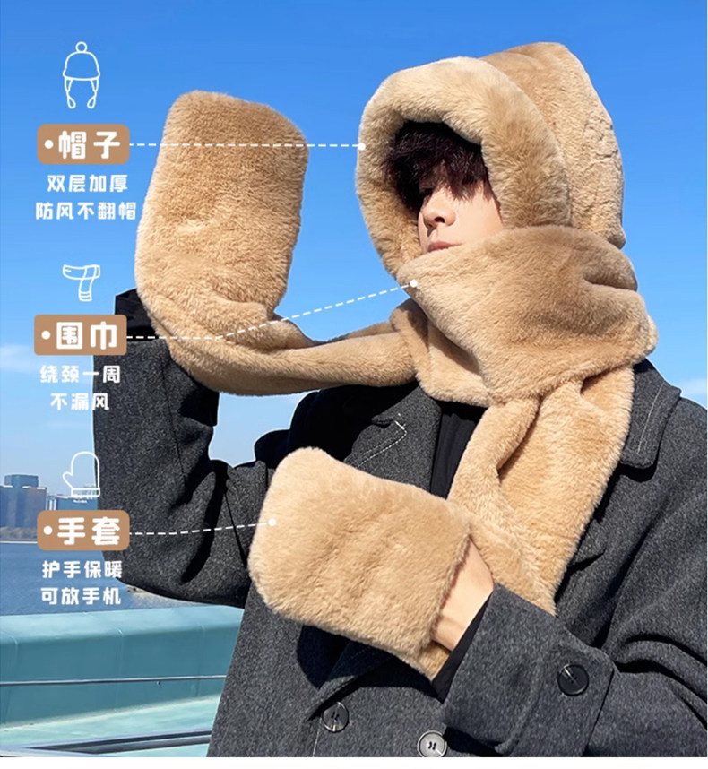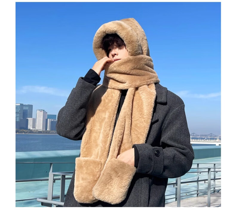 Viney hat men's autumn and winter scarf gloves one-piece three-piece set men's warm plush windproof scarf hooded man's brown coffee birthday gift for girlfriend, wife, Valentine's Day, girlfriend 3.8 Goddess' Day