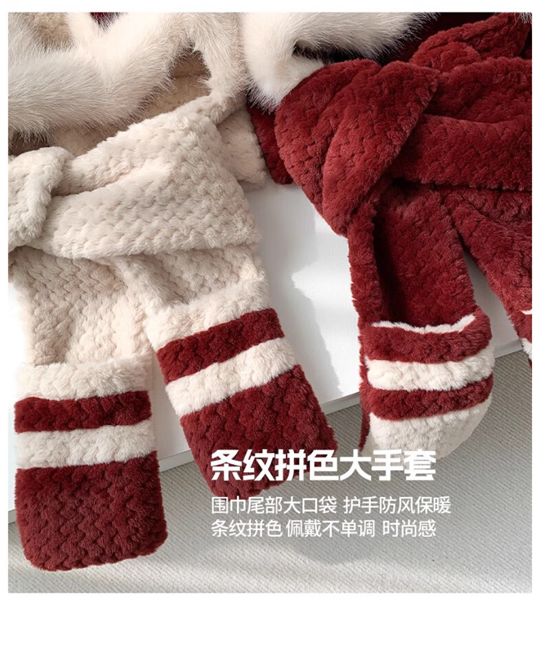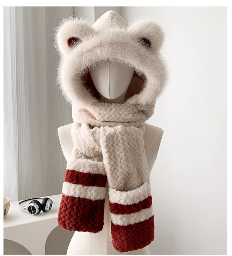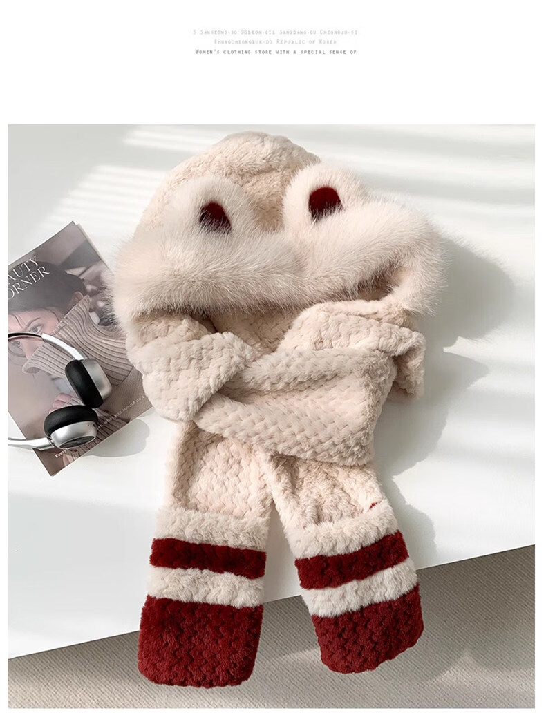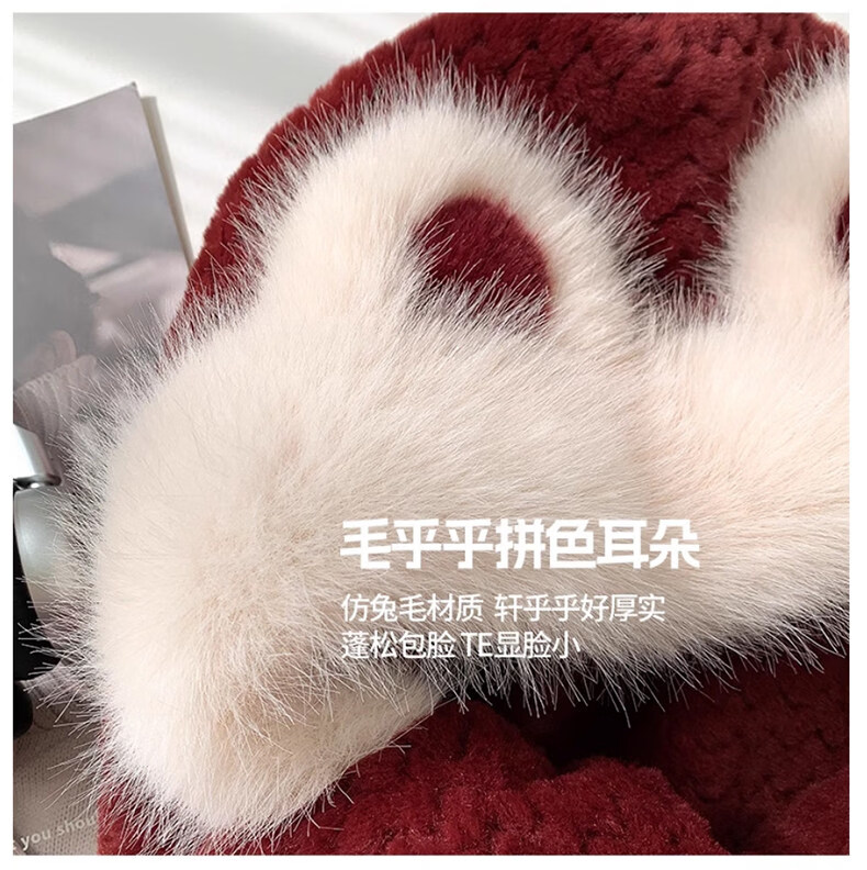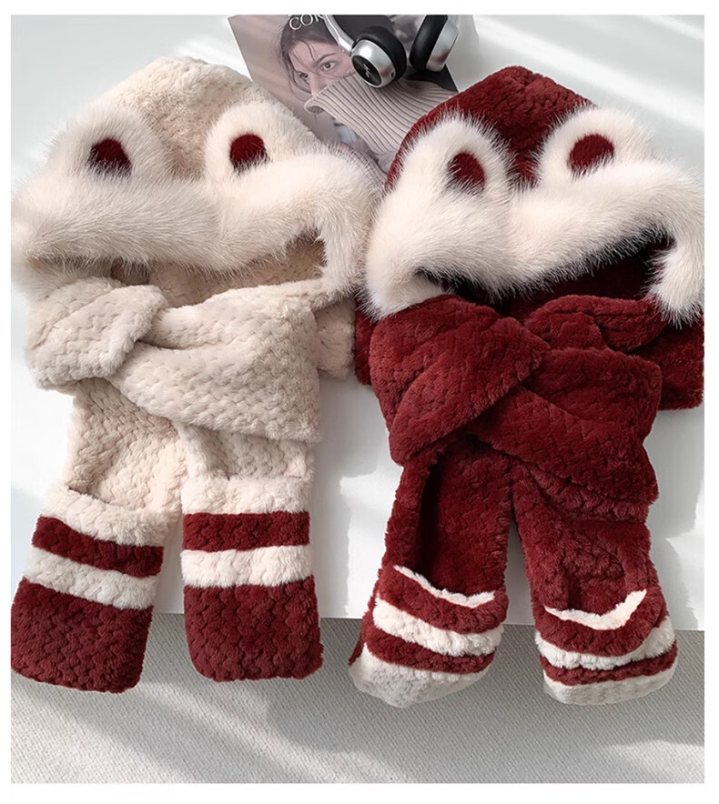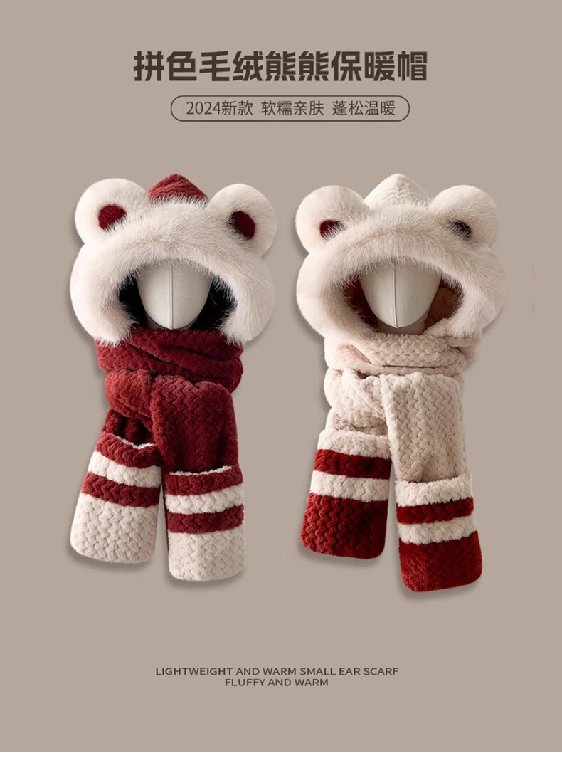 Viney hat scarf gloves all-in-one women's 2025 new winter bear plush thickened warm ear protection cycling hat Ancora red one size