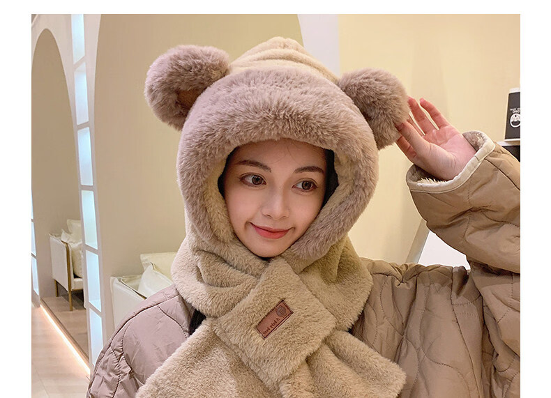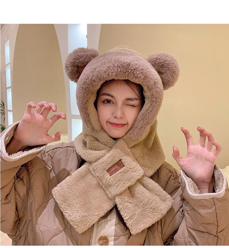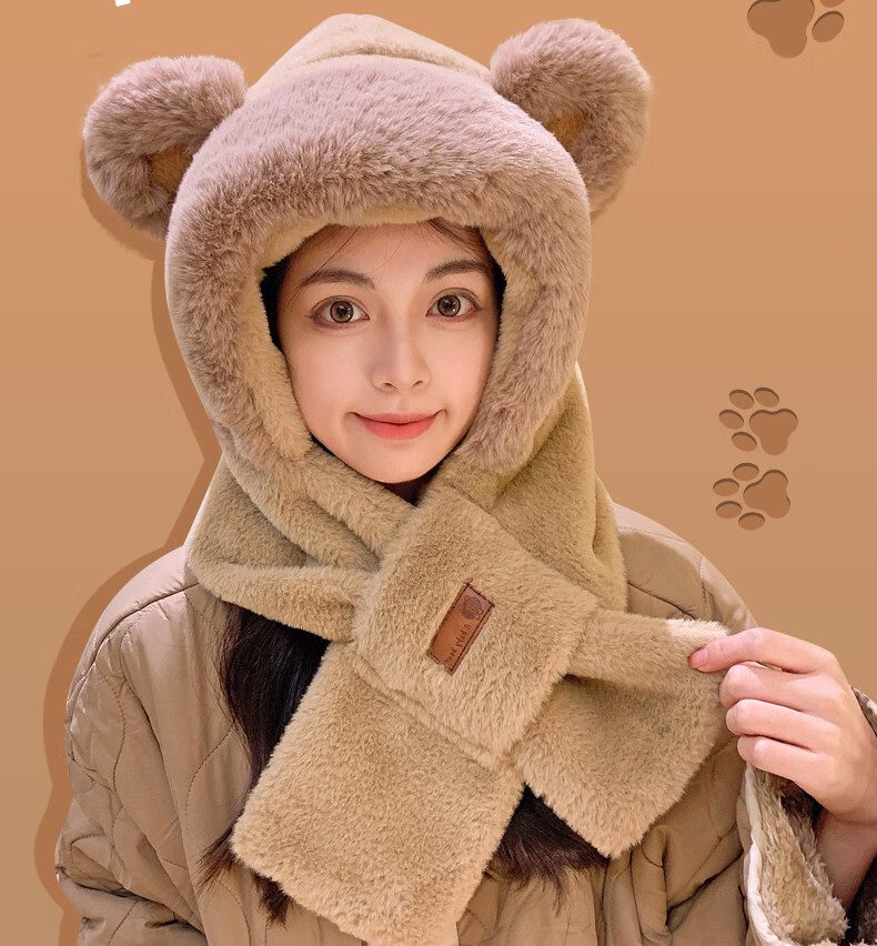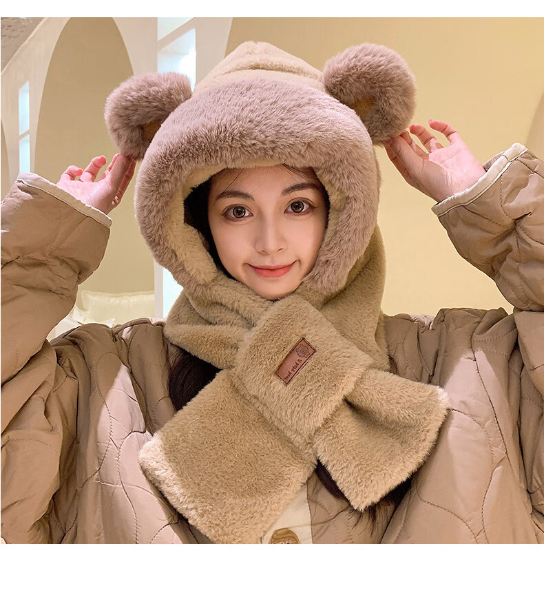 Viney scarf for women winter 2025 new plush cute bear hat one-piece gloves hooded neck scarf to keep warm camel Camel birthday gift for girlfriend wife Valentine's Day girlfriend 3.8 Goddess Day women one size