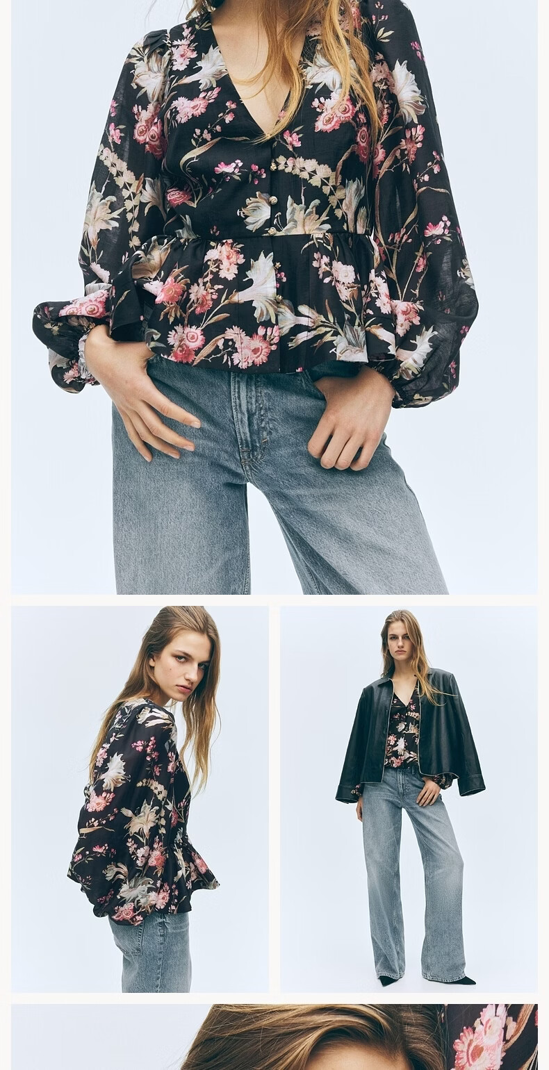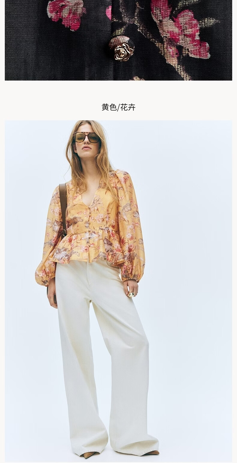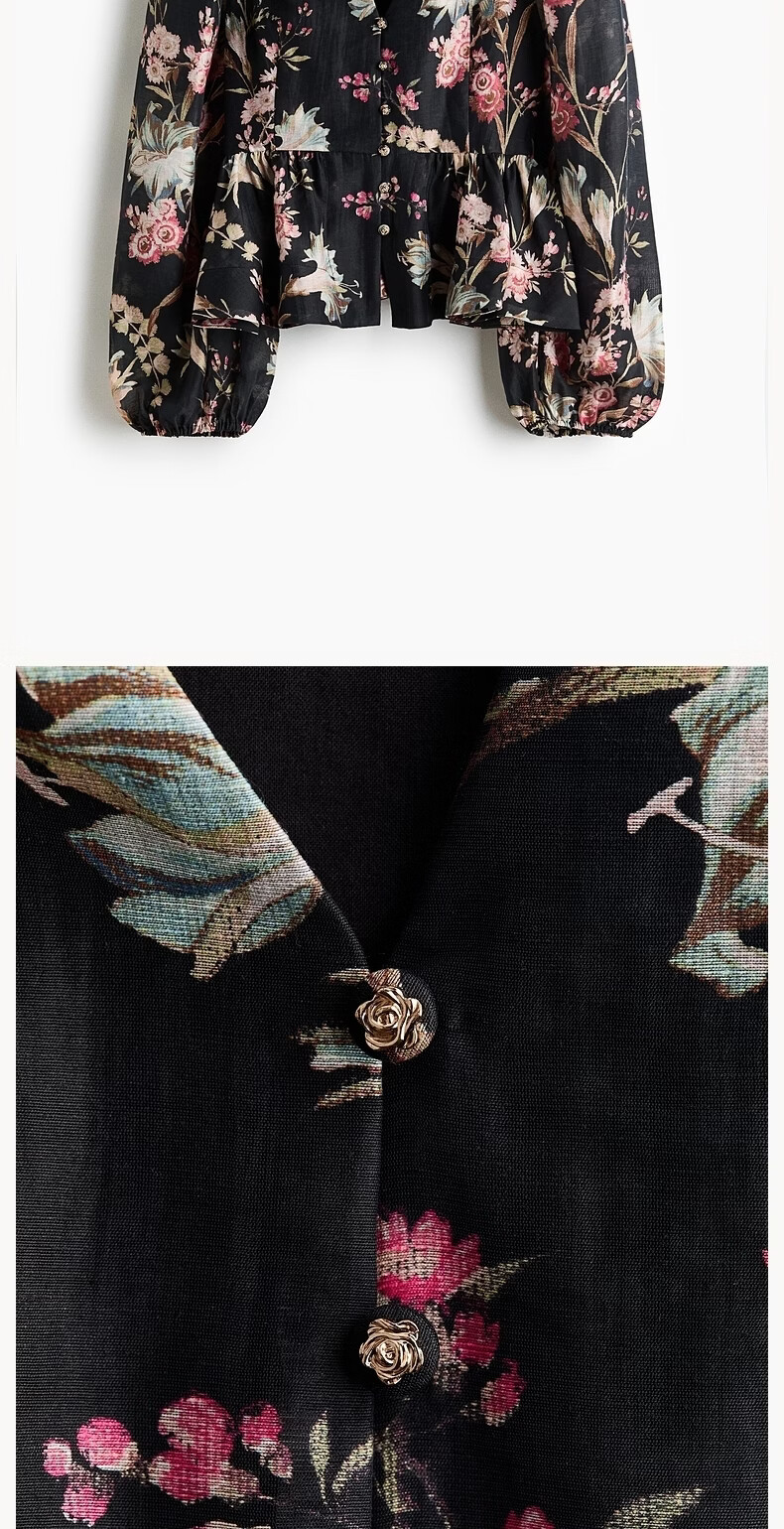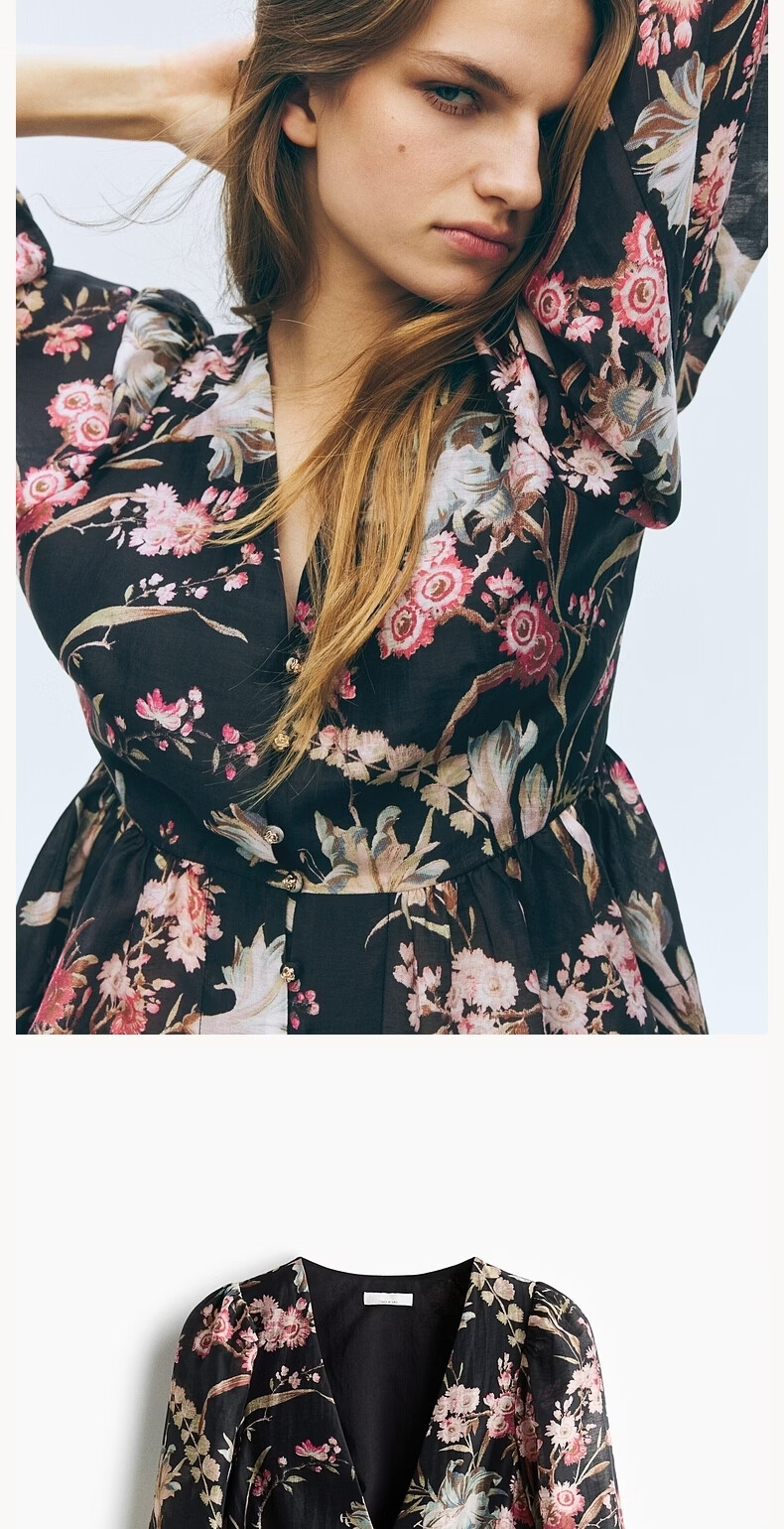 H&M2026 Spring New Women's Linen Blended Skirt Hem Top 1321285 Black/Floral XS 155/80