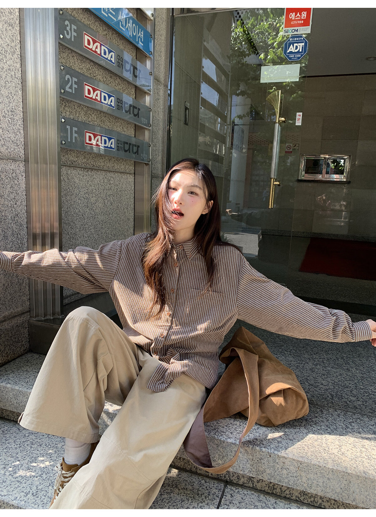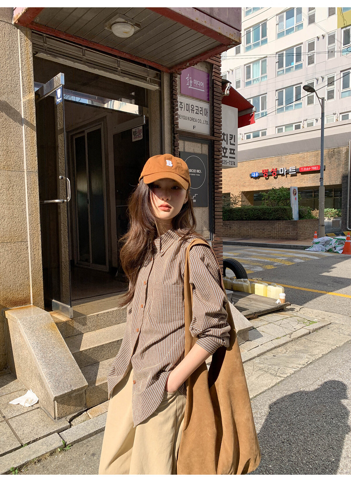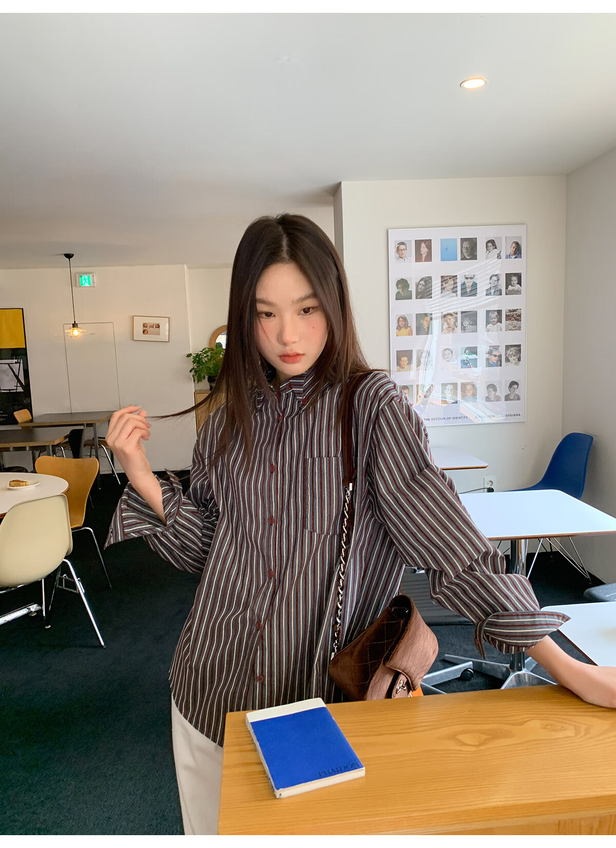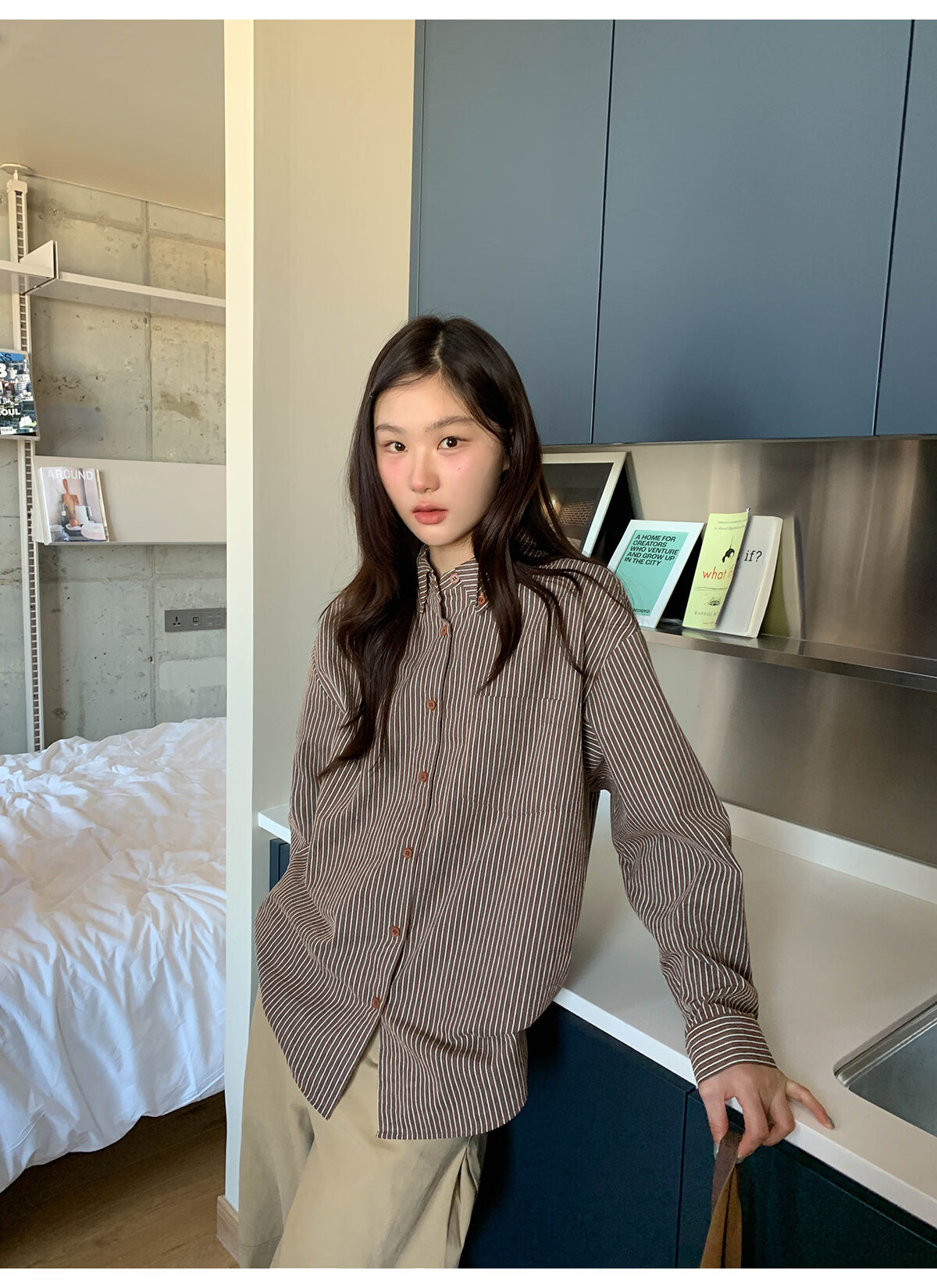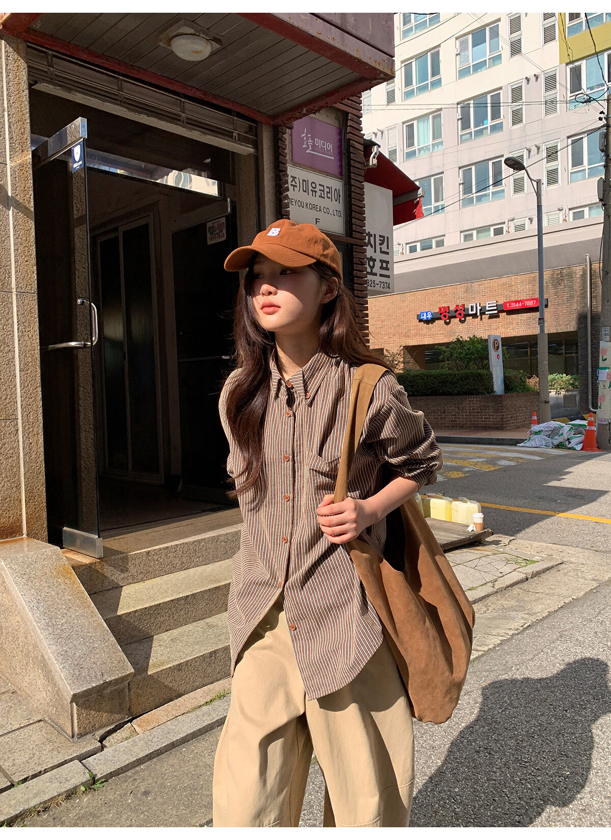 Hello Canon Striped texture design lapel shirt women's autumn and winter 202 new retro Korean style casual shirt brown XS
