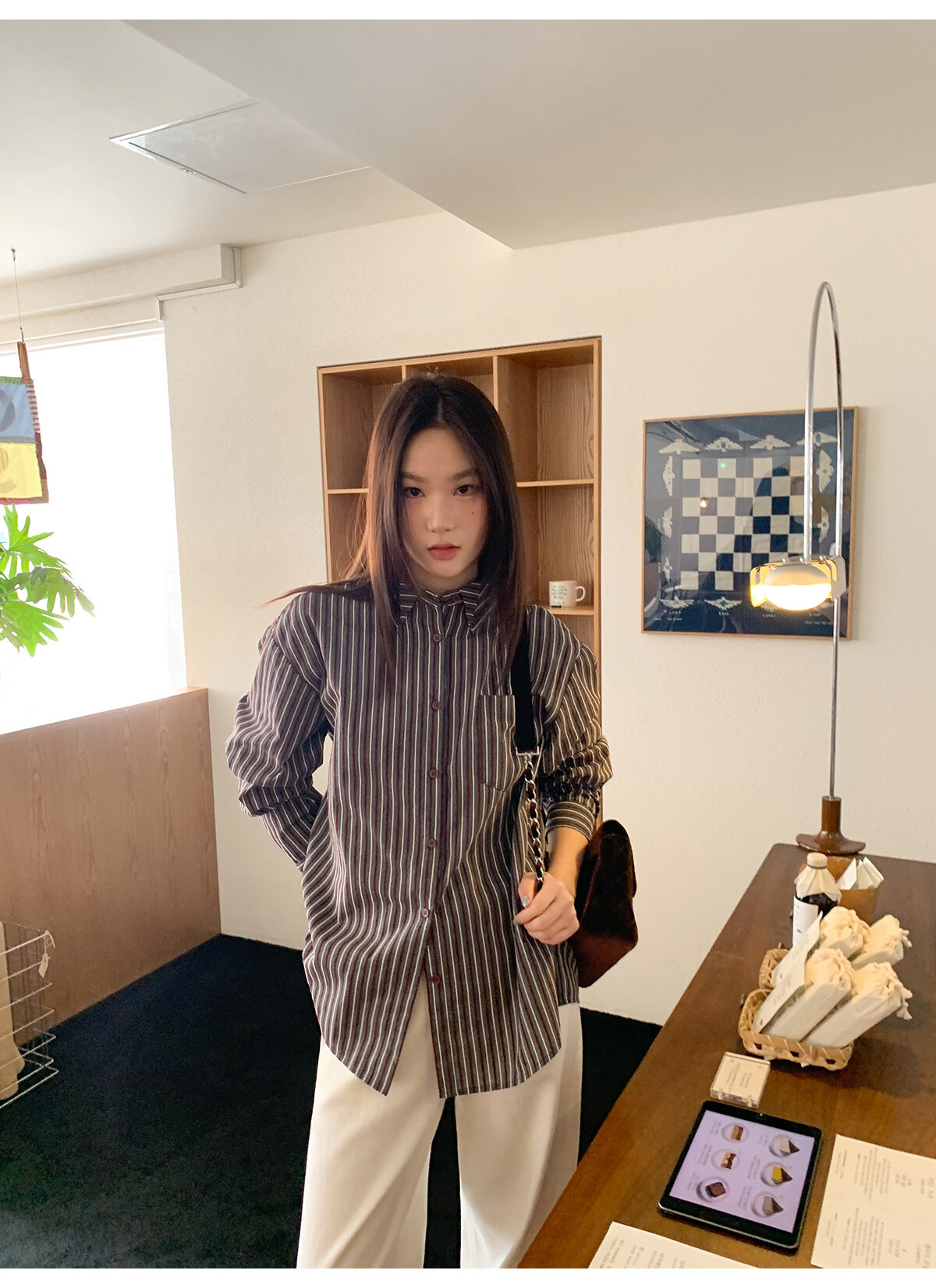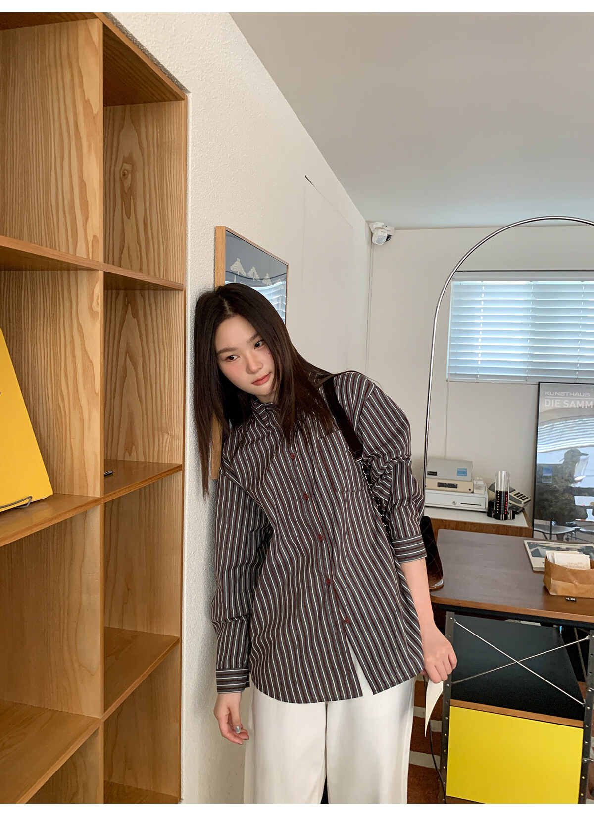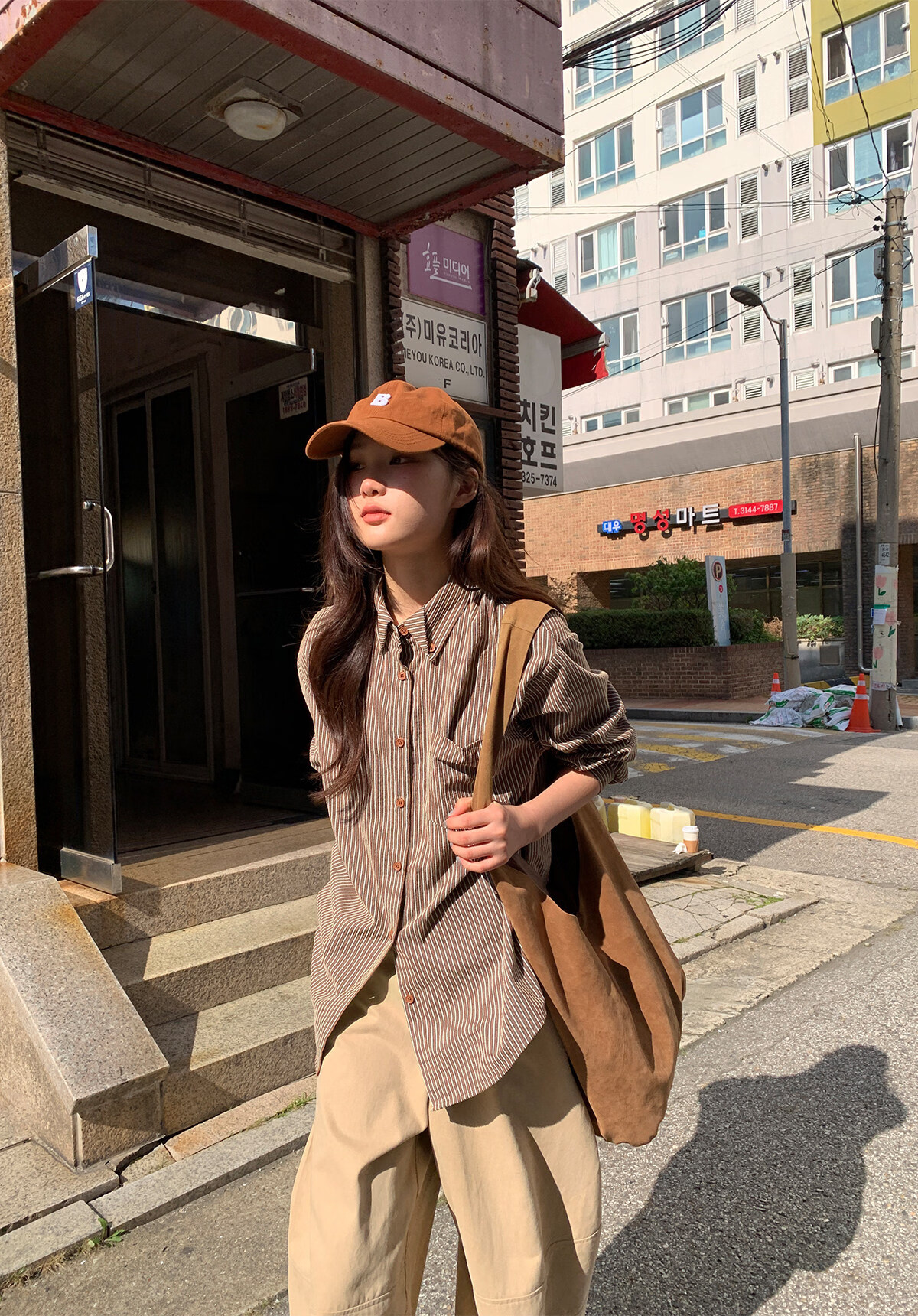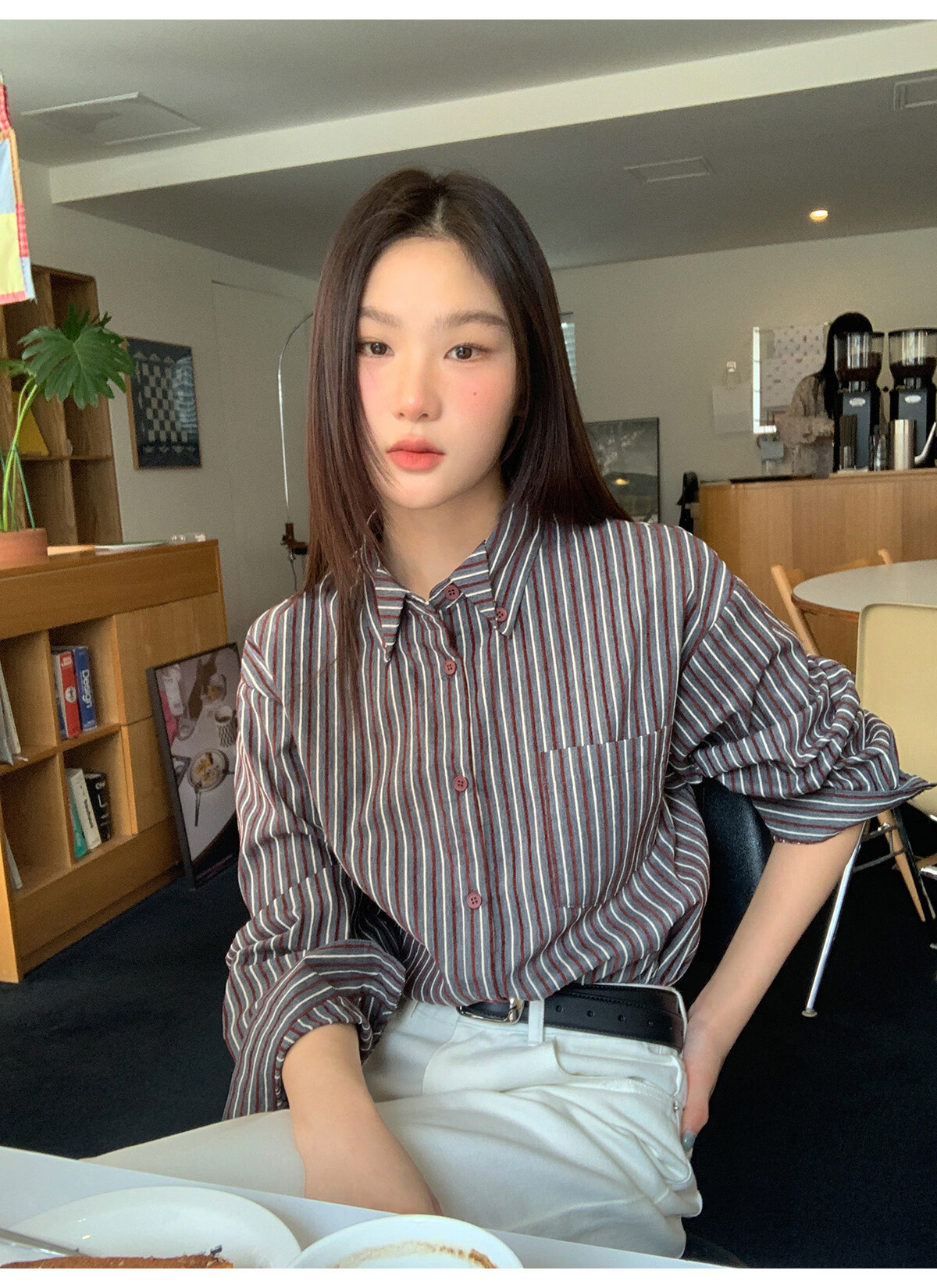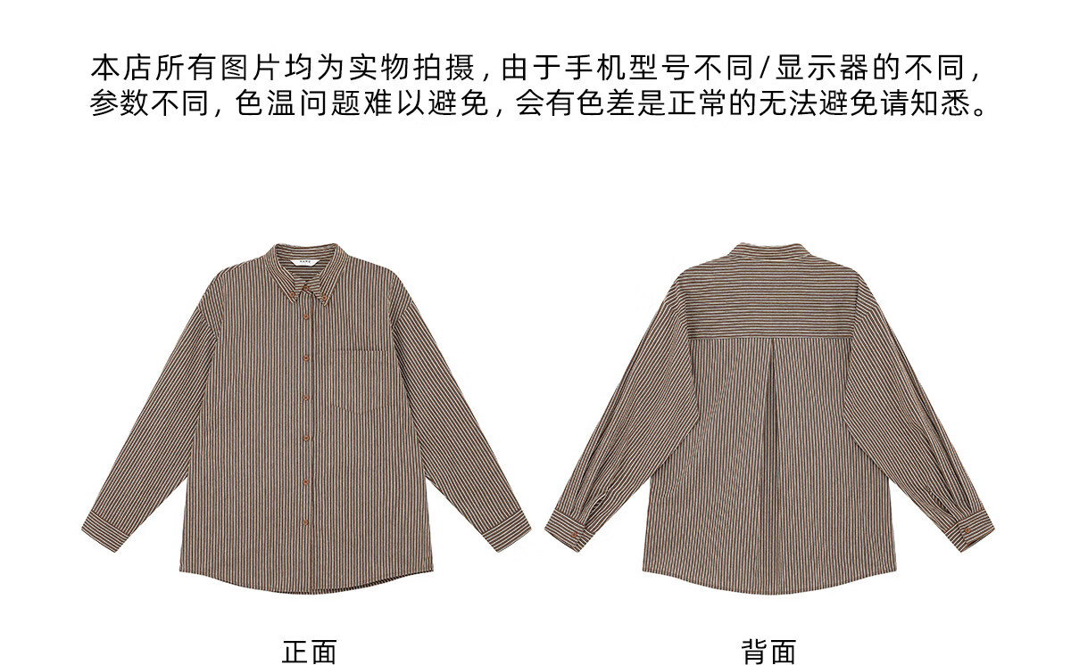 Hello Canon Striped texture design lapel shirt women's autumn and winter 202 new retro Korean style casual shirt brown XS