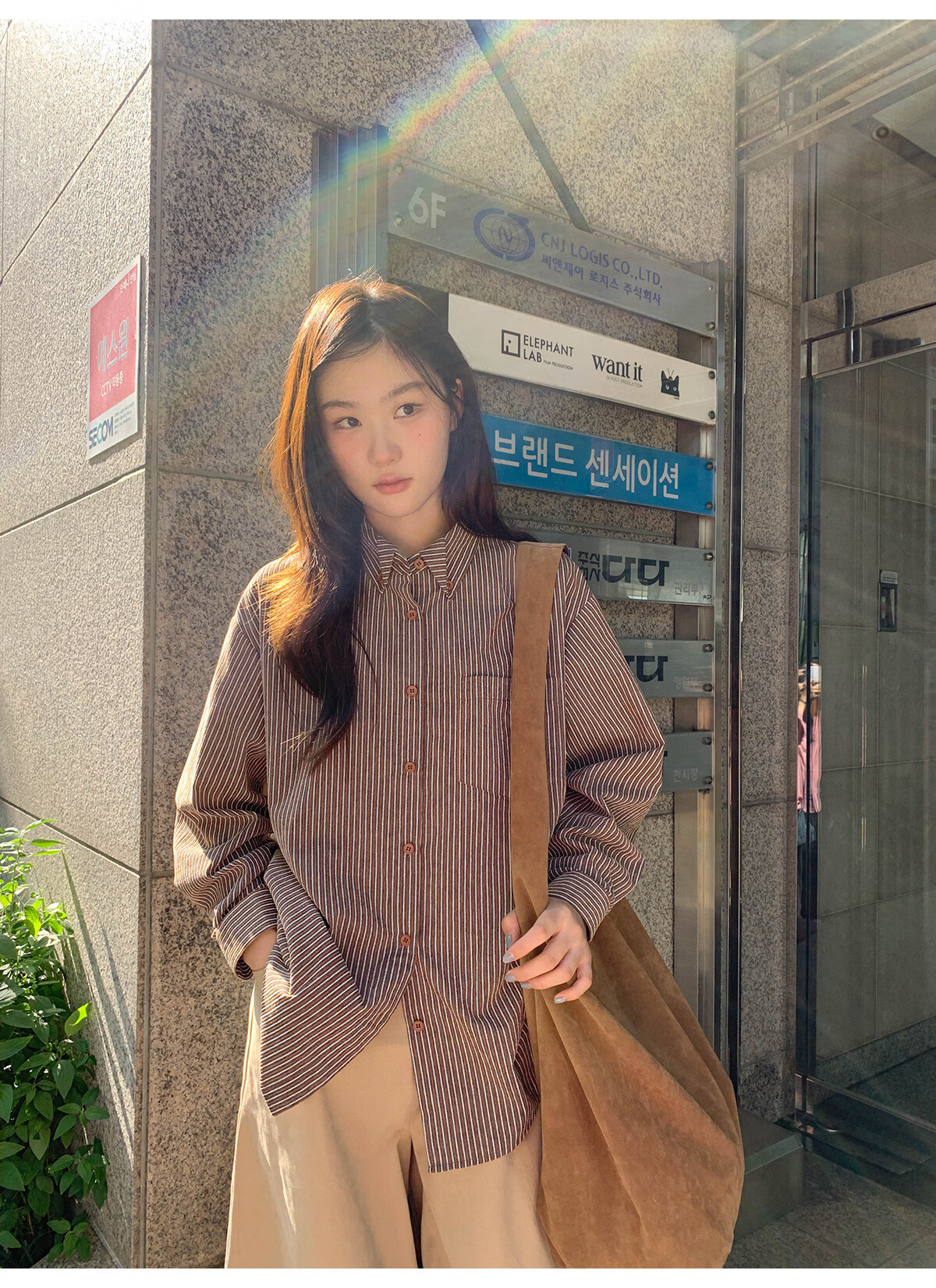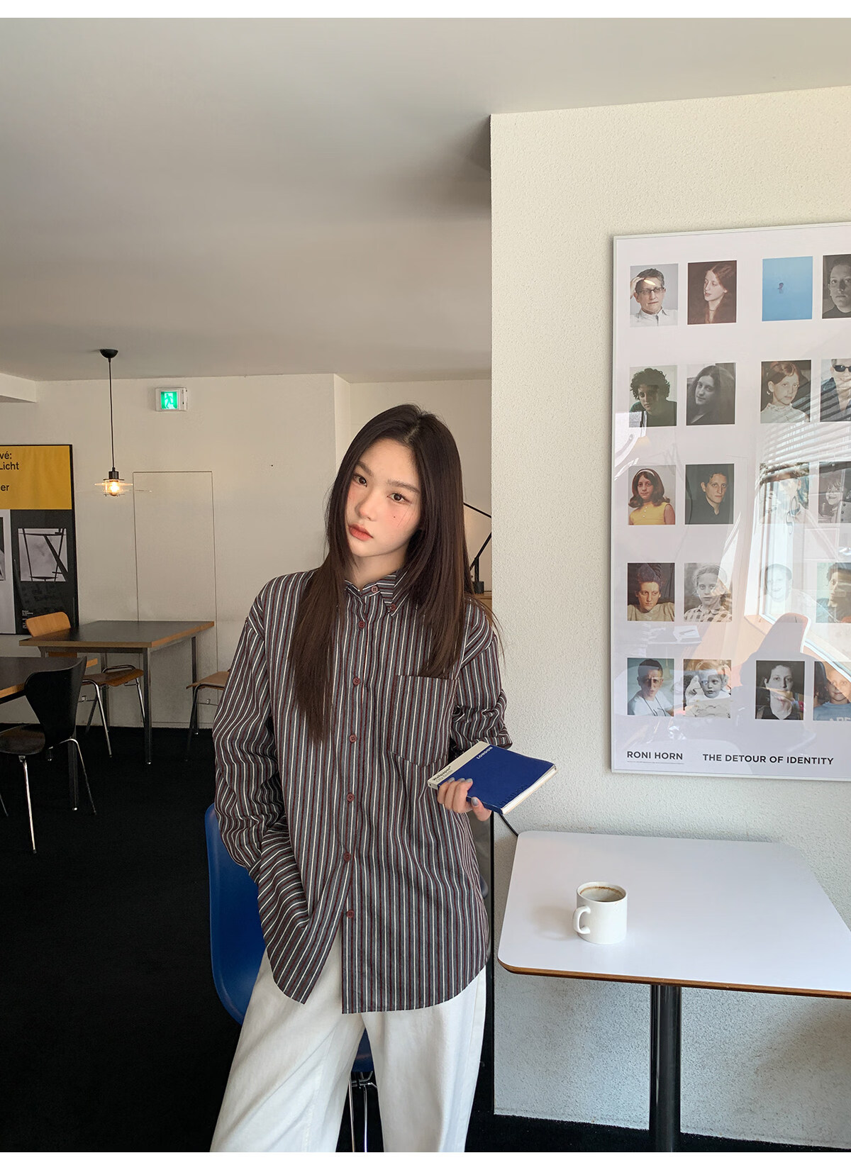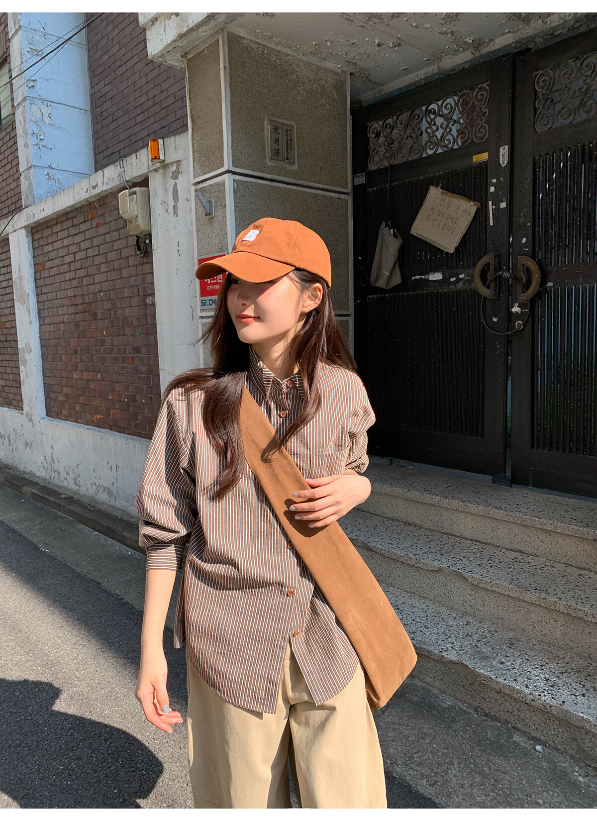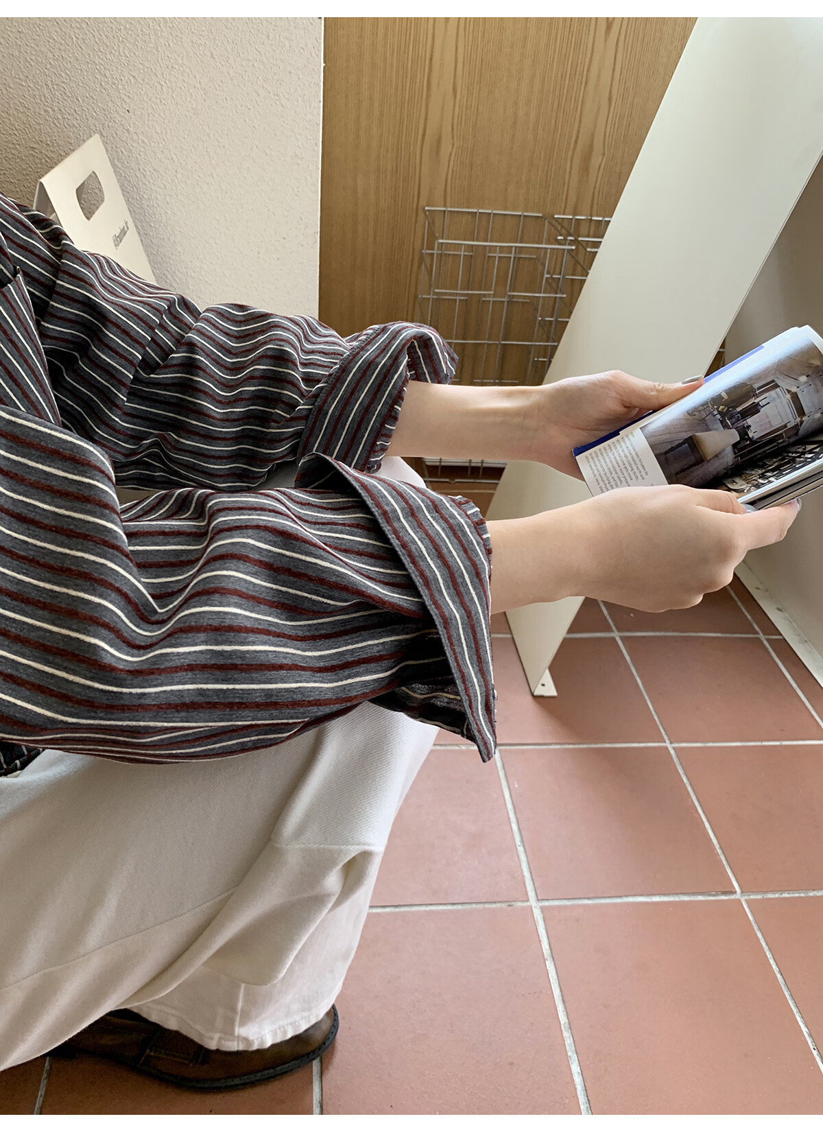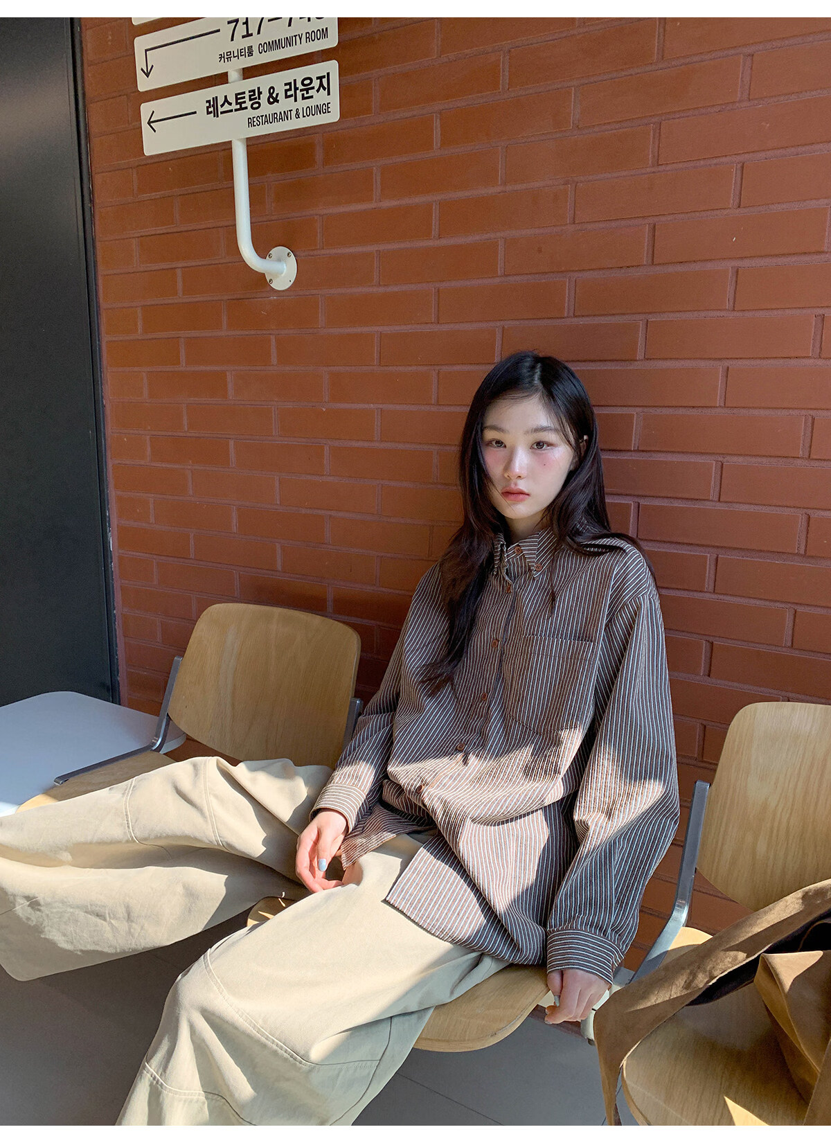 Hello Canon Striped texture design lapel shirt women's autumn and winter 202 new retro Korean style casual shirt brown XS